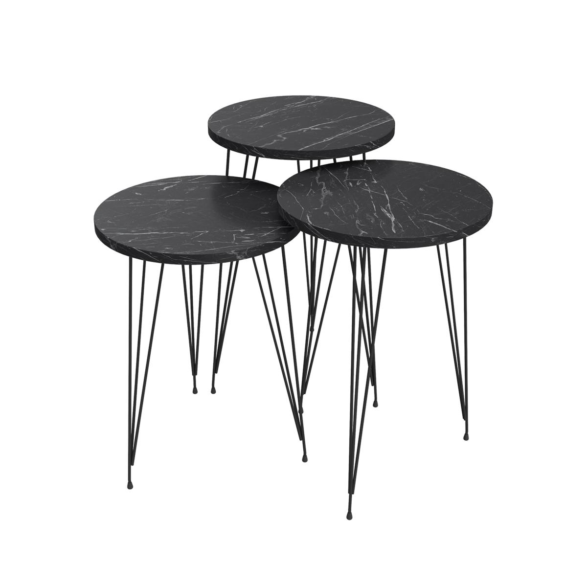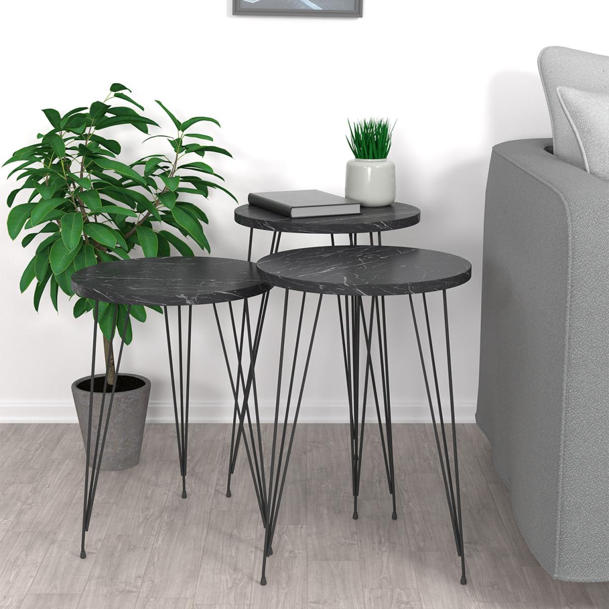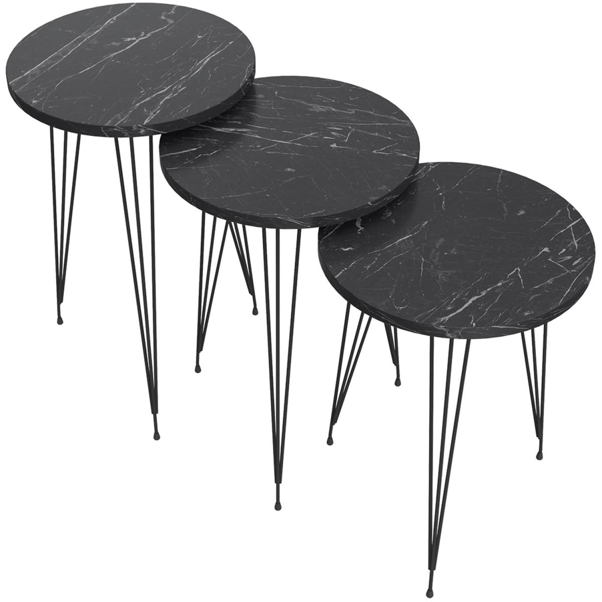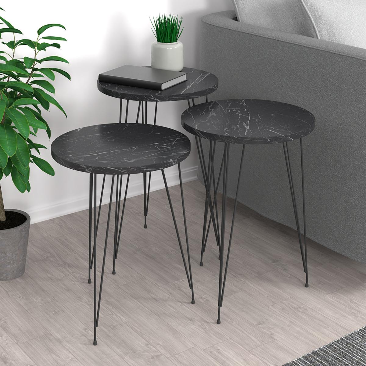 Bring a streamlined modern style to your seating ensemble with this retro side table. The set includes 3 nesting tables which are ideal for using separately or stack together in different occasions. However, the small table can also fit neatly under the larger table for easy storage, making this a great furniture set for a small space. They can also be used as bedside tables, side tables, end tables, round coffee tables, telephone tables or nightstands making them a versatile living room furniture set. Round design can be placed in corners to save space. Quick and easy to assemble, just screw the legs to the table tops, all you need is a screwdriver. Can be used as a set or split up and placed individually. Made with Laminated Particleboard and metal legs, looks elegant and durable. Multi-purpose End Table:Compact size, space-saving and lightweight design, this set of end tables is easy to move. Rounded edge design can prevent potential damage and injuries. Coming with a choice of black, white marble effect, these nesting tables are designed to add a contemporary feel to your home and will enhance your living room, bedroom, hallway, balcony. Nesting Tables Dimensions (h x w x l):Small: 50cmx39cmx39cm - Medium: 52cmx39cmx39cm - Large: 54cmx39cmx39cm. Dust and wipe with a dry cloth and if needed, a damp cloth may be used sparingly. Made of Marble Veneer and sturdy Laminated Particleboard with 3 metal legs, it is durable enough to meet long-term needs. Also, it is practical for you to store things and save your space. Featuring sturdy metal legs, these tables are built to last and will be a practical addition to your home for years to come. Table legs with floor protection, anti-slip plastic pad on the bottom of coffee table legs makes it more stable and prevent noise and scratches to the floor.