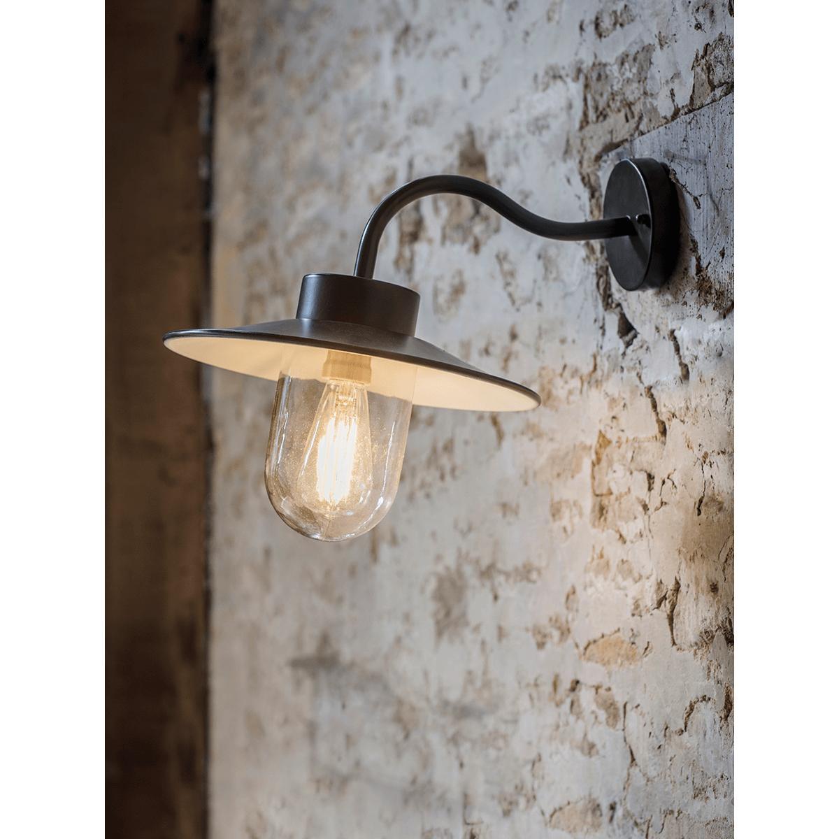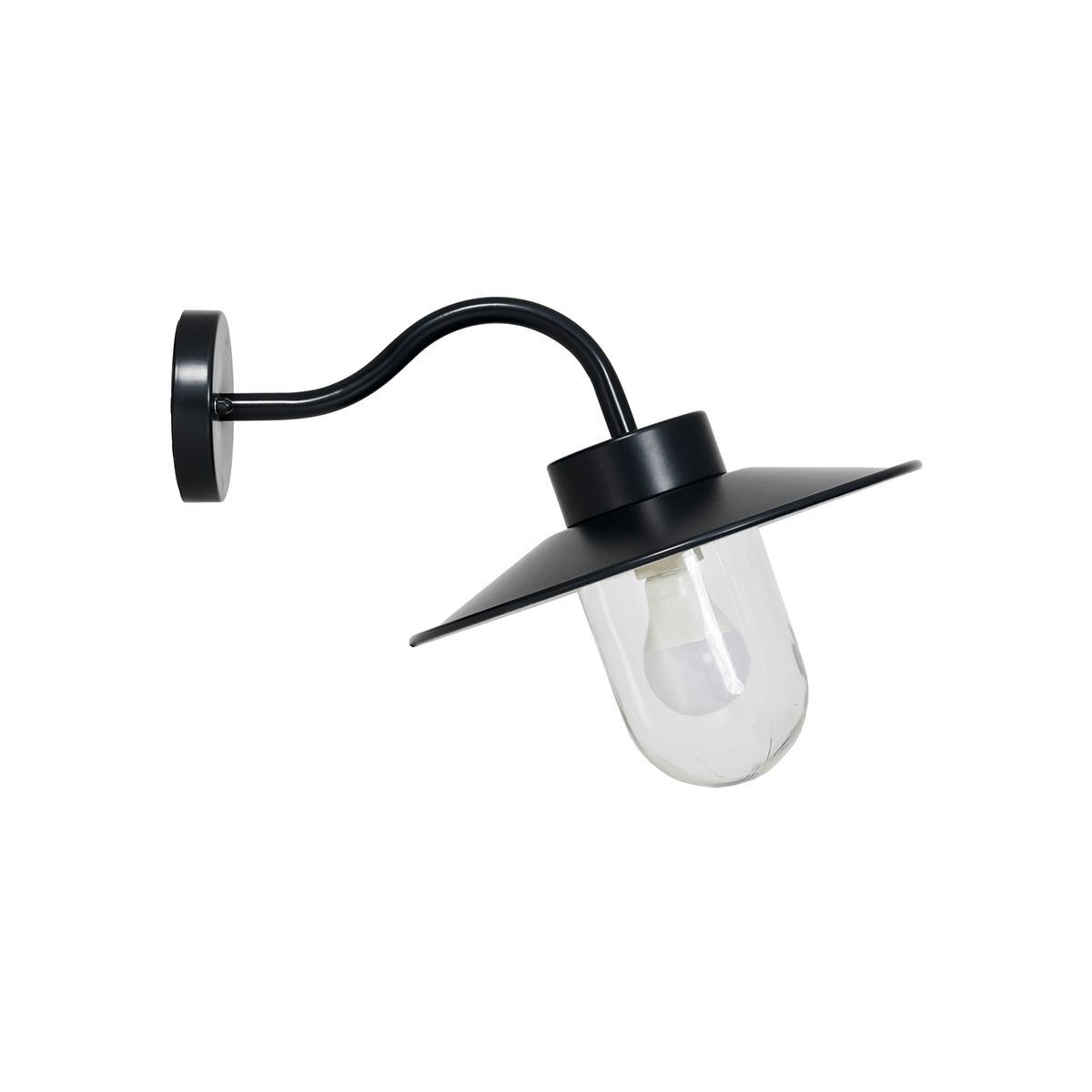 Inspired by naval design, this elegant light looks perfect mounted on an outdoor wall or fence. The sleek black finish will complement any outdoor look, and the graceful curved neck and glass bulb covering add vintage inspired beauty to your outdoor space.