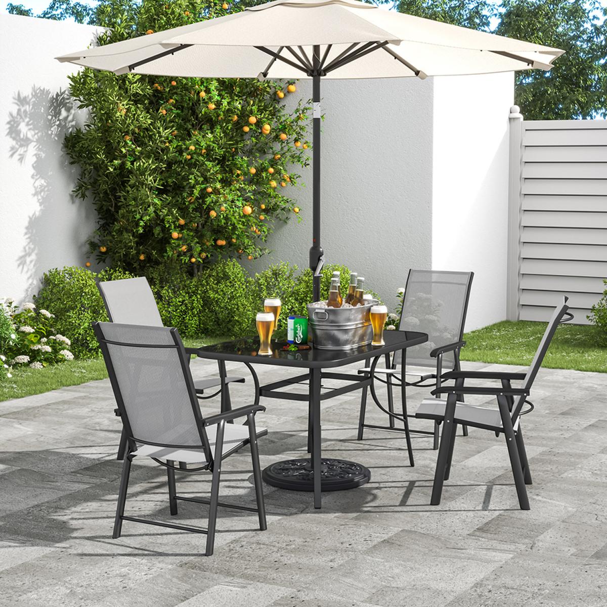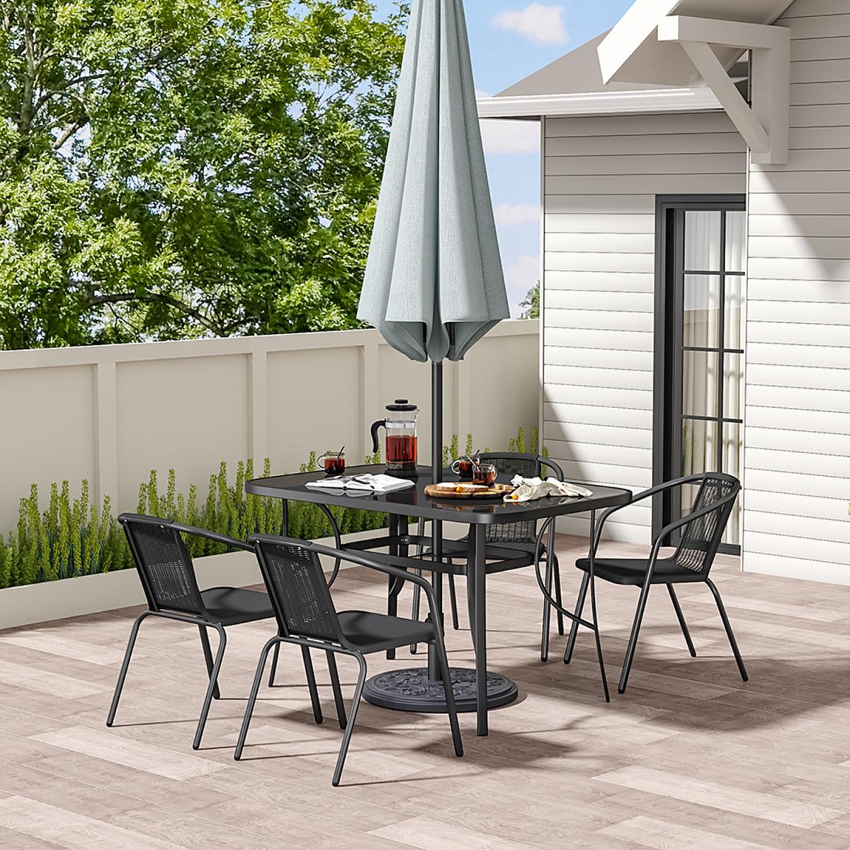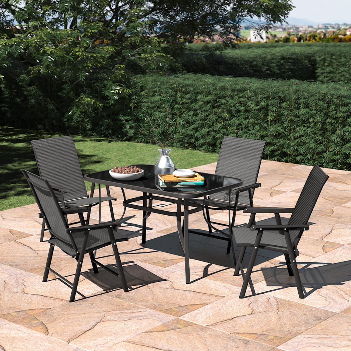 This outdoor bistro set, with its delicate appearance and high quality, can make a great experience for you. Modern and practical 5-piece patio furniture set increases a fashion style to your garden or porch. It includes a tempered table silked in black and 4 fabric chairs. There's a hole in the middle of the table, where you can place a parasol to protect you from the sunlight. In a contemporary style, it's perfect to compliment your garden or balcony.