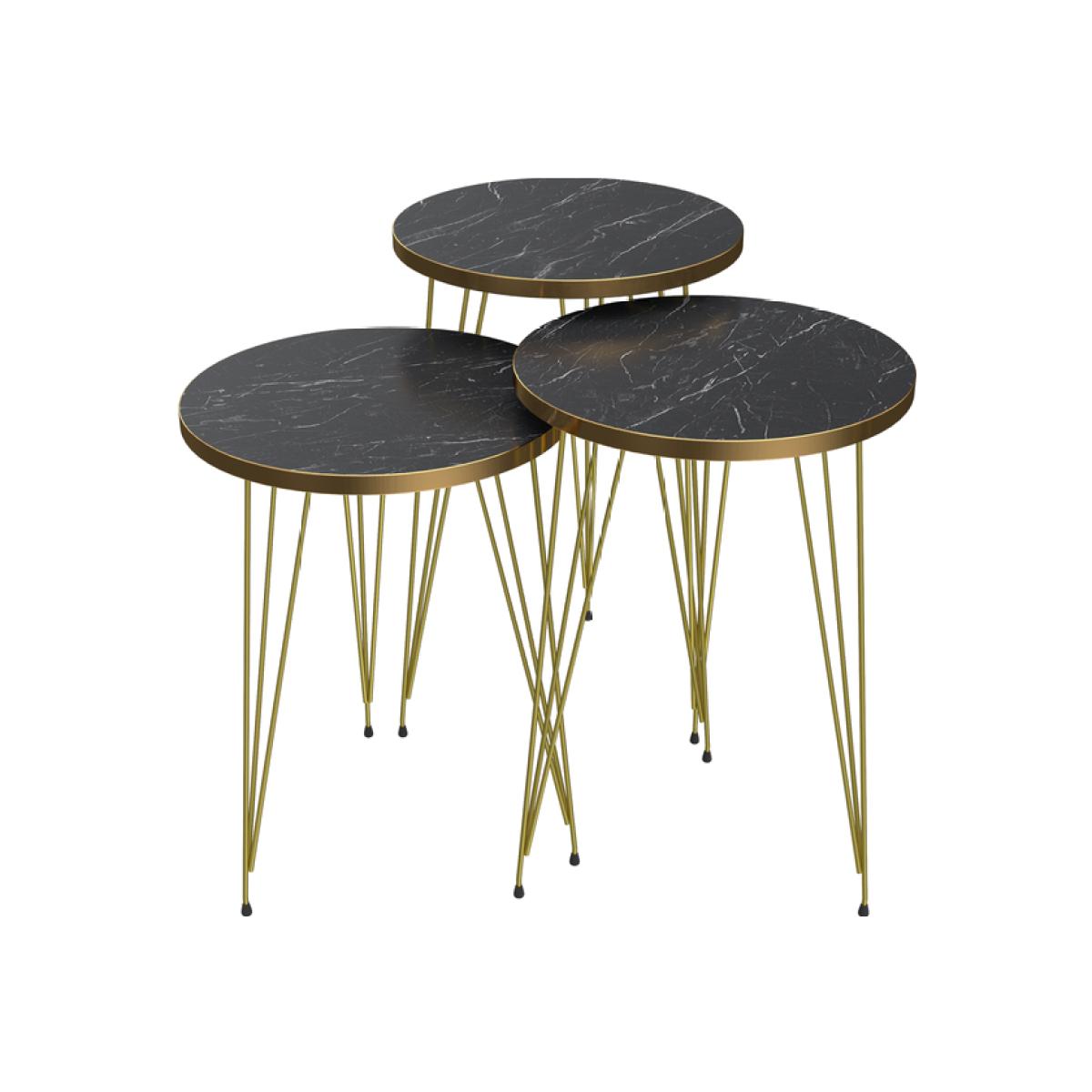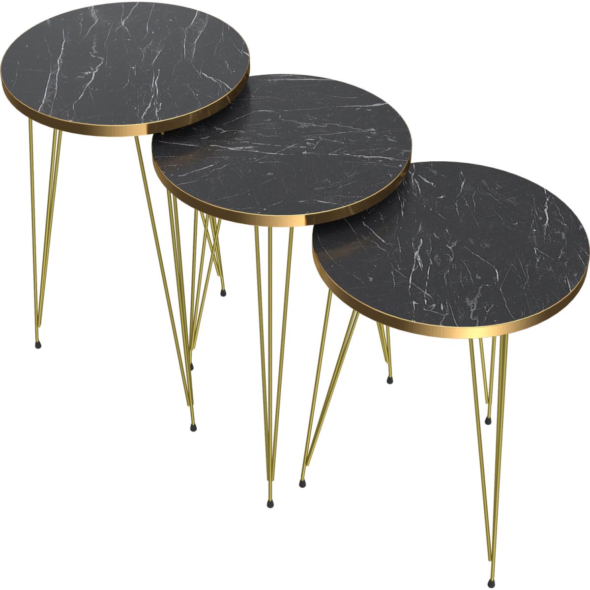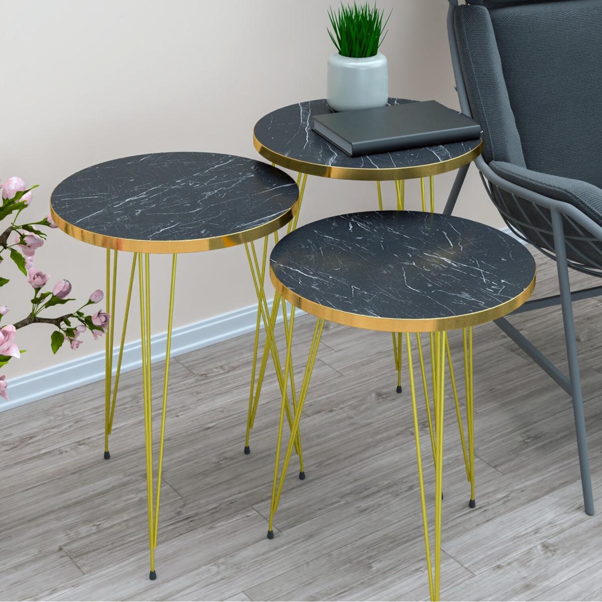 Bring a streamlined modern style to your seating ensemble with this retro side table. The set includes 3 nesting tables which are ideal for using separately or stack together in different occasions. However, the small table can also fit neatly under the larger table for easy storage, making this a great furniture set for a small space. They can also be used as bedside tables, side tables, end tables, round coffee tables, telephone tables or nightstands making them a versatile living room furniture set. Round design can be placed in corners to save space. Quick and easy to assemble, just screw the legs to the table tops, all you need is a screwdriver. Can be used as a set or split up and placed individually. Made with Laminated Particleboard and metal legs, looks elegant and durable. Multi-purpose End Table:Compact size, space-saving and lightweight design, this set of end tables is easy to move. Rounded edge design can prevent potential damage and injuries. Made of Marble Veneer and sturdy Laminated Particleboard with 3 metal gold legs, it is durable enough to meet long-term needs. Also, it is practical for you to store things and save your space. Featuring sturdy metal legs, these tables are built to last and will be a practical addition to your home for years to come. Table legs with floor protection, anti-slip plastic pad on the bottom of coffee table legs makes it more stable and prevent noise and scratches to the floor.
