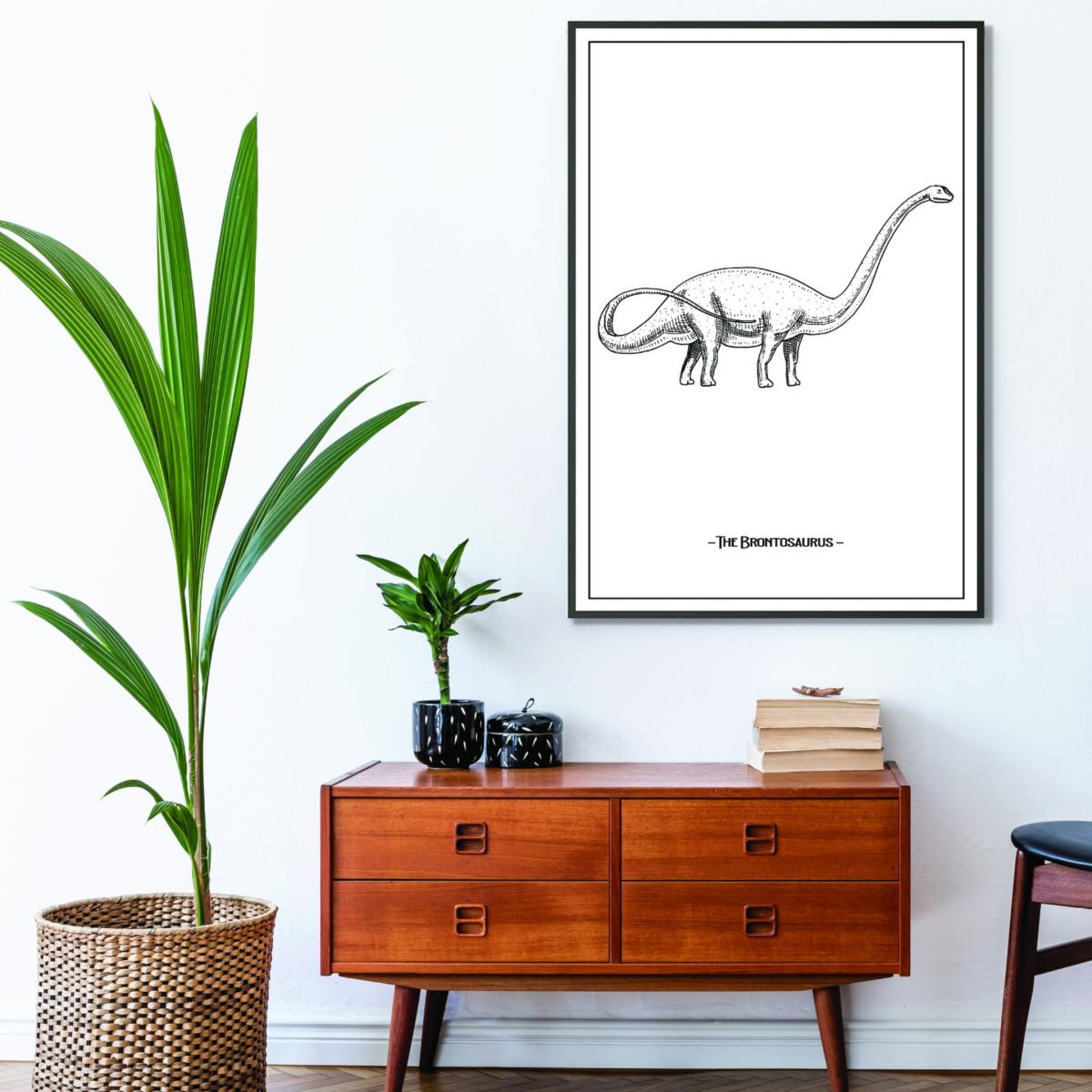 The Black The Brontosaurus print is a playful yet sophisticated piece that can bring a touch of character to various interiors. I love its minimalist line drawing which works particularly well in modern, Scandinavian, or eclectic spaces, offering an unexpected conversation starter. It also pairs well with monochrome palettes or can add visual interest when placed against a colourful wall. Practical styling tips include framing it with a slim black or white border to keep the look clean, and positioning it above a desk, sideboard, or in a children's space to add a whimsical touch. Its sizeable A1 format makes it a statement piece, so consider pairing it with other small prints or a simple gallery wall to balance out the impact without overwhelming the room.