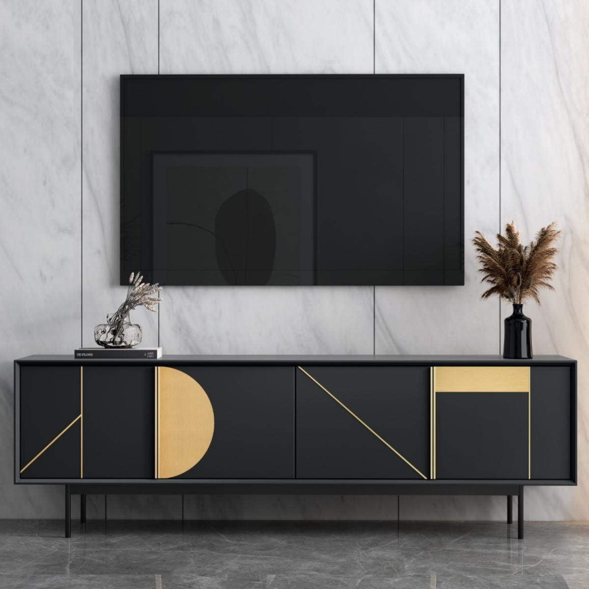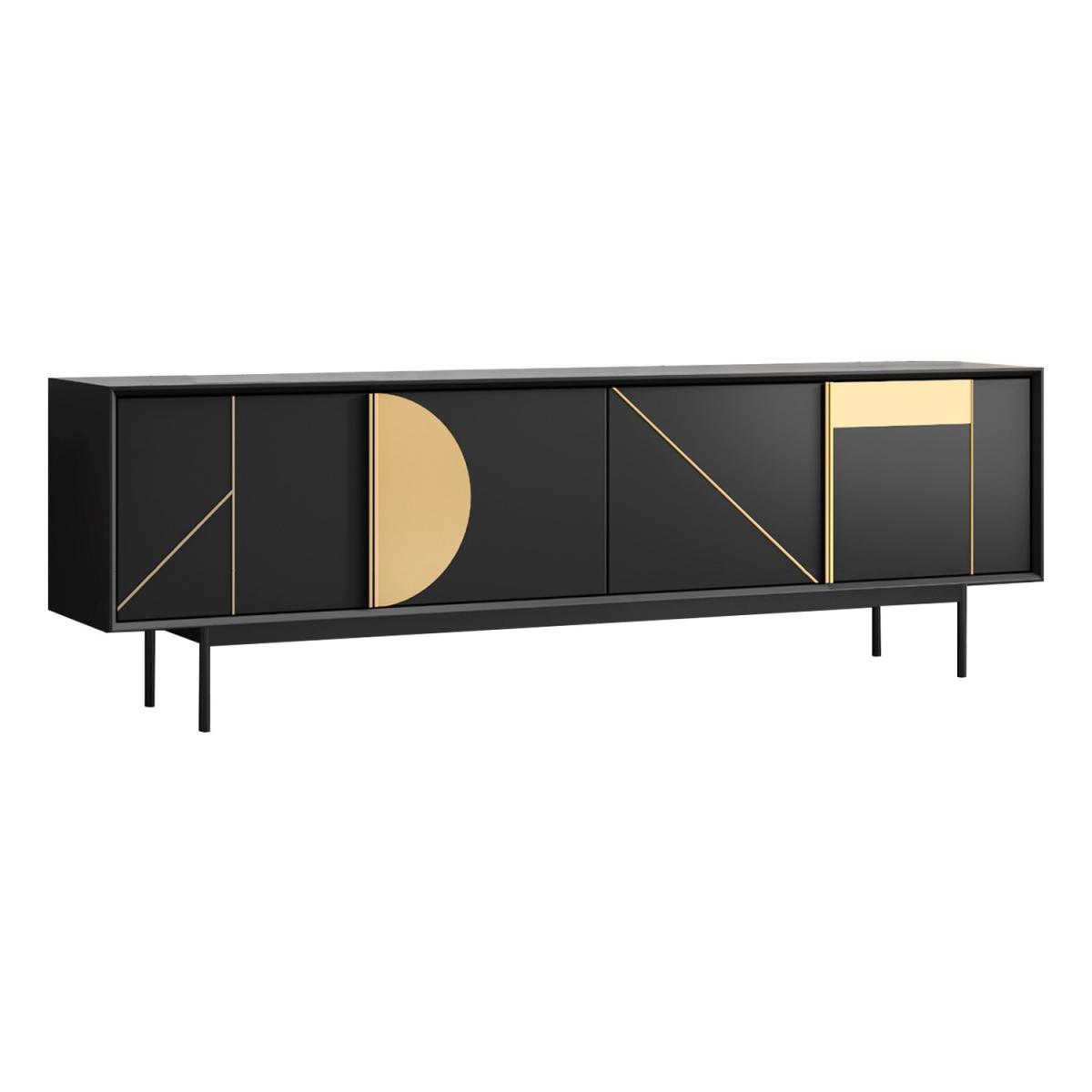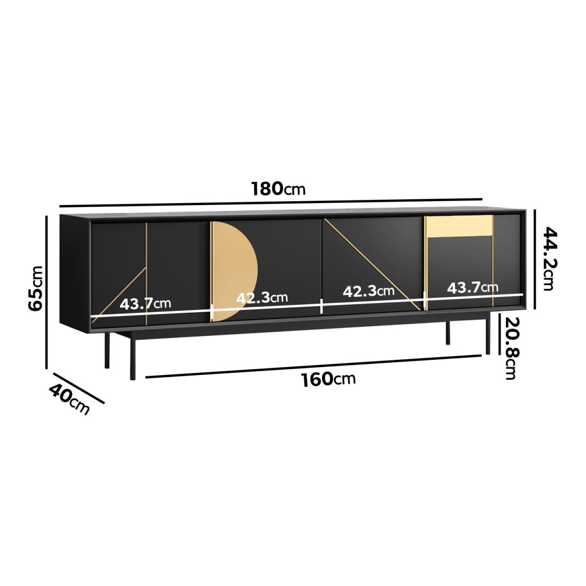 Features we love Matt black and gold geometric TV unit with cupboards6 compartments provide ample storage space. Pre-cut cable holes help keep wires tidy. Suitable for TV’s up to 70”Minimal assembly required just attach the legs. All about me. Transform your living room with this modern TV unit. Suitable for TV’s up to 70” the long matt black unit has 6 storage compartments and looks stylish in any living space. Embellished with premium geometric gold detailing the unique design will have all your guests asking where you bought it. Assembling the unit is easy simply attach the legs and you’re ready to go. Need to know. Dimensions. H65 x W180 x 40 cm Max supported weight. This unit will hold up to 40 kg TV size. Fits a TV up to 70” Colour. Black and gold Finish. PU Material. MDF and plywood Assembly required. Yes