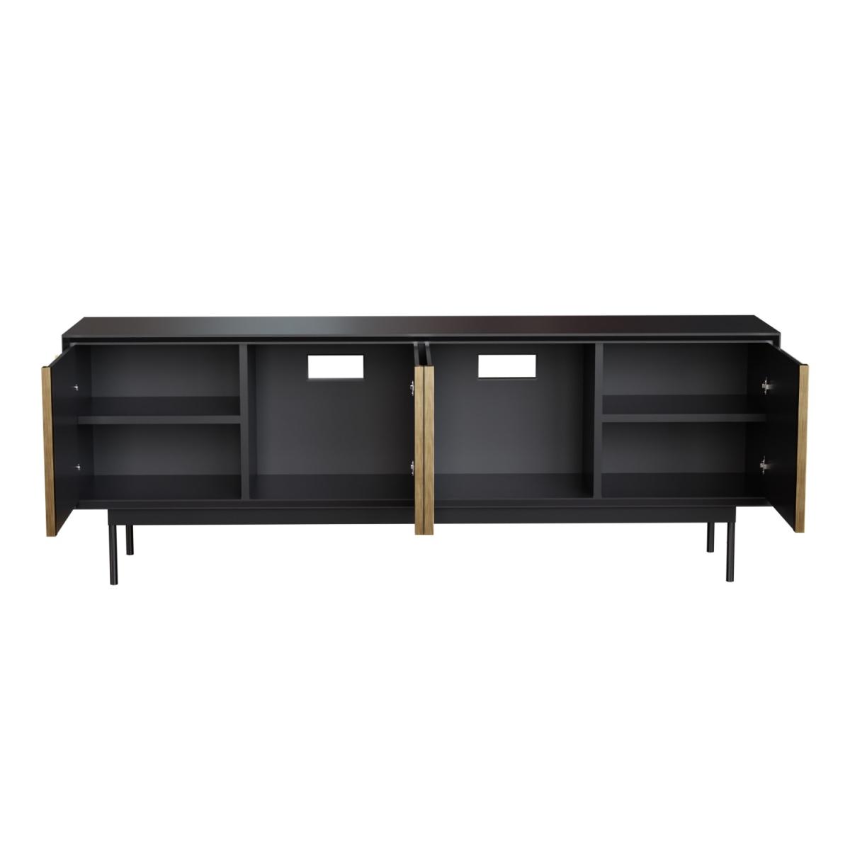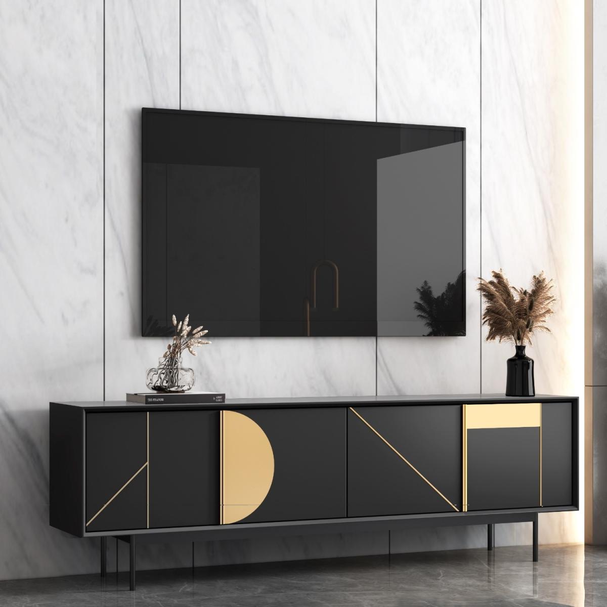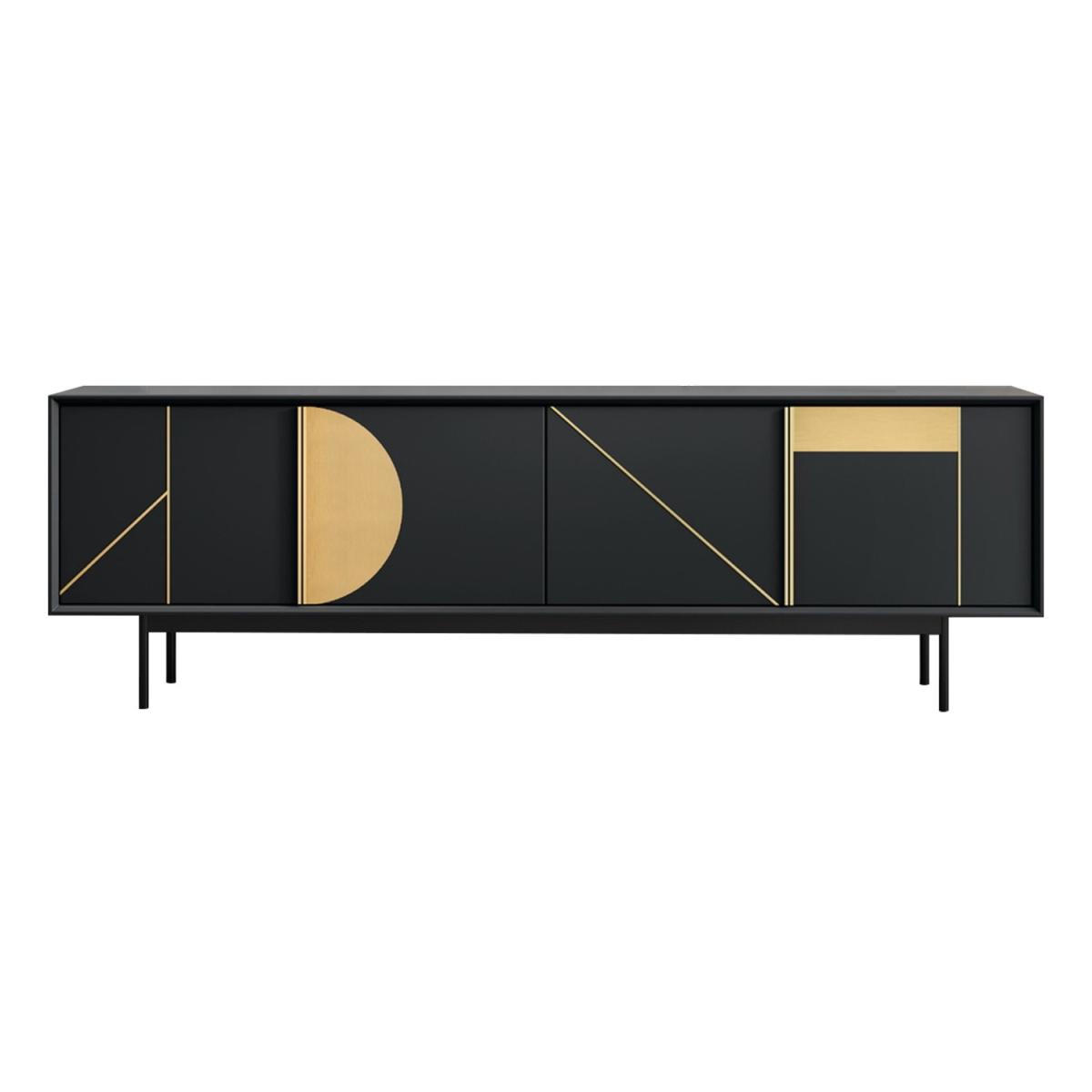 Features we love Matt black and gold geometric TV unit with cupboards6 compartments provide ample storage space. Pre-cut cable holes help keep wires tidy. Suitable for TV’s up to 70”Minimal assembly required just attach the legs. All about me. Transform your living room with this modern TV unit. Suitable for TV’s up to 70” the long matt black unit has 6 storage compartments and looks stylish in any living space. Embellished with premium geometric gold detailing the unique design will have all your guests asking where you bought it. Assembling the unit is easy simply attach the legs and you’re ready to go. Need to know. Dimensions. H65 x W180 x 40 cm Max supported weight. This unit will hold up to 40 kg TV size. Fits a TV up to 70” Colour. Black and gold Finish. PU Material. MDF and plywood Assembly required. Yes