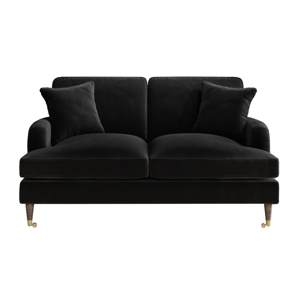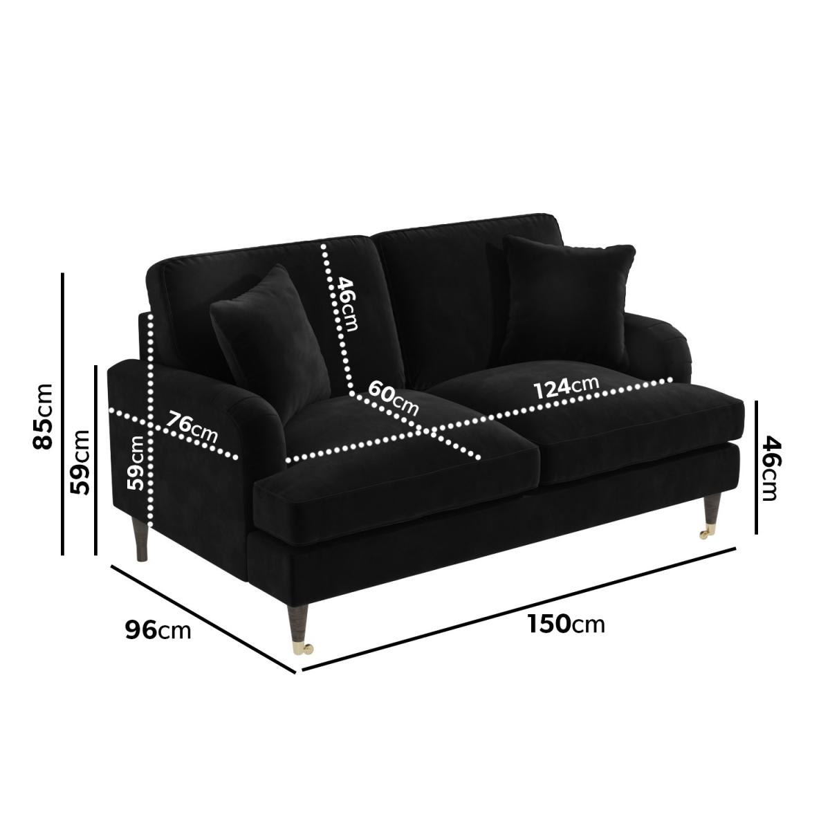 Discover maximum comfort and minimum maintenance with this gorgeous sofa. This plush Payton two-seater sofa offers traditional styling with a modern twist thanks to its dark wooden legs with gold accent front castors and classic ruched saddle arms. Beautifully tailored and upholstered in beautiful black velvet, it brings touch of elegance to your living space, making it the perfect statement piece. It comfortably seats two and comes accompanied with two matching throw cushions which add a final flourish of elegance. Adding this trend-setting piece to your home is easy. There's minimum assembly; it's just a case of fixing the legs into position.