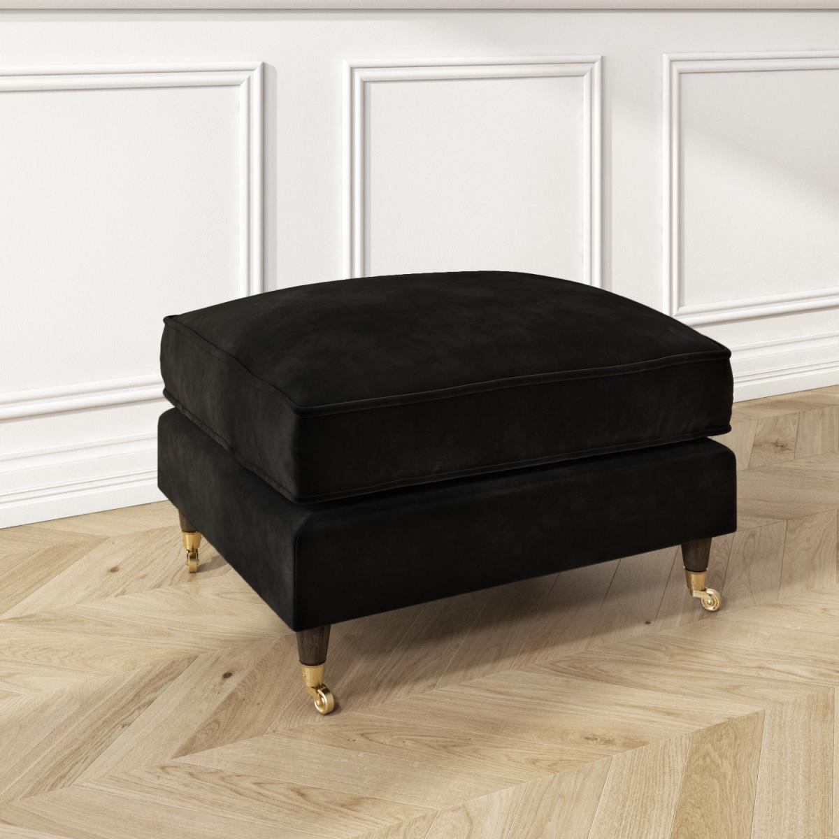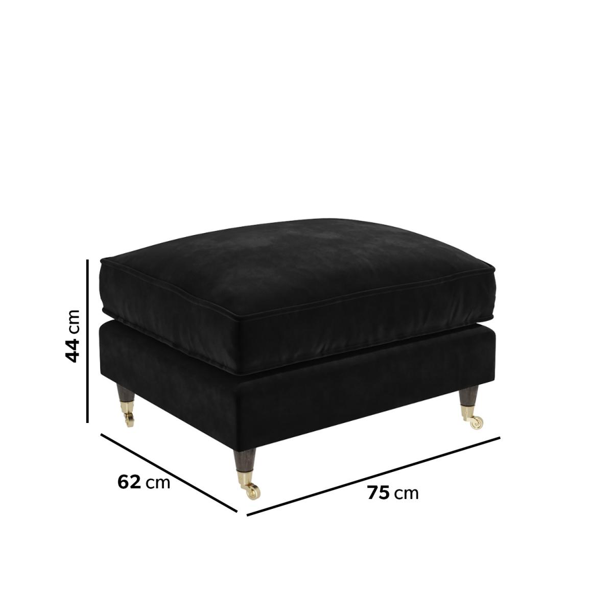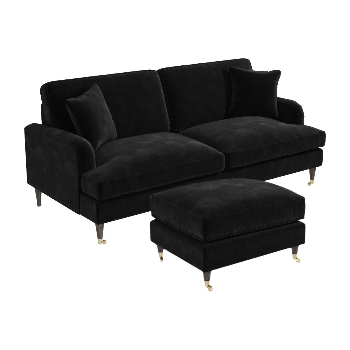 This bundle includes: 1 x Black Velvet 3 Seater Sofa – Payton 1 x Black Velvet Footstool – Payton Features we love Black velvet 3-seater sofa and footstool set The sofa comes with two matching scatter cushions Removable cushion covers are easy to wipe clean The footstool can also be used as an additional seat Foam filled for super comfy living room seating All about me Create the ultimate cosy living room with this Payton black velvet set, featuring a 3-seater sofa and footstool. It's the perfect combination of style and practicality, the black upholstery with gold accent legs makes an ideal place to relax with your feet up after a long day. Need to know Sofa Overall dimensions: W190 x D96 x H85 cm Seating dimensions: W164 x D60 cm Packed dimensions: W192 x D98 x H61 cm Packed weight: 54 kg Colour: Black Finish: Velvet upholstery and wooden legs Material: Velvet (100% polyester), wooden frame and legs and metal castors Filling: Foam Assembly required: Yes - just attach the legs Footstool Overall dimensions: W75 x D62 x H44 cm Packed dimensions:W77 x D64 x H31 cm Packed weight: 10 kg Colour: Black Finish: Velvet upholstery and wooden legs Material: Velvet (100% polyester), wooden frame and legs and metal castors Assembly required: Yes - just attach the legs