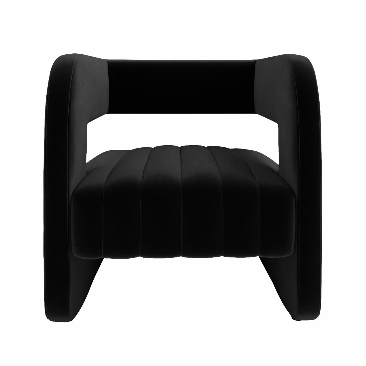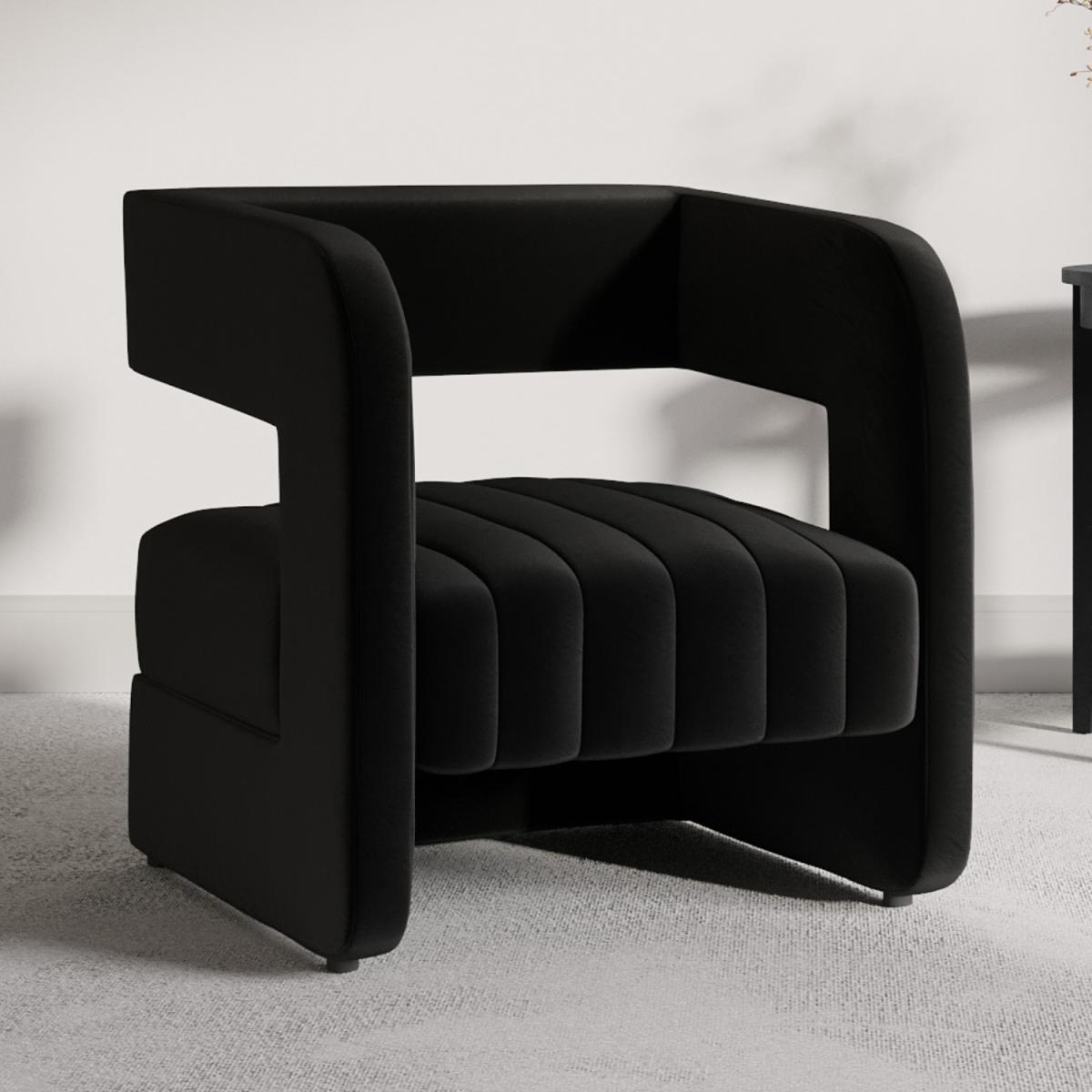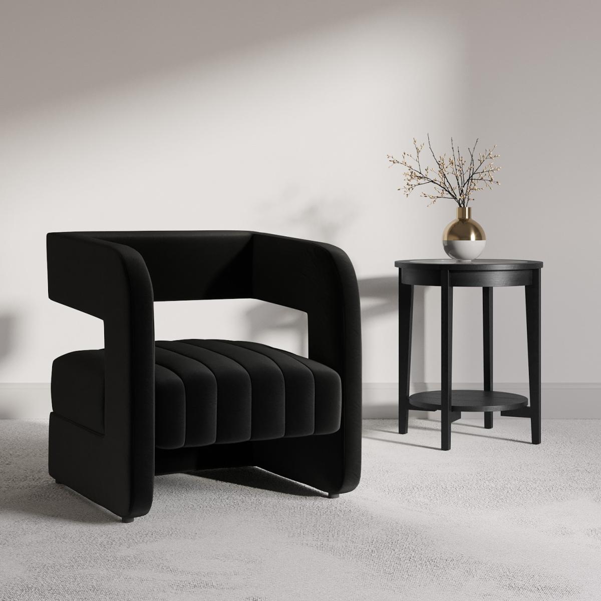 I’m a fan of this ribbed velvet armchair for its clean lines and plush finish - it instantly lifts any seating area without overwhelming the space. The deep black velvet reads luxe but remains versatile, sliding easily into modern minimal, art-deco inspired or moody boudoir schemes. To style it, pair with a slim metal side table in brass or matte black and layer in a light wool throw or a cushion in warm ochre or soft stone grey to break up the dark hue. Tuck it beside a low console or on its own in a reading nook with a sculptural floor lamp for a balanced, gallery-like feel.