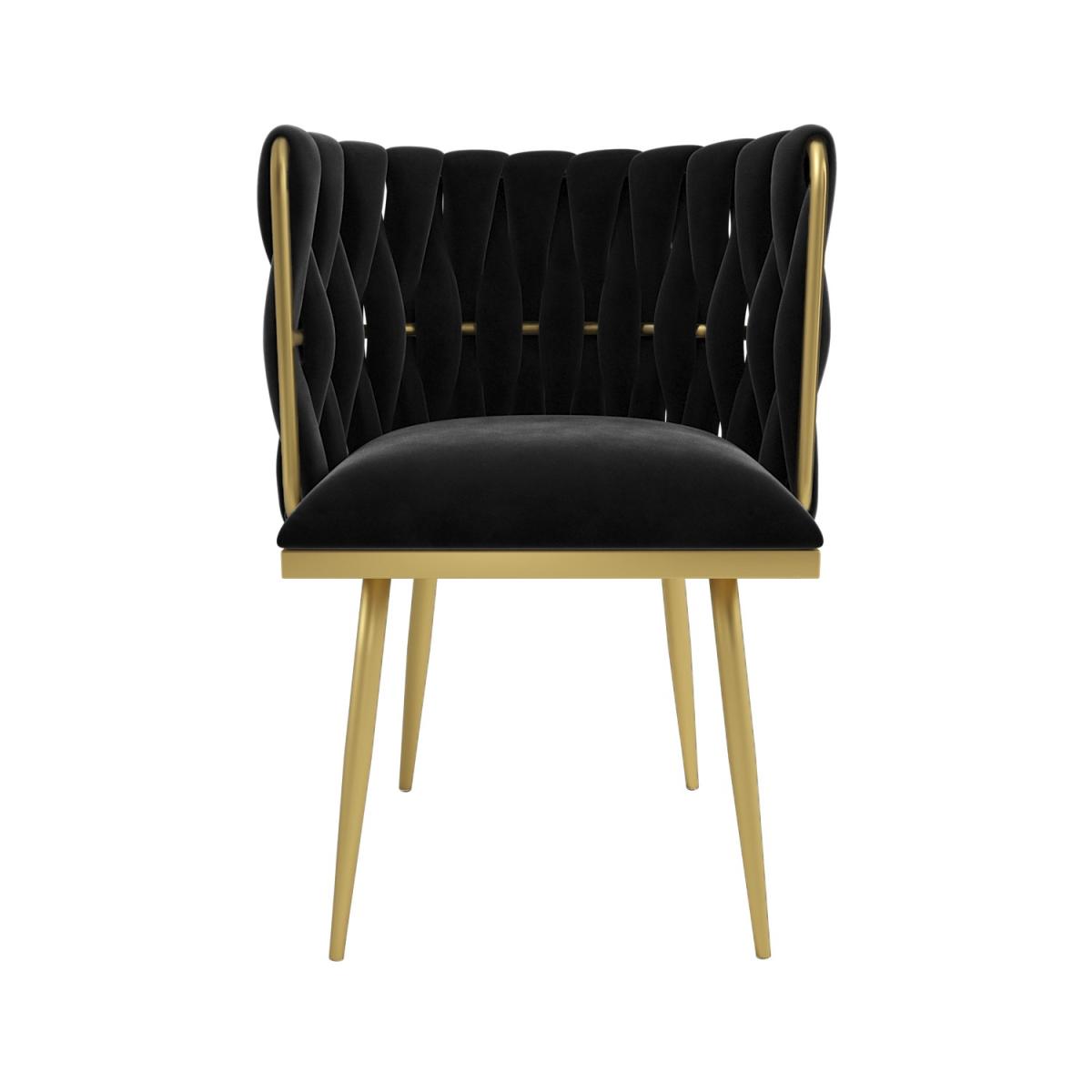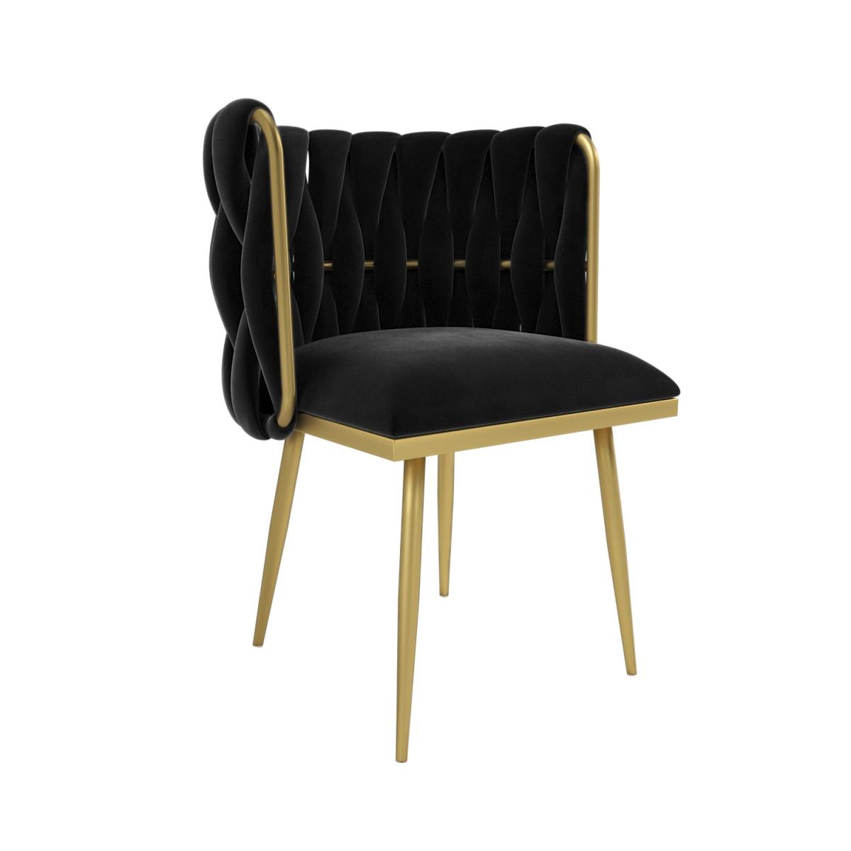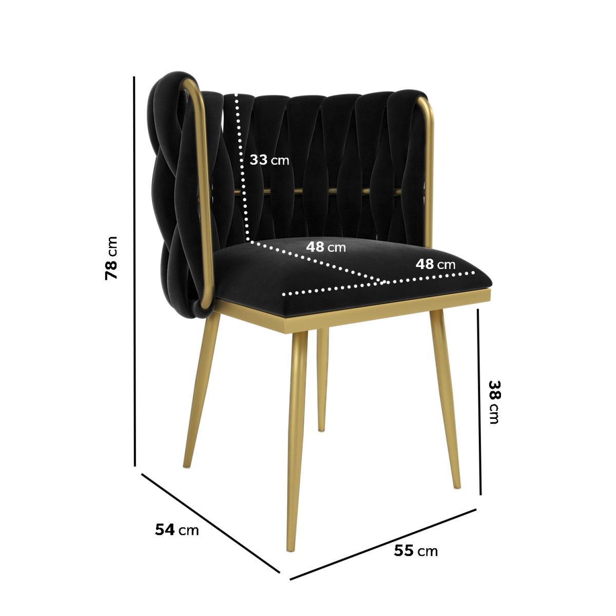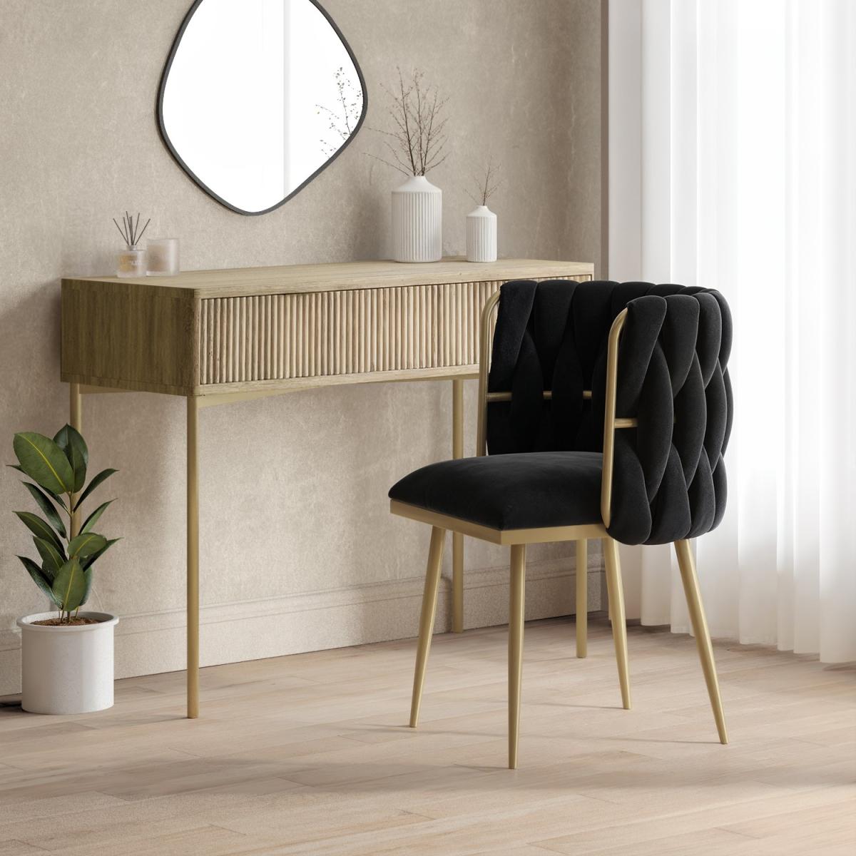 Soft to touch black velvet and a sleek gold frame adds luxury to any dressing table or room. The curved backrest and cushioned seat offer excellent support, providing comfort. Perfect as a dressing table chair or accent chair, adding a chic touch to any room. Made with quality materials and strong tapered legs for lasting stability. Simply secure the legs in place and it’s ready to use. This beautifully designed chair makes the perfect addition to any bedroom or living space, adding a sophisticated and elegant touch. With a chunky weave back and contrasting gold frame, it'll make a great focal point next to any dressing table. Thanks to the foam-filled seat base and backrest, it's comfy, too. There's minimum assembly, just secure the legs in place and it's ready to use.