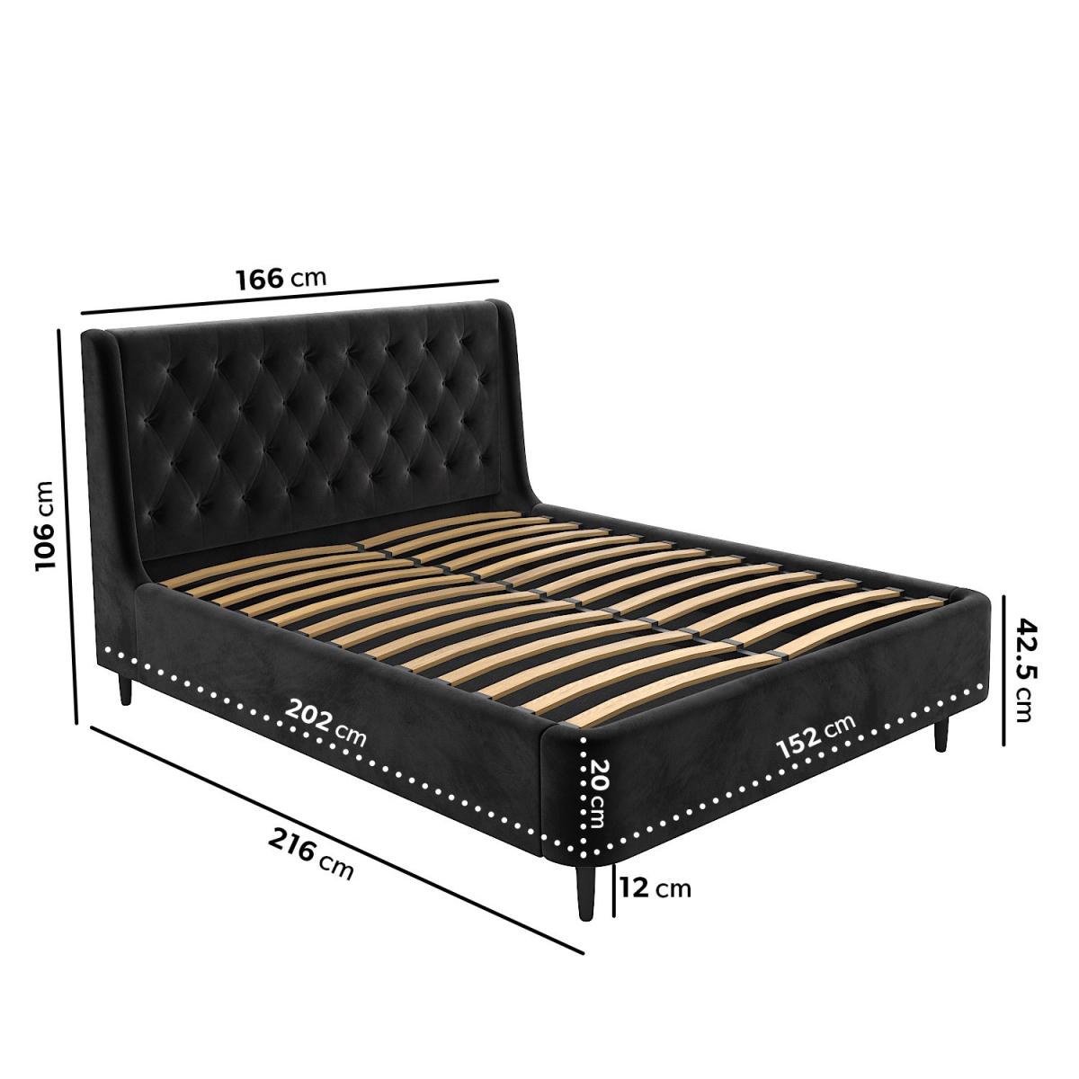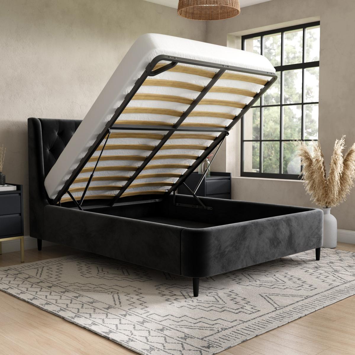All about me The Amara king size ottoman bed is guaranteed to make a stunning focal point in any bedroom, with a winged chesterfield headboard and plenty of storage for your belongings. It features a sturdy sprung-slatted base to keep your items protected and a gas-lift mechanism that ensures easy access to the space beneath. It's upholstered in an ultra-soft black velvet fabric that complements its mid-century styling and black legs. Need to know Bed dimensions: W166 x D216 x H118 cm Storage dimensions:W152 x D202 x H20 cm Mattress size: Standard UK king size (5ft) Mattress included: No Colour: Black Finish: Upholstered Material: Velvet fabric Bed base: Sprung-slatted Weight: 67 kg Assembly required: Yes Packaging dimensions (3 boxes): W156 x D111 x H16 cm, W206 x D33 x H28 cm, W109 x D26 x H17 cm Please be advised the ottoman lift mechanism supports a weight of up to 55kg when open