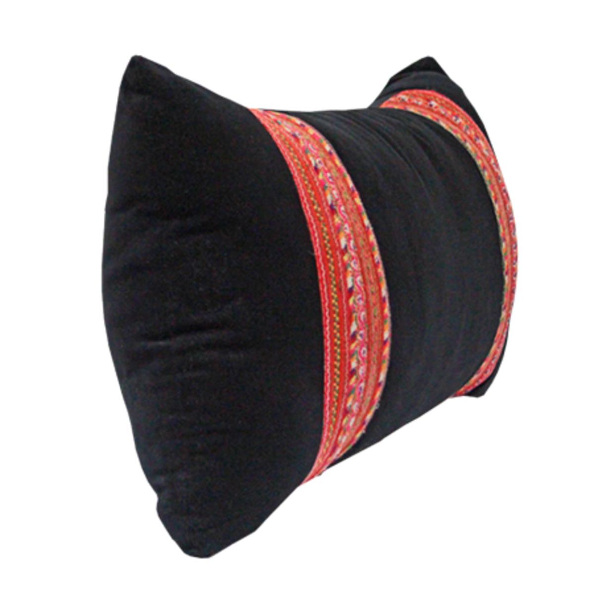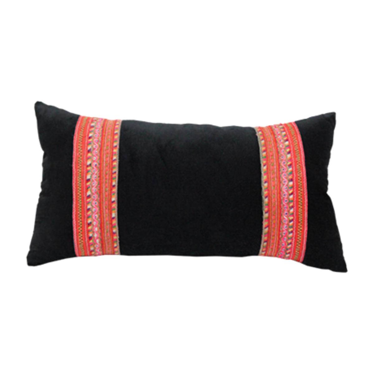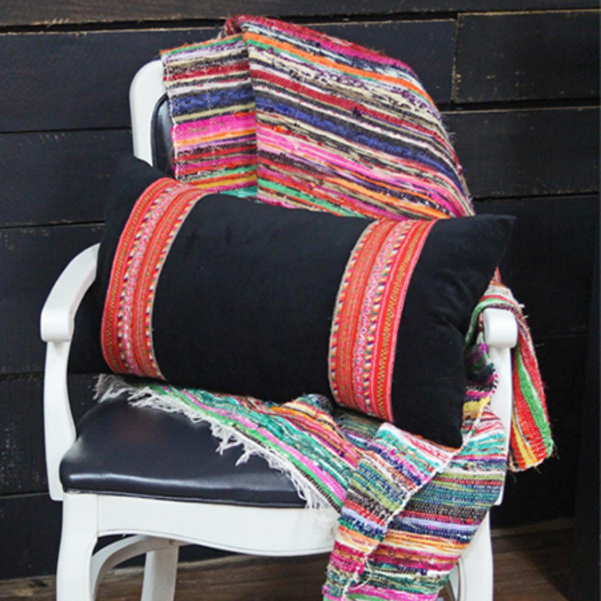 This black velvet pillow is embellished with banded fragments of vintage Tibetan textiles. Saturated colors of vintage orange and gold stand out against the luxurious and soft black velvet background. Use this one-of-a-kind pillow, crafted with salvaged textiles, alone or layered with other colors and patterns. However you use it, it will elevate your space and add some extra personality.