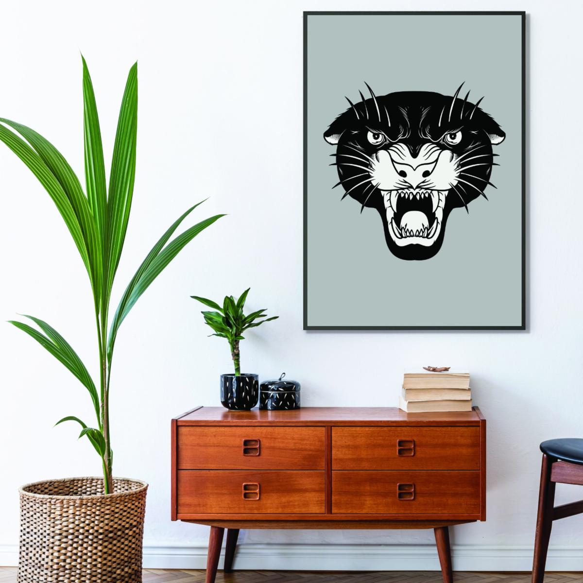 I love this print for its bold, graphic impact - it works particularly well in modern or monochrome interiors where a striking statement piece is desired. The panther motif adds a sense of drama and sophistication, making it ideal for living rooms or bedrooms with minimal colour palettes. For styling tips, consider pairing it with sleek black frames or placing it against a neutral wall to really let the artwork stand out. It also complements industrial or contemporary settings where clean lines and bold visuals are key. Practical tip: keep surrounding decor simple to avoid overpowering the piece-it’s all about letting the artwork be the focal point.
