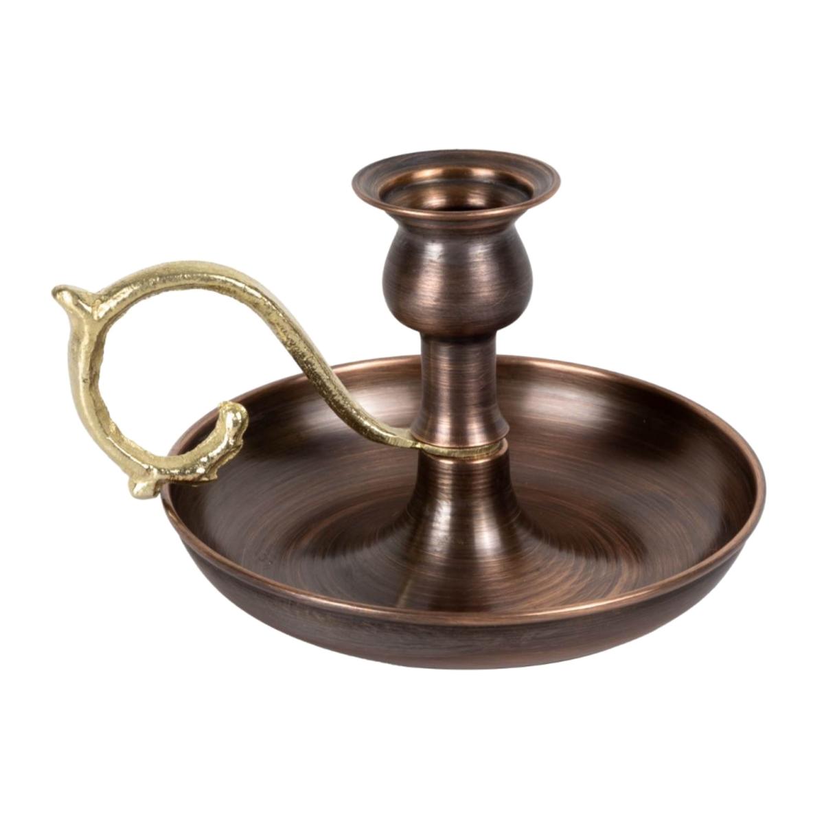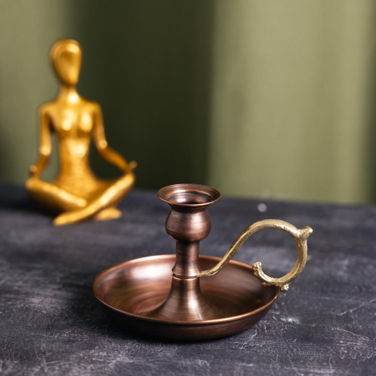 Infuse your space with timeless charm using this vintage-style solid copper candle holder. Expertly crafted with a rich copper finish and a delicately designed golden handle, this piece is perfect for enhancing your home décor. Whether used as a centerpiece, during festive gatherings, or for creating an intimate atmosphere, its sturdy design ensures safety and elegance. The warm copper tones paired with the graceful handle make it a sophisticated addition to any room.