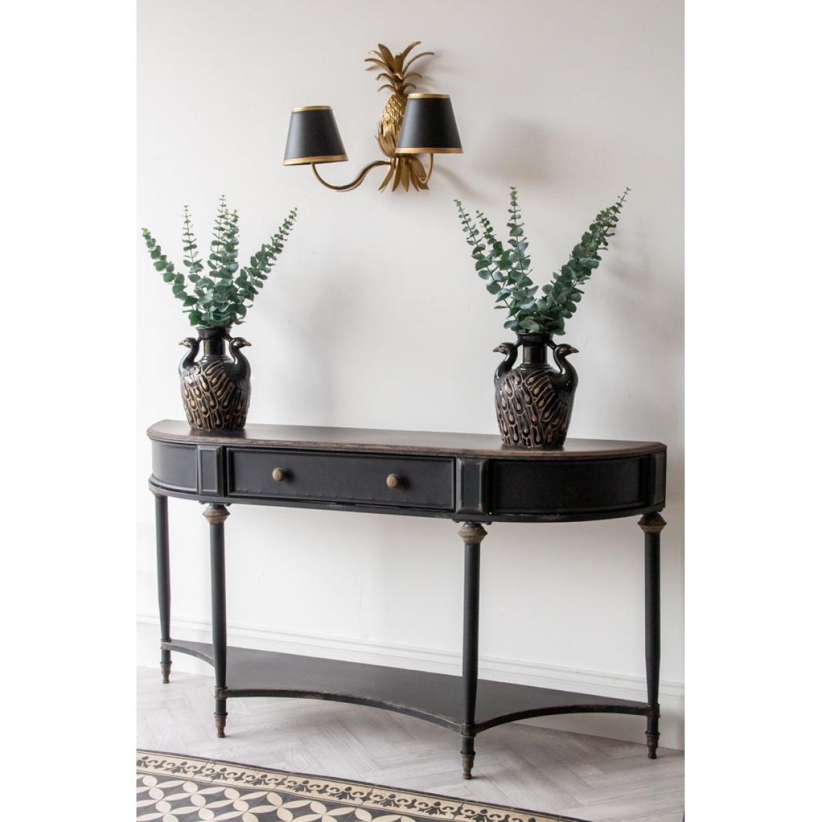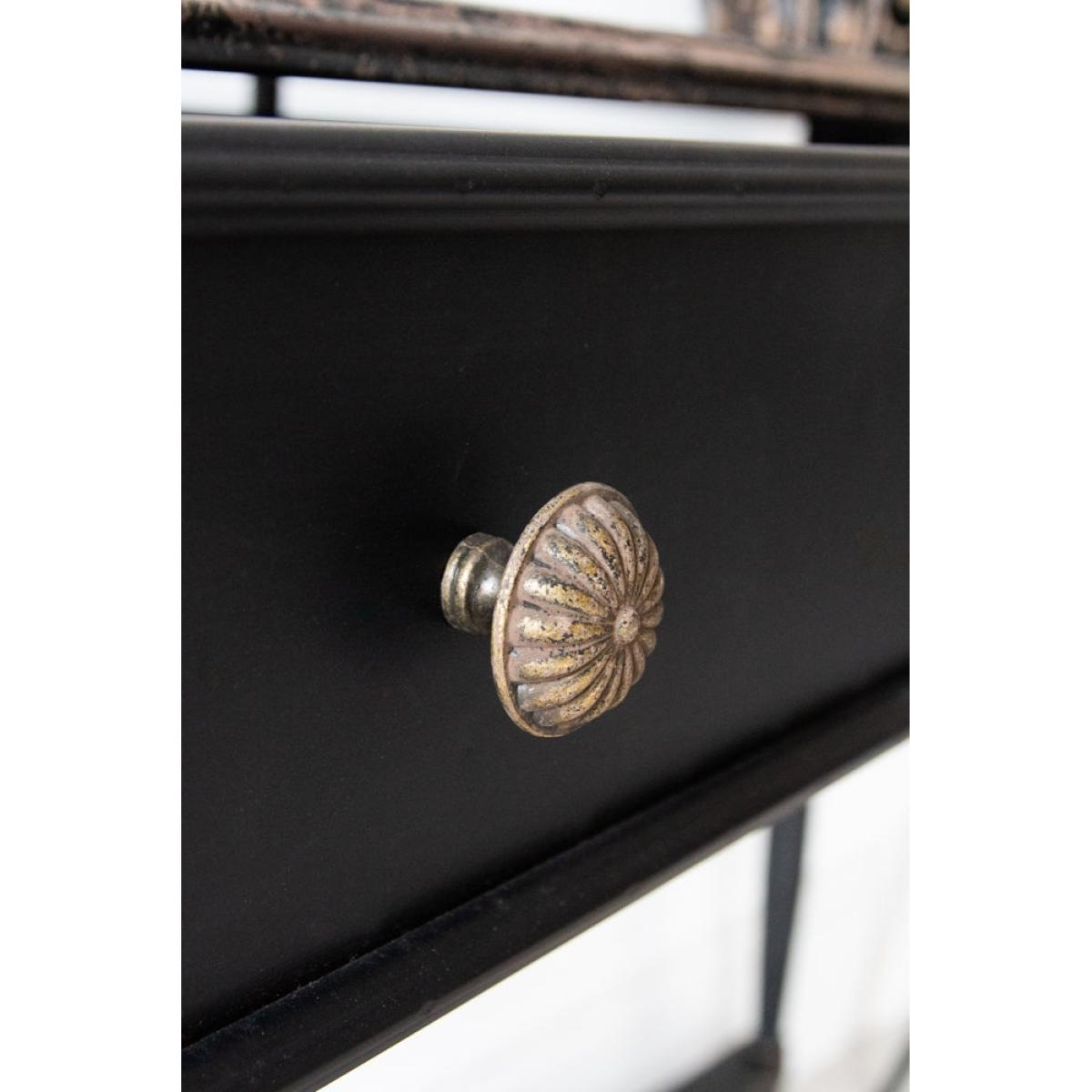 About The Black Vintage Style Metal Distressed Console Table With DrawerA beautiful vintage style console table that helps to create a grand entrance, the Black Metal Distressed Console Table With Drawer is a fabulous piece of furniture for any home!Measuring height 89cm x width 150cm x depth 39.5cm, the Black Metal Console Table features a sleek black finish with dramatic distressed details that add elegance, character and sophistication. Why We Think You’ll Love The Distressed Black Metal Console TableA hero piece for your home, the Black Vintage Style Metal Distressed Console Table promises to fill any empty hallway or entrance space in your home with statement style. Inspired by classic French antiques, the distressed details across the edges help to create the illusion of age, for a lived in look that captures the character and beauty of authentic antiques!The perfect balance of classic and contemporary, the Black Vintage Style Console Table pairs timeless vintage vibes with a black metal finish that is synonymous with modern industrial design. Both beautiful and practical, the Black Console Table is designed with a handy central drawer that can be used for storing keys and any other household essentials. Where To Style The Vintage Black Metal Hall Console TableConsole tables are amazing for adding extra interest to the hallways of your home and the space on top of the table offers the perfect opportunity to set the tone and introduce your individual style to anyone that walks through the door. When styling your console table, go all-out with your display and include everything from beautiful vases filled with flowers to your favourite artwork, personal photos, a statement mirror and quirky ornaments that add instant wow factor!