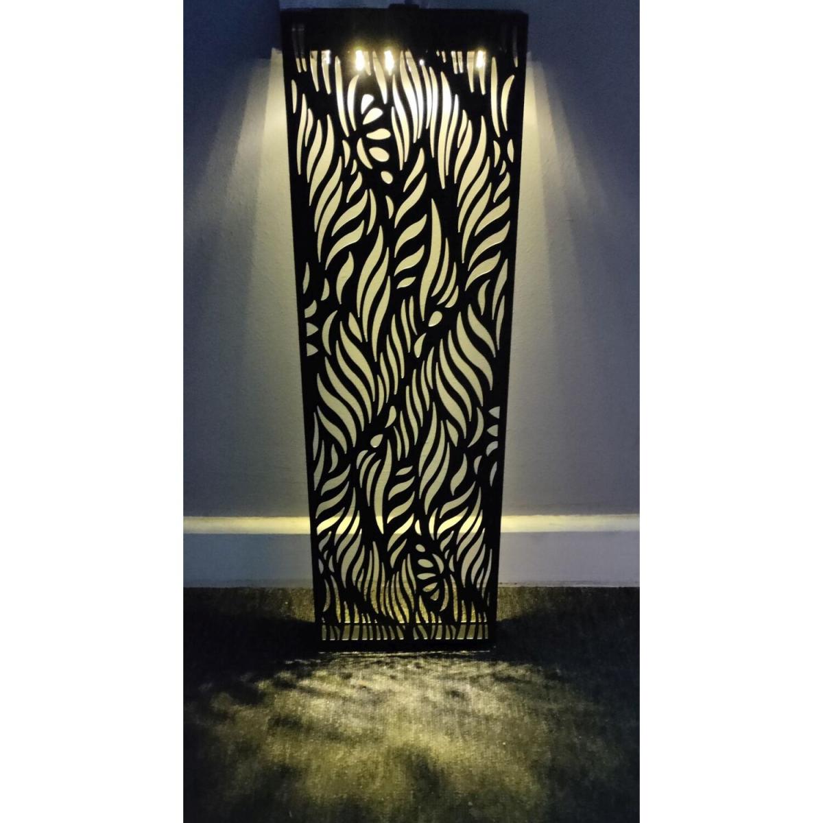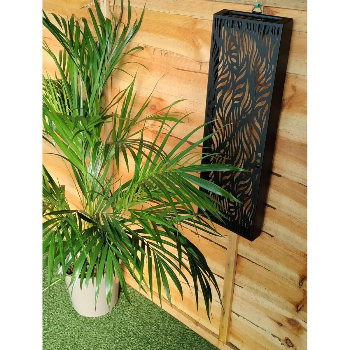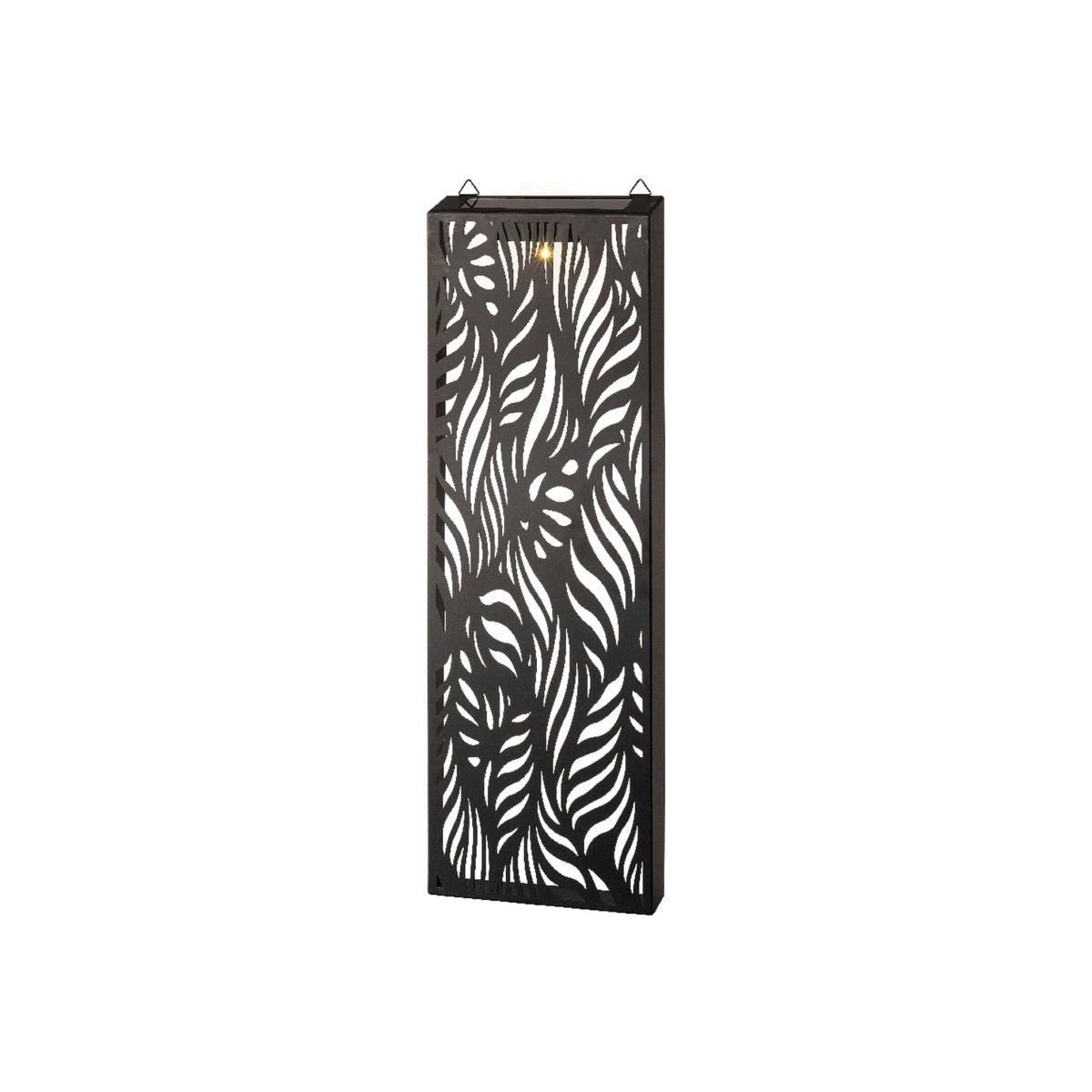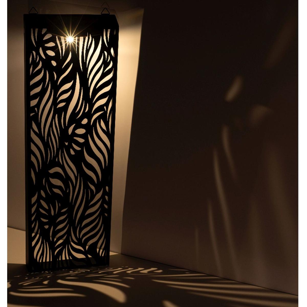 Add a little character to your outdoor space with this elegant black wall art panel. Its illuminating feature will create a charming atmosphere for all your family and friends to enjoy. This solar powered wall art decoration features 6 LED bulbs which automatically light up, giving a warm white glow when dusk arrives. Once charged the wall art panel will illuminate for up to 6 hours at a time. Creating a warm and welcoming feel to your garden or patio area. The panel measures 60cm in height, 20cm in with and has a depth of 4.5cm approximately. With an integrated hook in the centre of the panel, this beautiful wall art decoration is ideal for hanging on the side of your house, a fence or the garden wall.