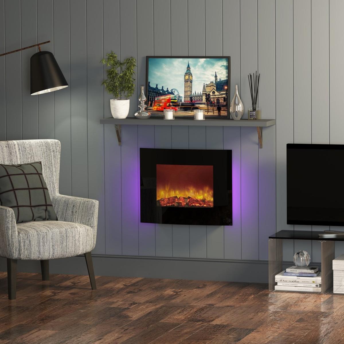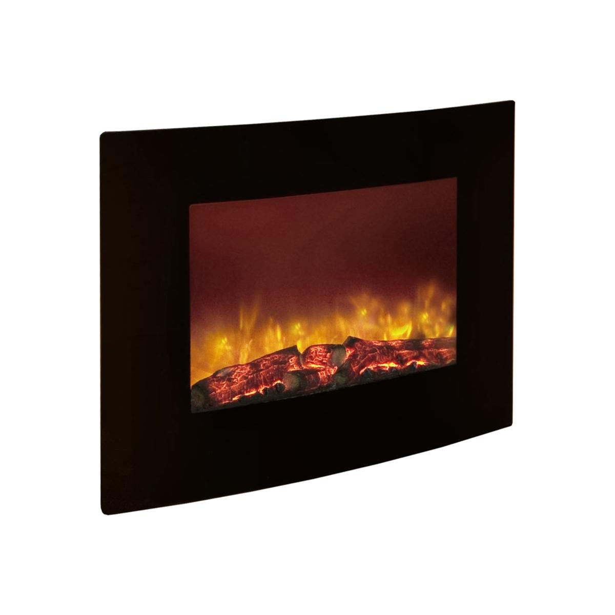 Dimensions W64cm x H50cm x D16.5cm. The Quattro wall mounted electric fire has a curved Black Glass fascia. The 2kW heat output creates a warm ambience. Enjoy the realistic flame effect and multiple back lighting options depending on your mood. With energy saving LED flame effect and a thermostat control feature it's sure to be an economical method of heating too. The heat comes out at the bottom at an angle to roll out around the room to keep your home even warmer which means you can turn your central heating down and save on the gas bill!This electric fireplace attaches to the wall (fixings included) and requires no chimney or flue. Its compact design makes it ideal for smaller living spaces. Features. 25" Wall mounted electric fire with curved Black glass fascia Compact design for smaller living spaces2kW heat setting. Remote control with built in thermostat control and flame only setting. Daily or weekly programmable timer Count down timer Open window / door sensor. Adaptive smart start control. Adjustable ambient back lighting with 13 colour options and scroll effect3 flame effect settings each with 5 brightness levels. Easy reach manual flame effect button located on the right hand side of the fire. Flat wall fix - no flue or chimney required. Realistic glowing log bed. Latest LED flame technology for exceptionally long life and low energy consumption1KW setting= 13p per hour2KW setting= 26p per hour..