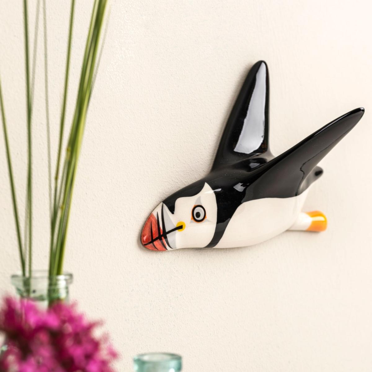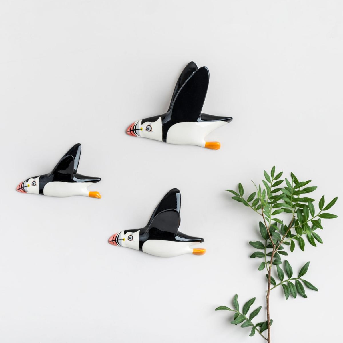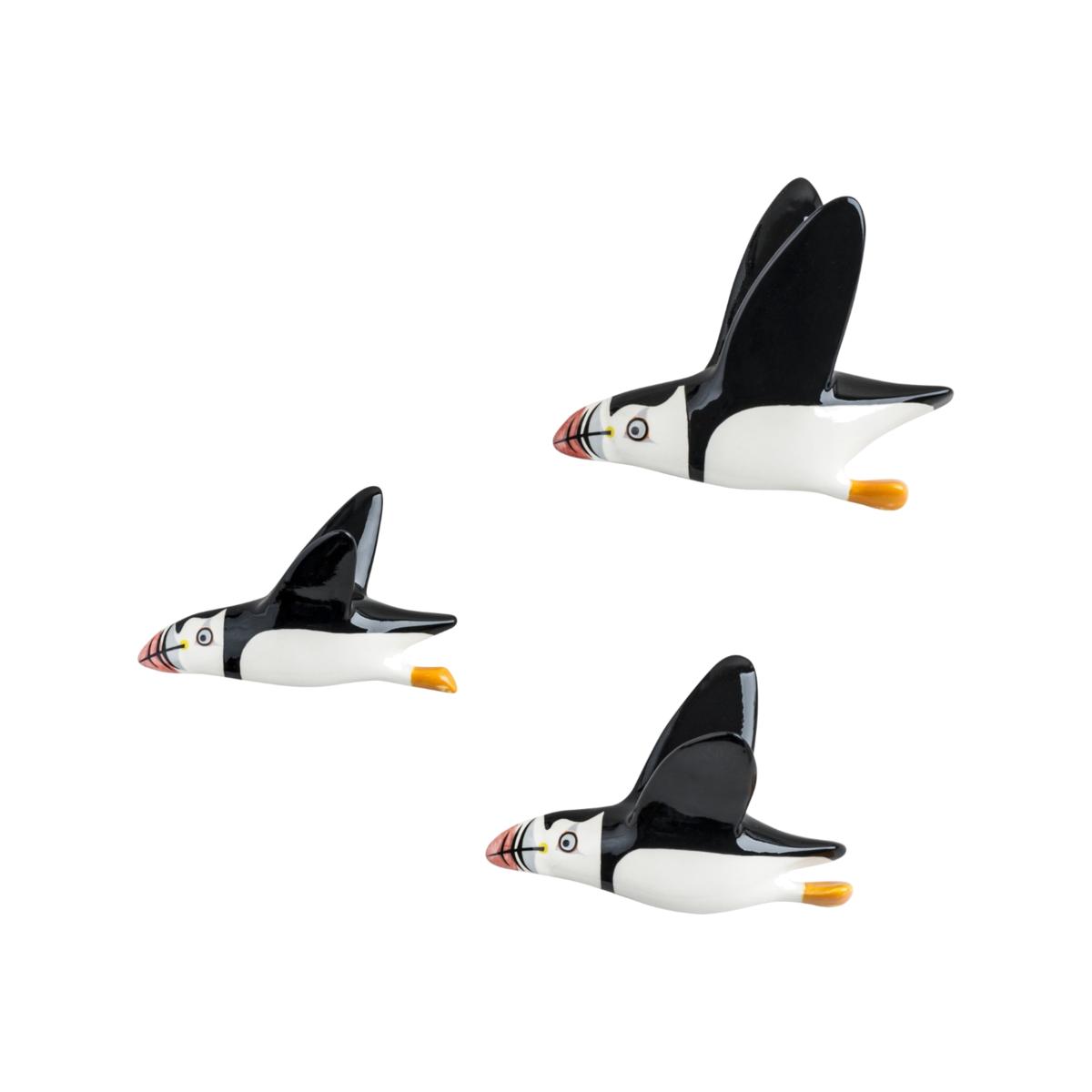 A set of 3 flying Puffins to brighten-up your wall, designed in Bristol by Hannah Turner and lovingly handmade in Sri Lanka This flying set have the characteristic large puffin beaks and beautiful beady blue eyes, these Puffins will delight all Puffin fans and are the latest addition to Hannah's Puffin family of gifts. Each set sold will include a donation of £5.00 to the RSPB for Puffin Conservation, as they are now an endangered species in the UK. The set comes beautifully packaged in a recycled card gift box. 17cm, 16 and 14 cm long Handmade from stoneware ceramic with a decal decoration.