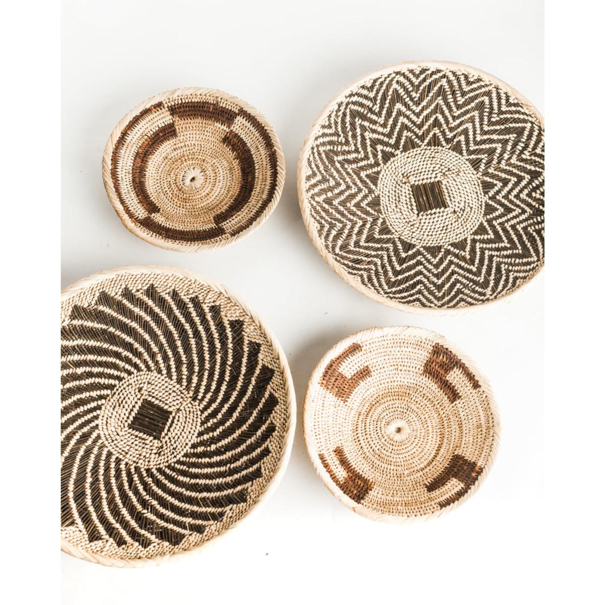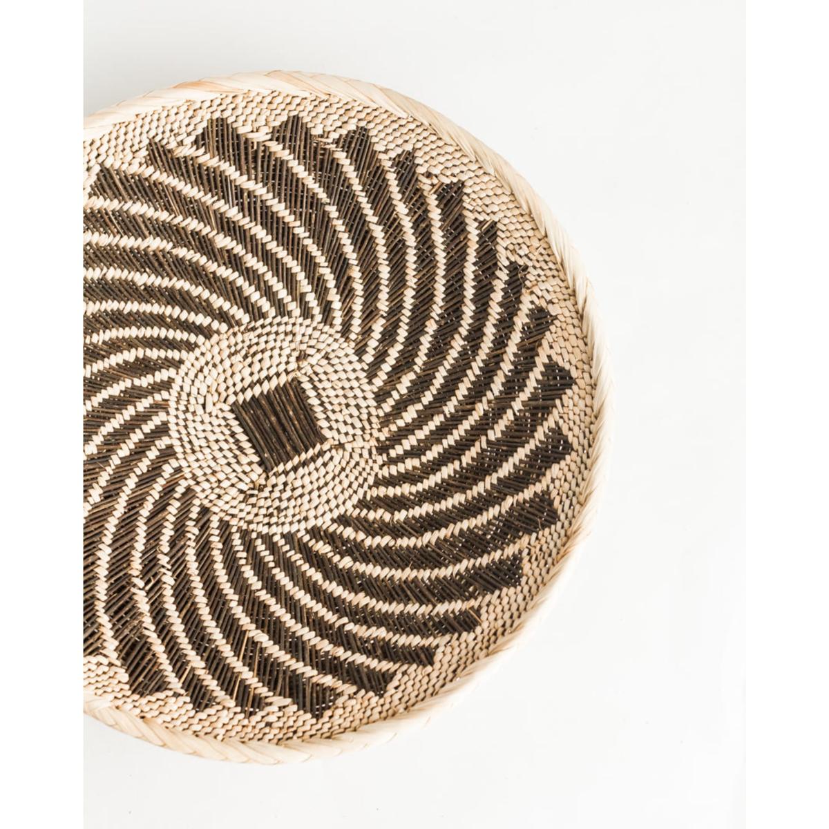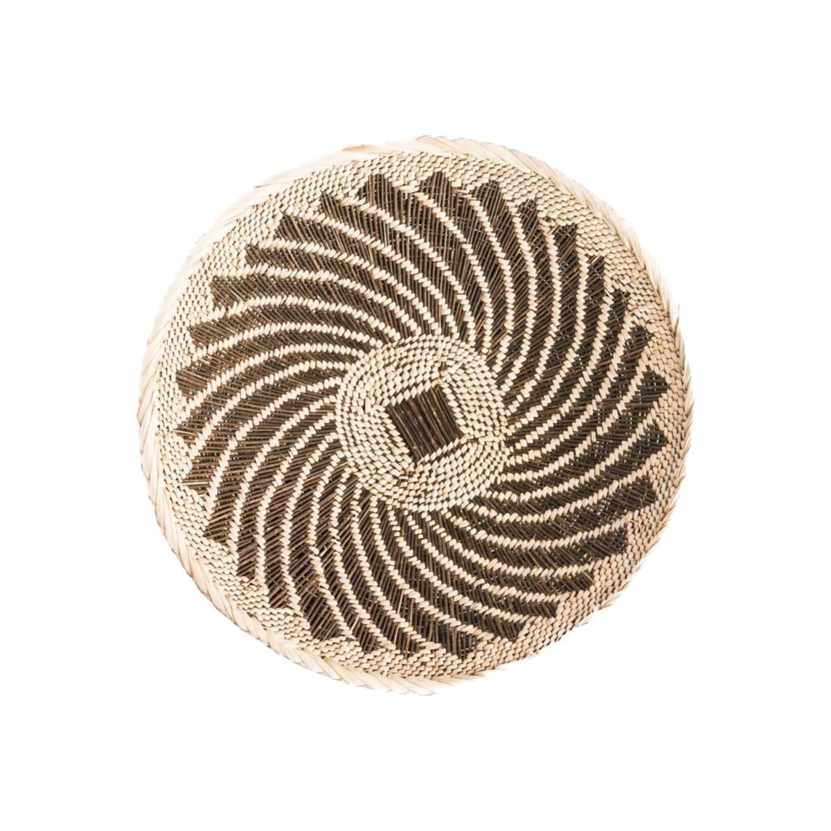 This striking 18 inch basket comes from an area of Zambia renowned for its distinctive weaving style and skill. Palm leaves are dried in the sun and then colored with natural dyes to achieve a rich dark brown hue. Use this basket to decorate your walls or as an eye-catching tabletop centerpiece. Each basket is slightly unique and takes days to make. Please note that, due to the handmade nature, there may be slight variations in size and design. The plant-based dyes used in this item may have a mild odor that will fade within a few days. Measures 18 inches in diameter. Ethically made in Zambia.