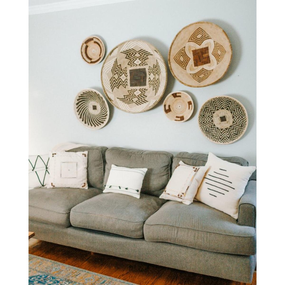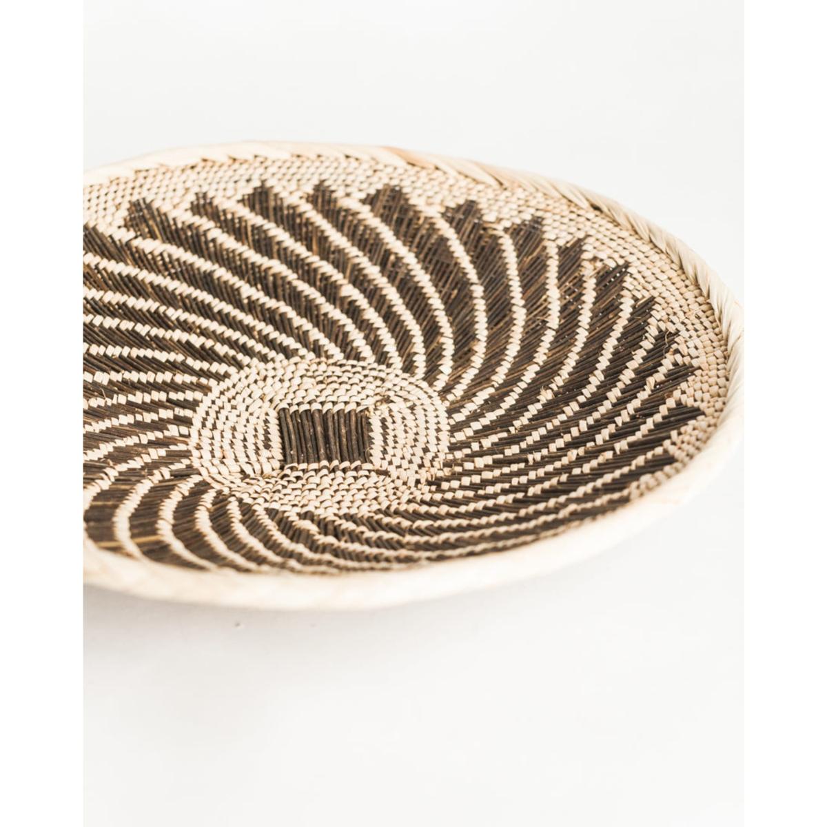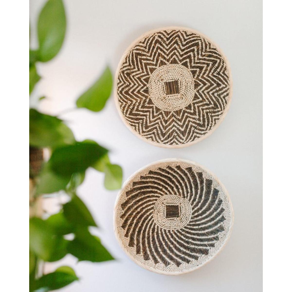 This striking 18 inch basket comes from an area of Zambia renowned for its distinctive weaving style and skill. Palm leaves are dried in the sun and then colored with natural dyes to achieve a rich dark brown hue. Use this basket to decorate your walls or as an eye-catching tabletop centerpiece. Each basket is slightly unique and takes days to make. Please note that, due to the handmade nature, there may be slight variations in size and design. The plant-based dyes used in this item may have a mild odor that will fade within a few days. Measures 18 inches in diameter. Ethically made in Zambia.
