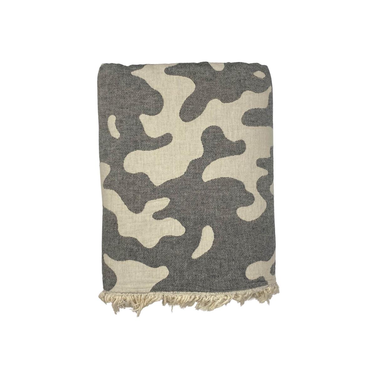 Cosy cotton throw blanket with a snuggly fleece lining on the reverse. The all-over mottled design is inspired by camouflage detailing with a hint of cow print. Superbly versatile - perfect for adding extra bedroom layers, keeping cosy on a sofa or keeping the chill at bay outdoors. Machine washable at 40 degrees Line dry or tumble dry on low setting Do not iron Composition: 100% Cotton with fleece lining (100% polyester)