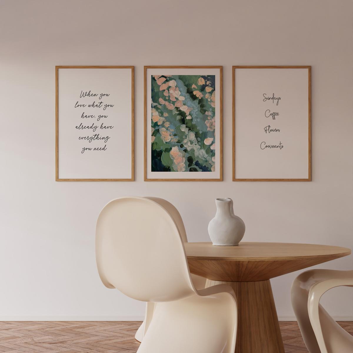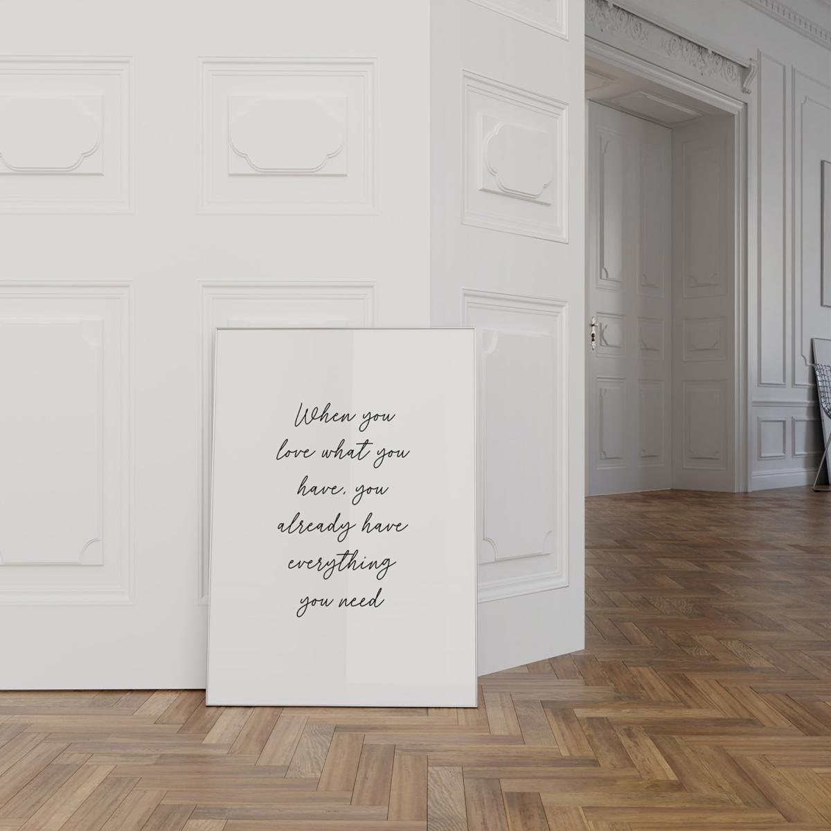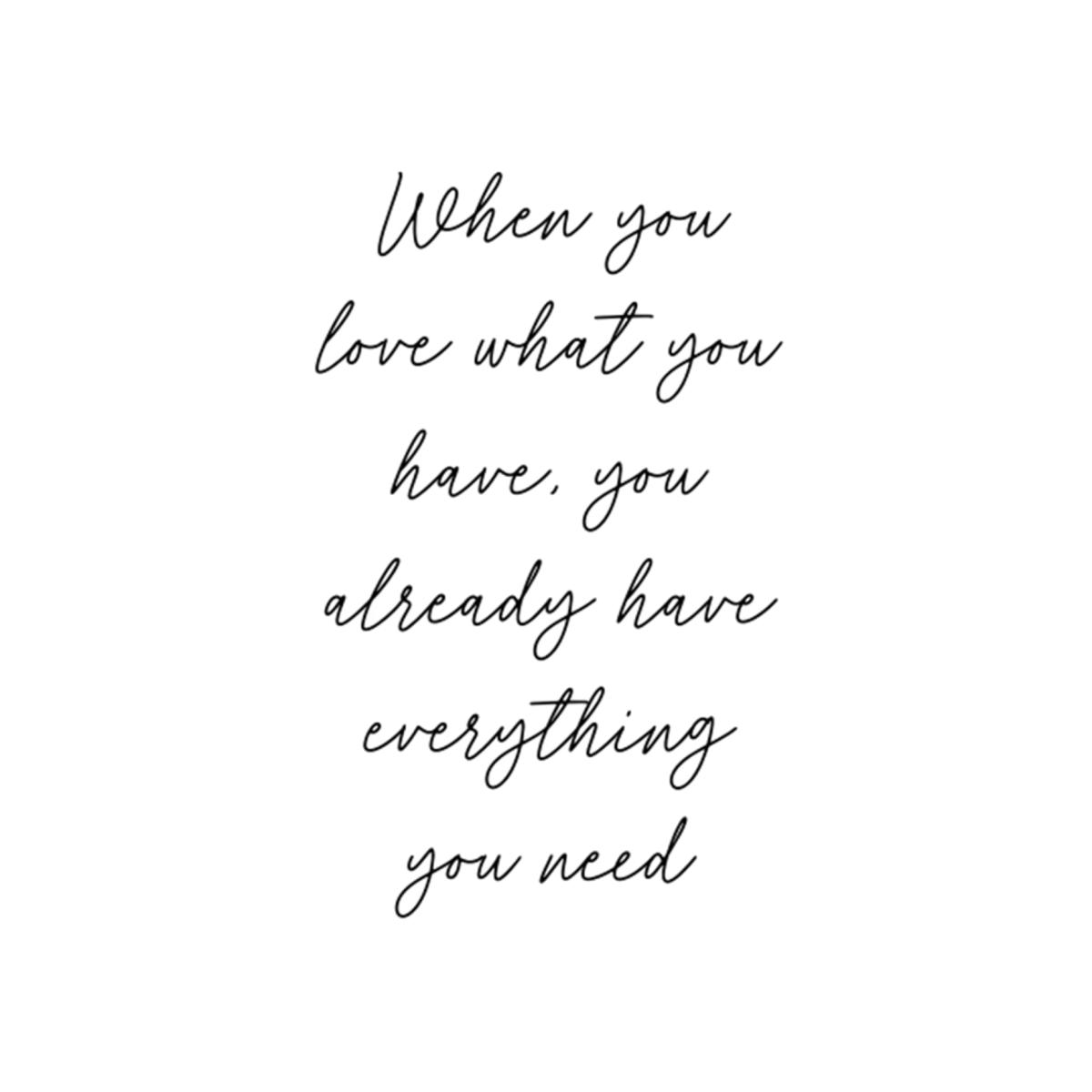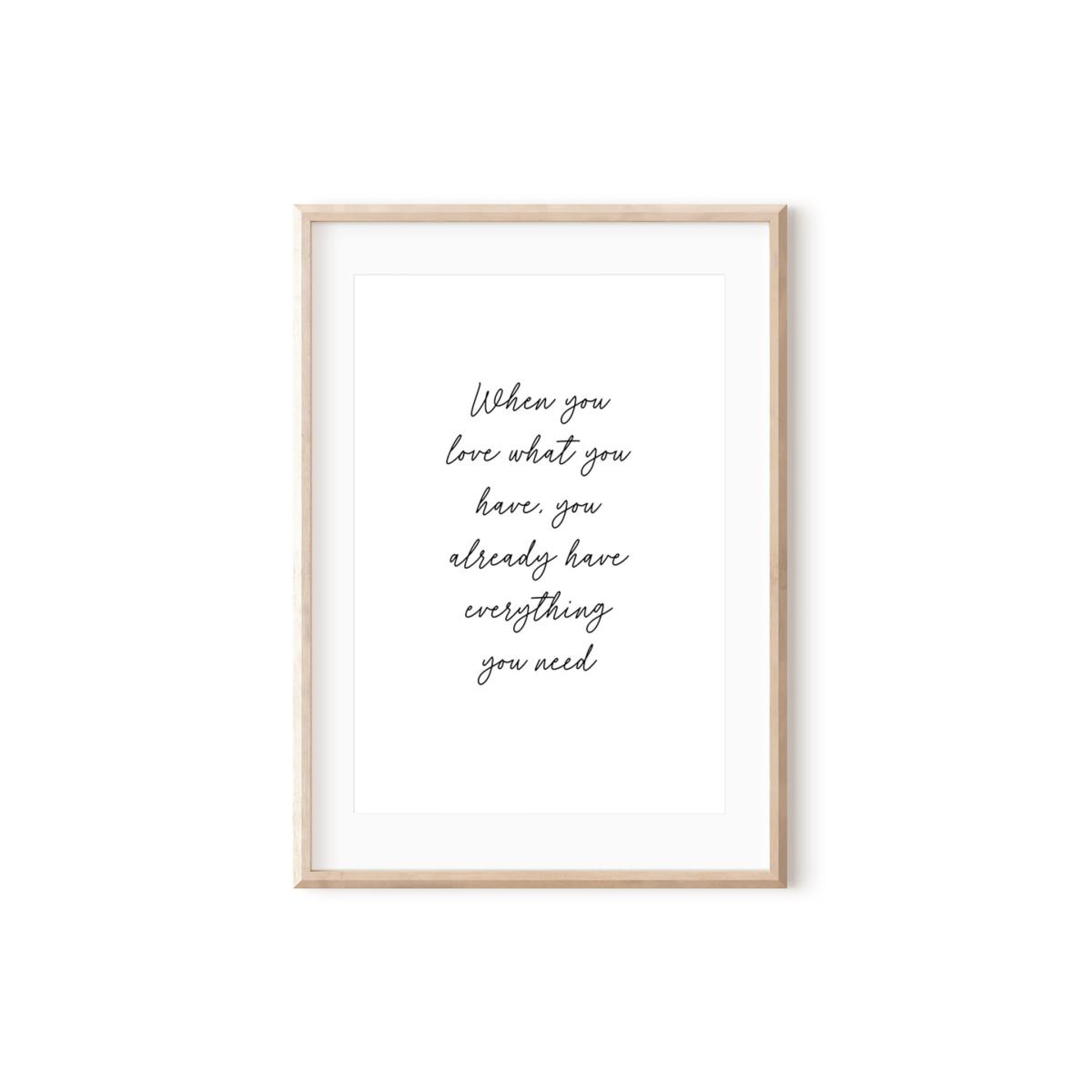 "When you love what you have, you already have everything you need" The perfect piece of artwork to add a contemporary, delicate and timeless update to your home. This design is A2 in size so will add impact and balance to your home environment. Also a perfect gift for a partner or friend, this print is the perfect addition to any home. Printed on heavyweight 220gsm smooth paper using luxury quality inks and printing, these A2 giclée prints will maintain their beautiful clarity.