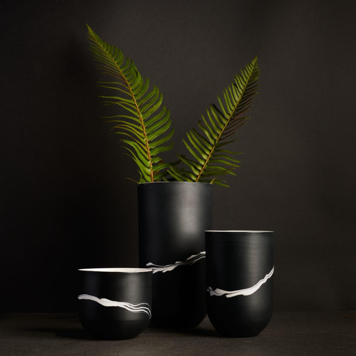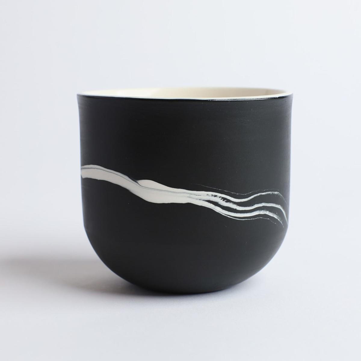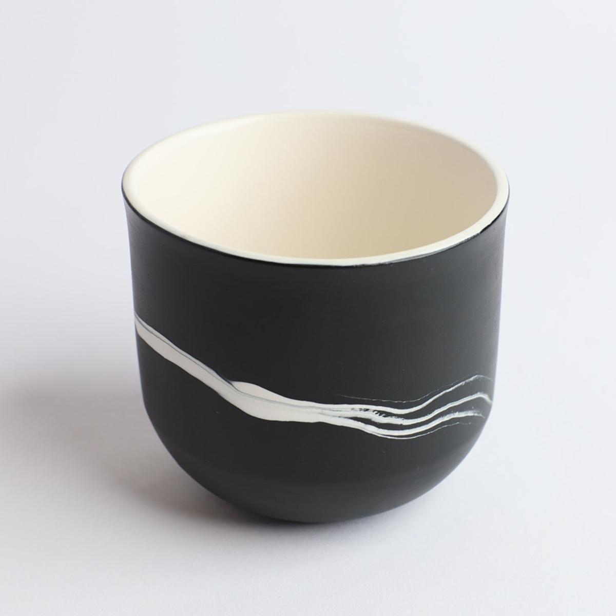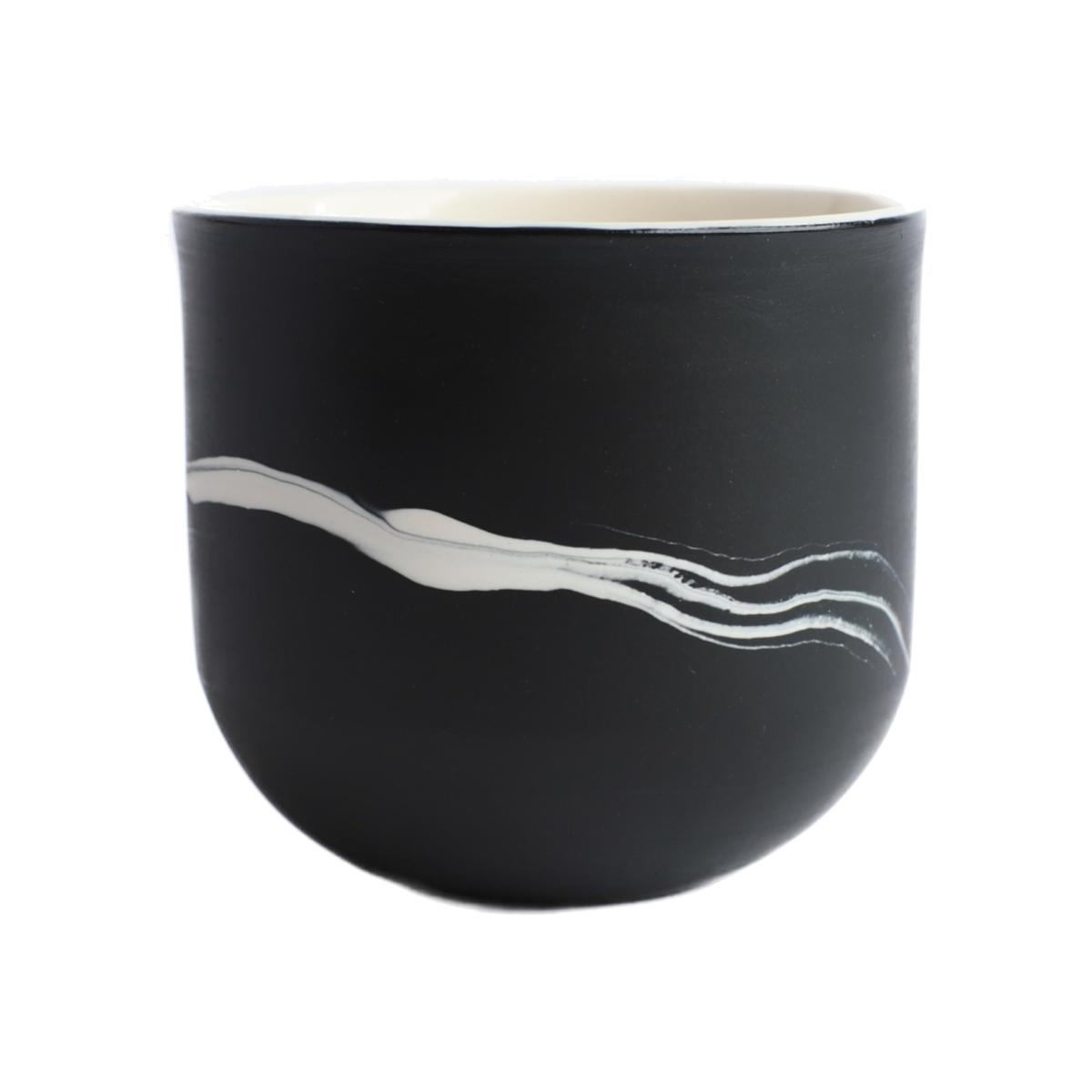 Marbled porcelain vessel / candle holder. Approximately 5 inches tall — beautiful complement to other pieces. Can also be used as a small vase, planter, candle holder, or decorative bowl. Its flexible role is part of its charm. Clear glazed interior, lusciously smooth hand-sanded exterior. Dishwasher safe. Due to their handmade nature, the swirl designs will vary, and tops may be slightly oval (not perfectly round).
