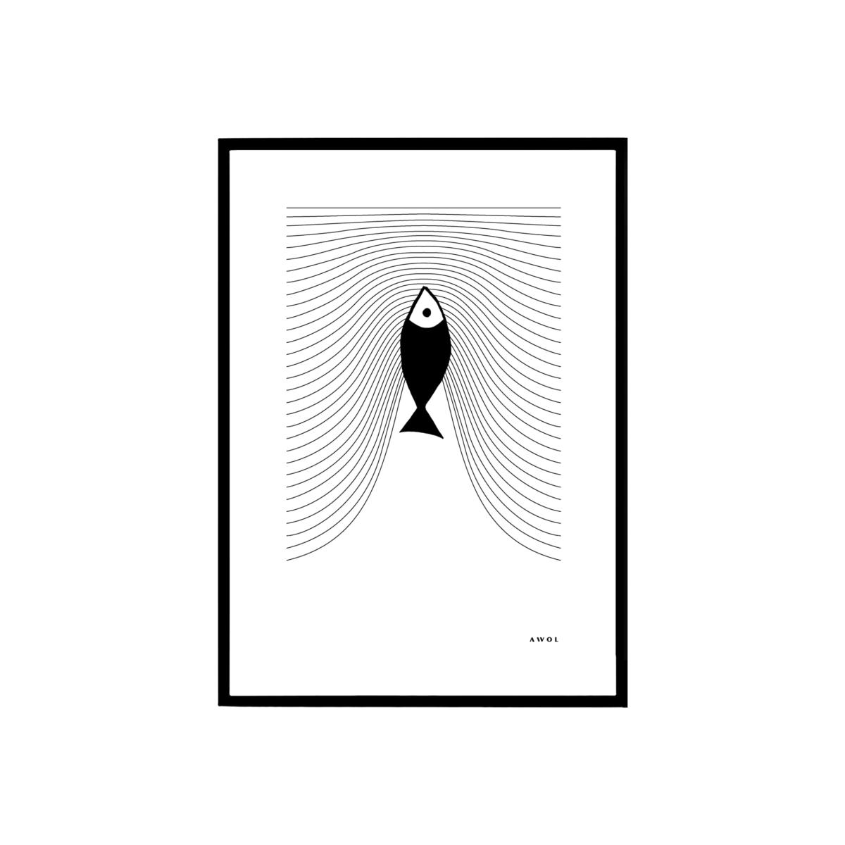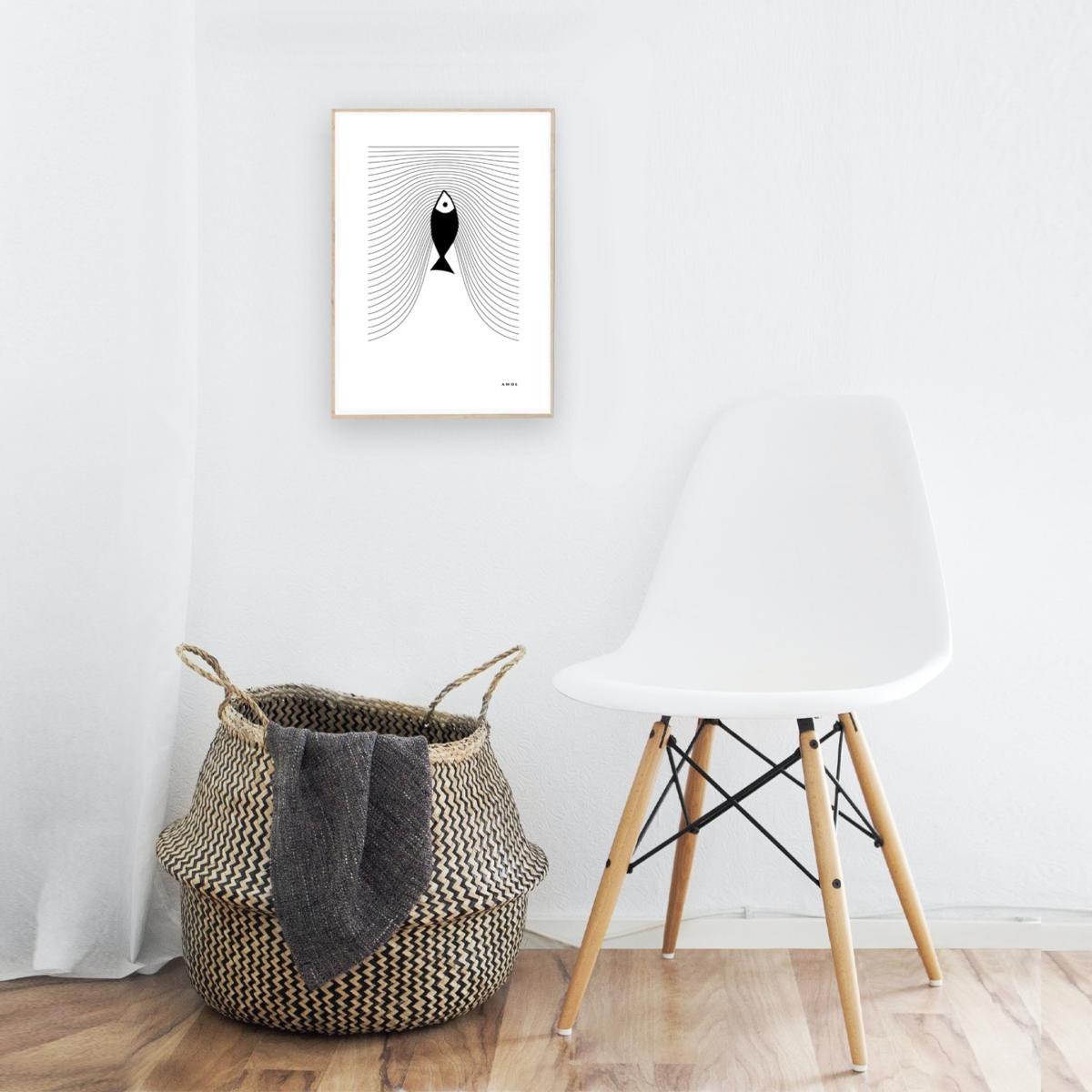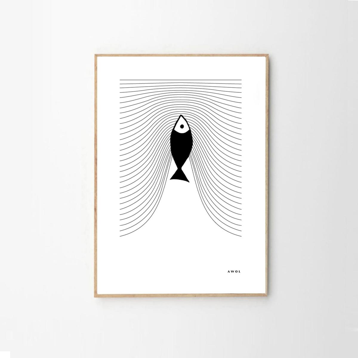 The Plenty Of Fish In The Sea art print is a minimalist, black and white fish illustration featuring an abstract sea pattern made of lines, and a Scandinavian fish swimming upstream. The artist has long been fascinated by the simple, geometric shapes of fish, encountered in real life or in art, and the rich symbolism across cultures: prosperity, curiosity, freedom, fluidity and strength, courage, patience, and success, among many others. This fun and playful monochromatic fish art print is part of an abstract series of three graphic black and white fish triptych, creating a fun and modern nautical decor for any room. Also a great gift for your single friends looking to catch the perfect fish :)