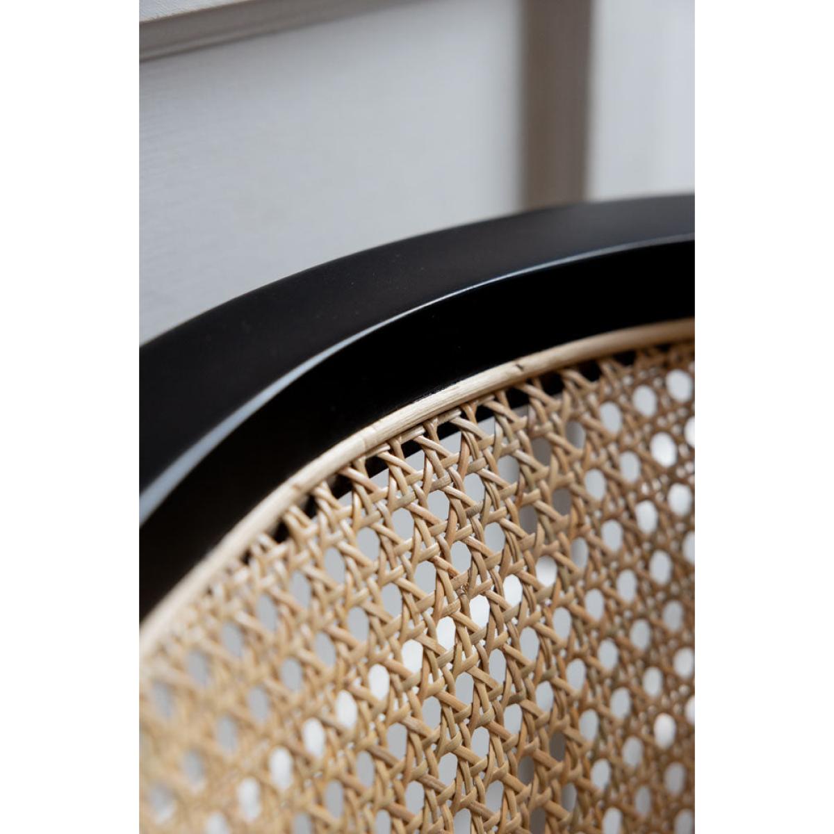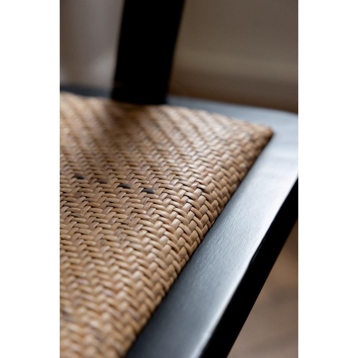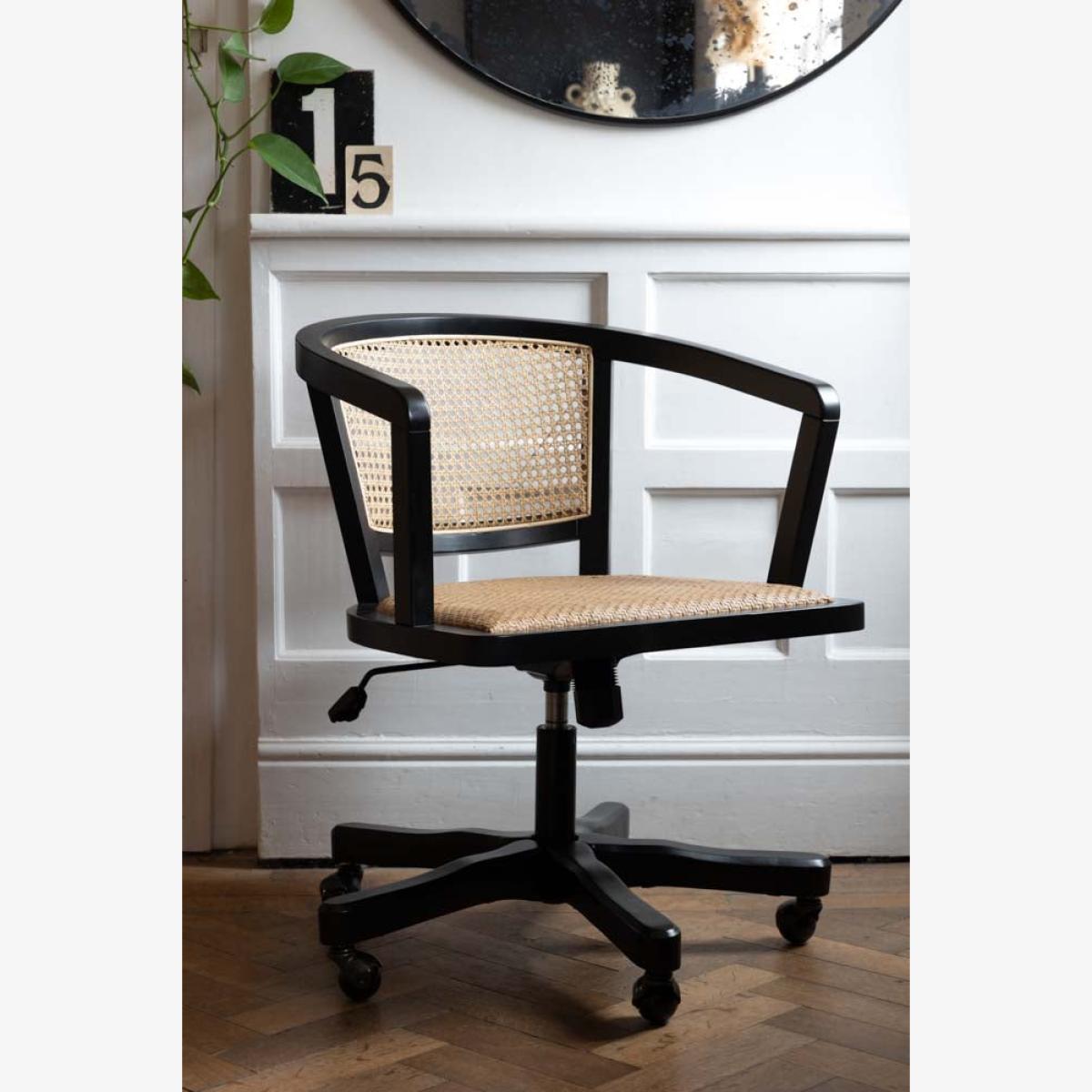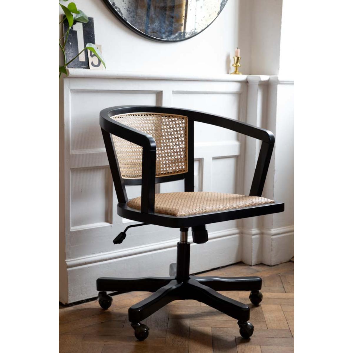 <!--td --> This elegant chair perfectly balances a modern interior with a boho vintage aesthetic, making it an ideal addition to any workspace in need of some chic functionality. The chair’s frame is crafted from wood with a sleek black finish, exuding a sense of sophistication. While the natural wood-coloured wicker back and seat evoke a feel of vintage flair. Equipped with a smooth swivel mechanism, this chair is designed for versatility, allowing you to move freely around the workspace. Whether aiming to add elegance to your home office or searching for the most stylish chair in your workplace, the Black Swivel Desk Chair is the perfect choice to blend modern sleekness and vintage style. - Black Wicker Swivel Desk Chair - Measures: H80cm x L60cm x W60cm - Material: Birch Wood & Rattan - Can carry up to 100kg