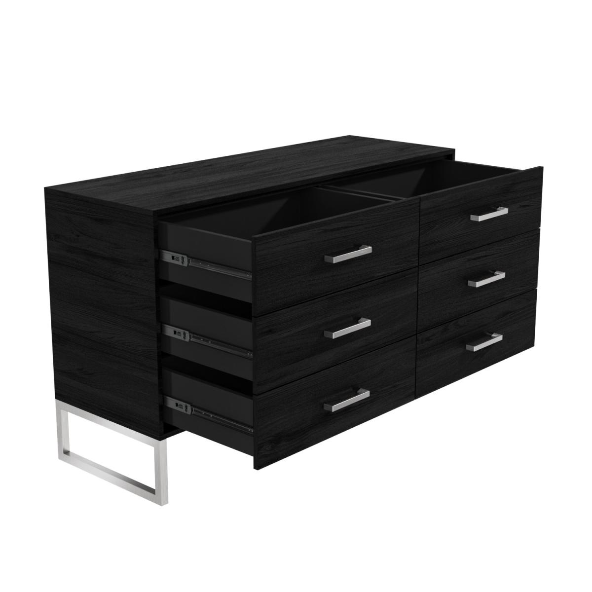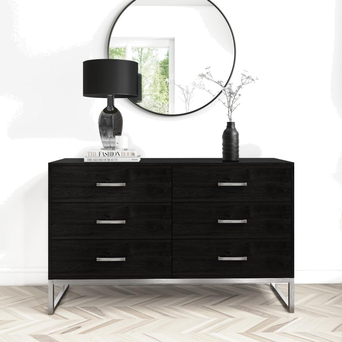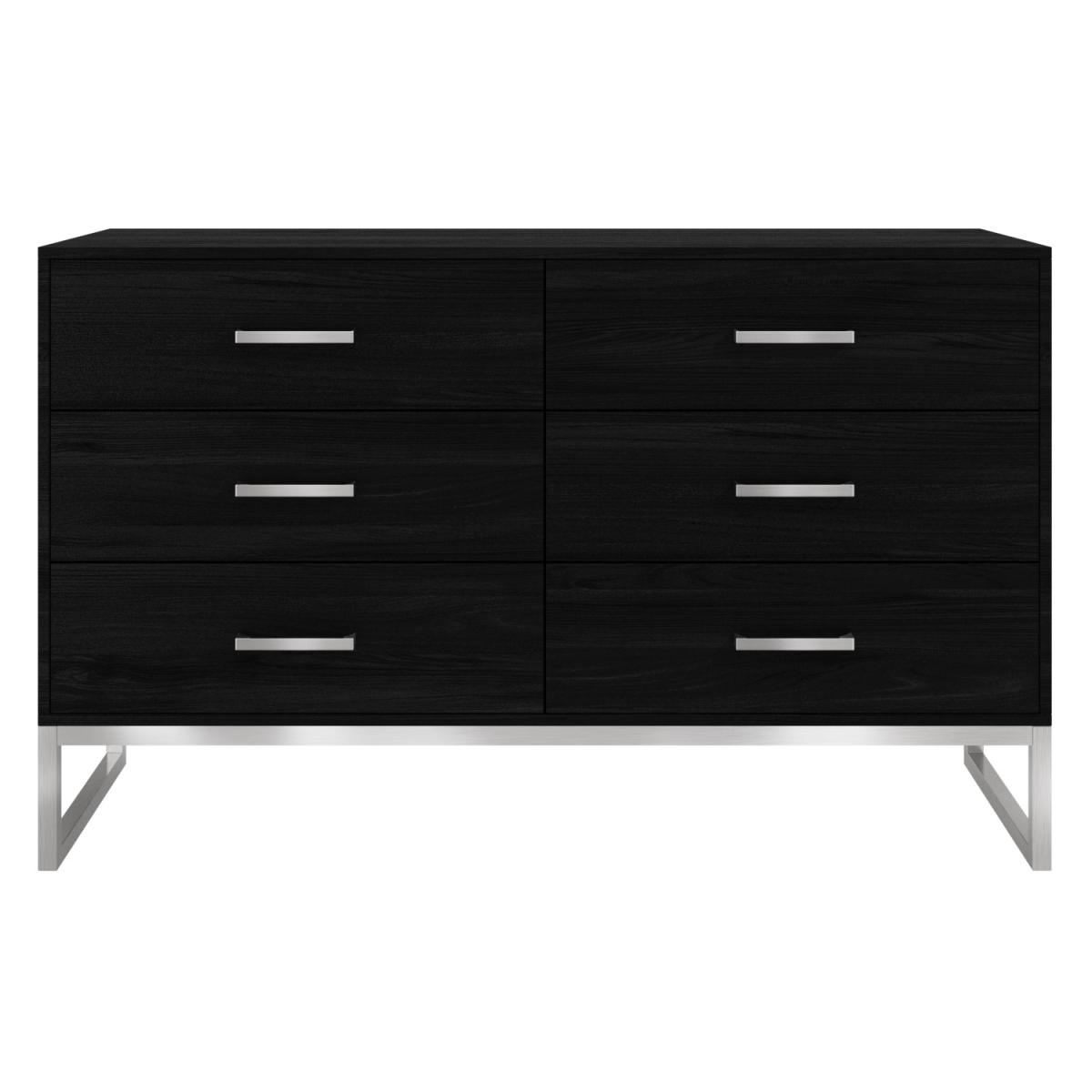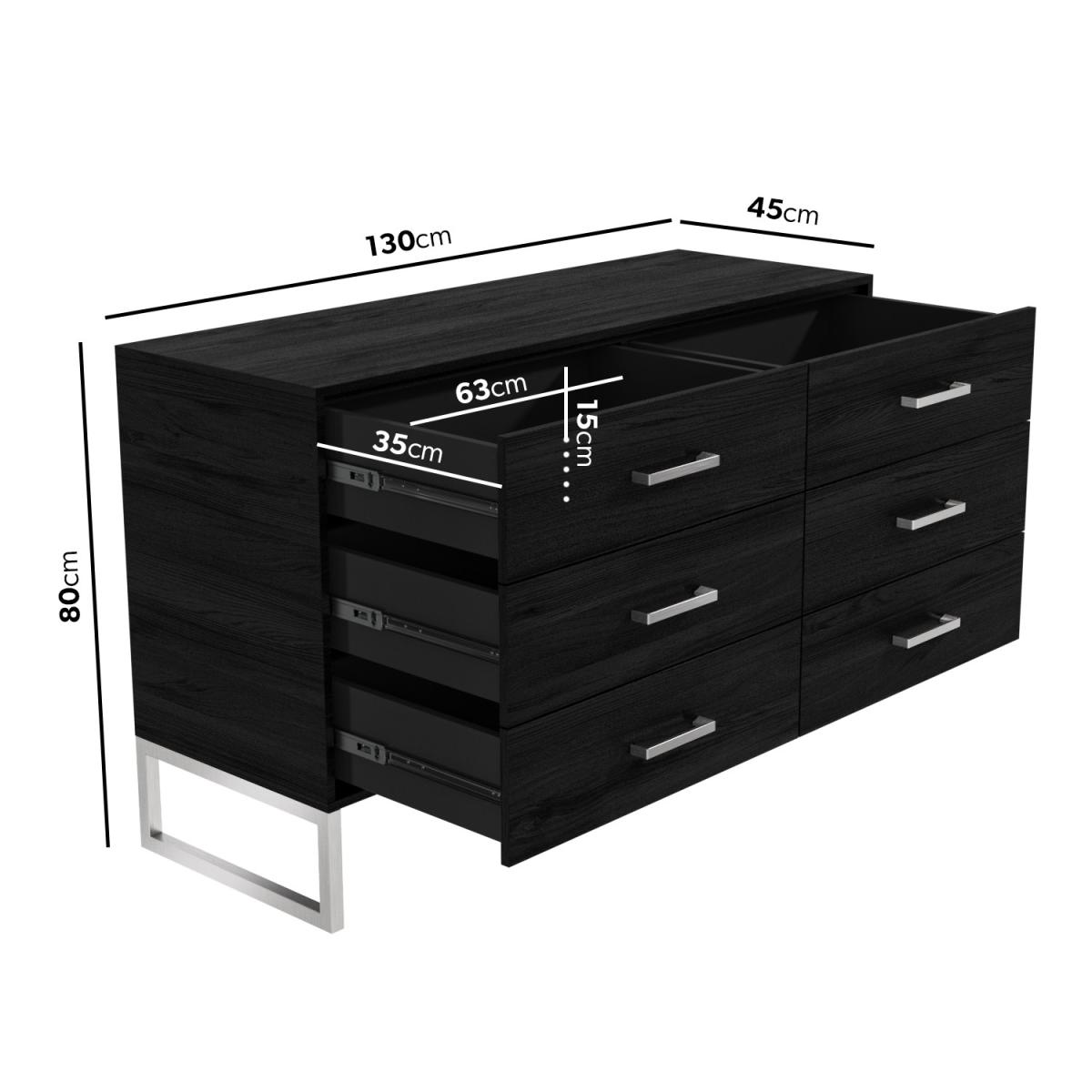 Black solid wood wide chest of drawers Six drawers provide ample storage space Silver frame base adds a modern touch Sleek design complements any bedroom or hallway Assembly required Need to know Number of drawers: 6 Weight: 57kg Colour: Black Finish: Light brush Material: Solid pine and stainless steel Runner type: Full-extension ball bearing runners Assembly required: Yes