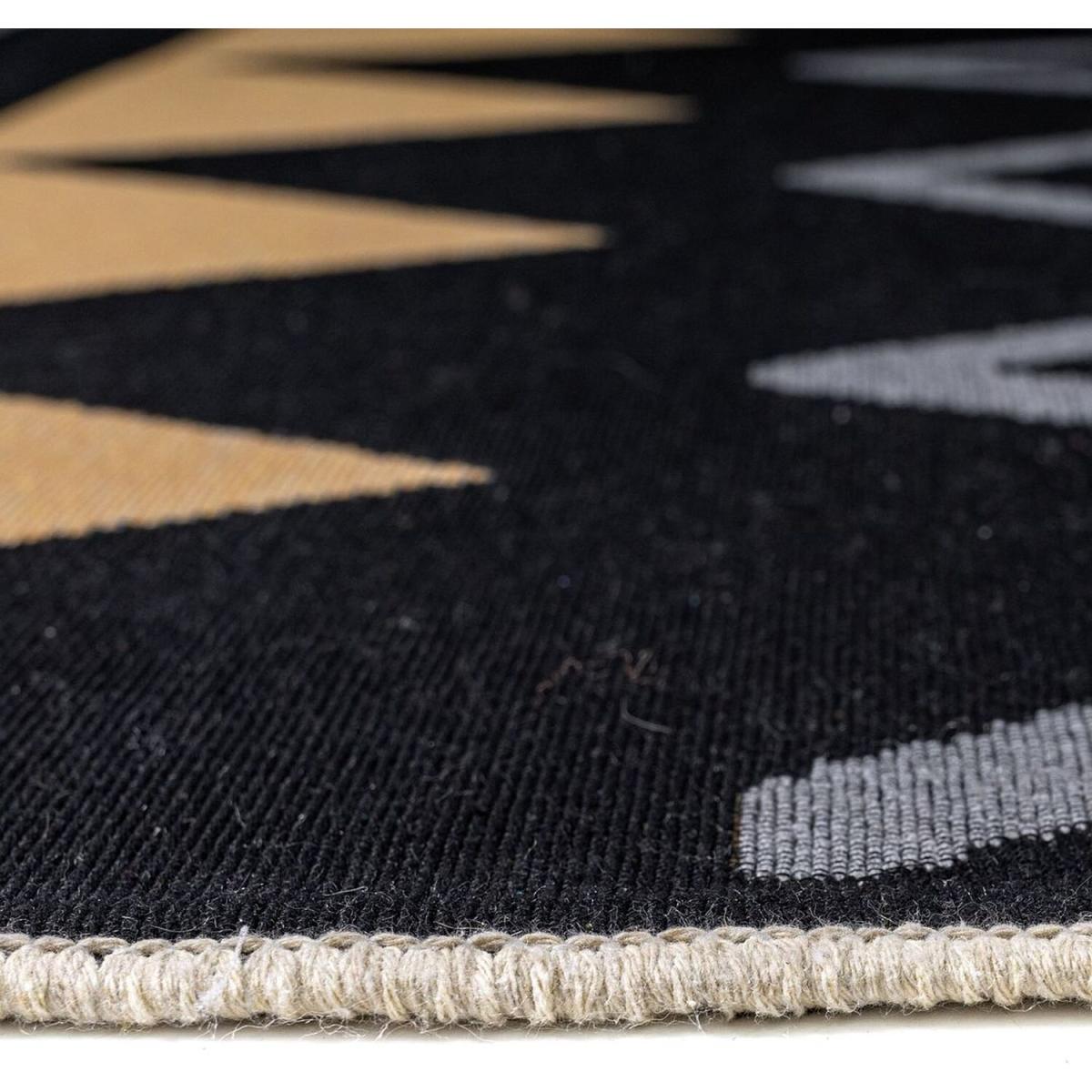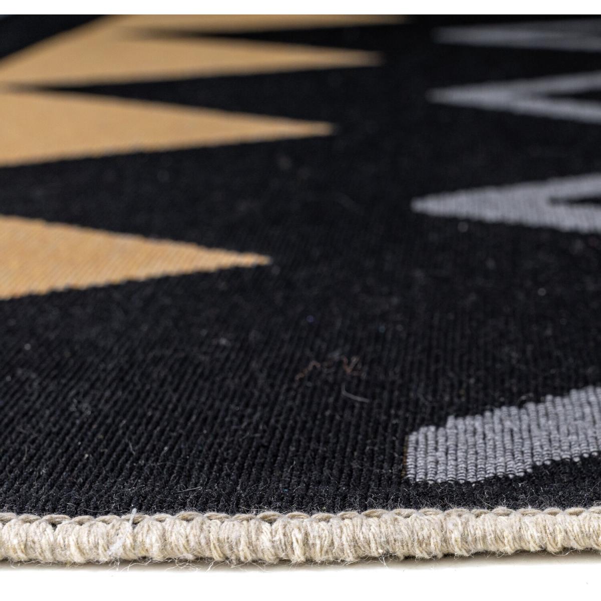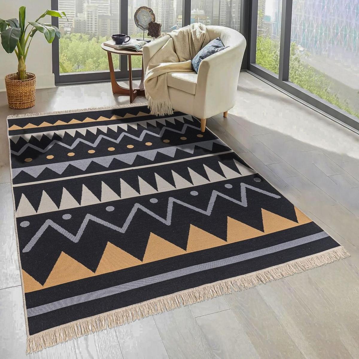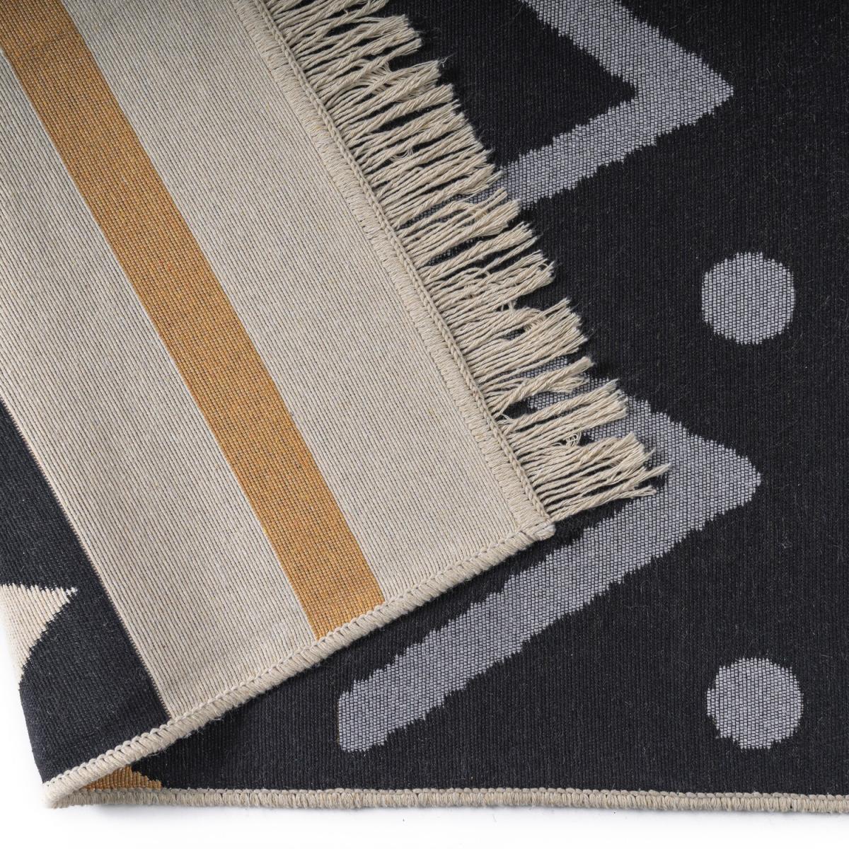 Black with Ochre Tribal Fringed Flatweave Rug - Azteca - Black / Gold / 120cm