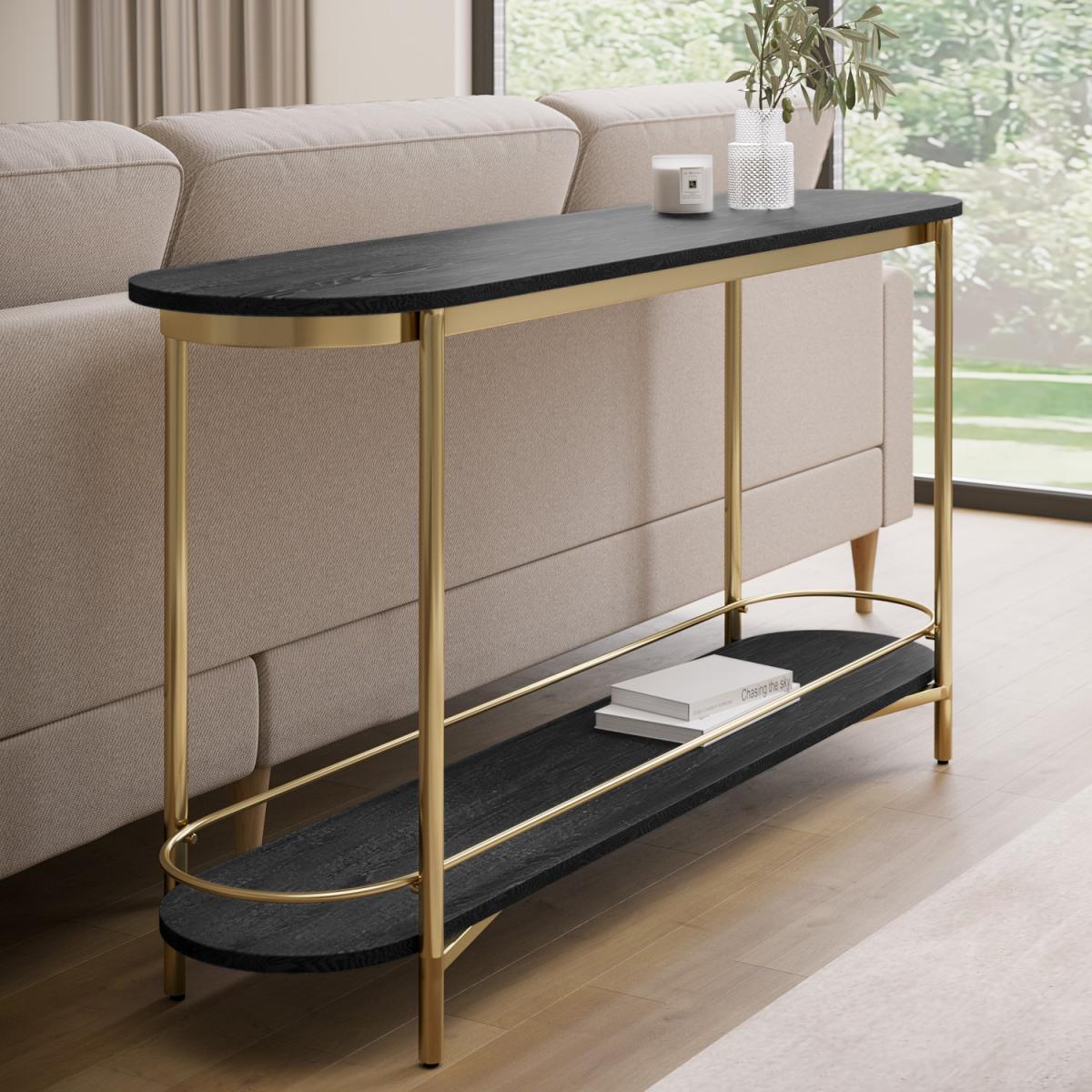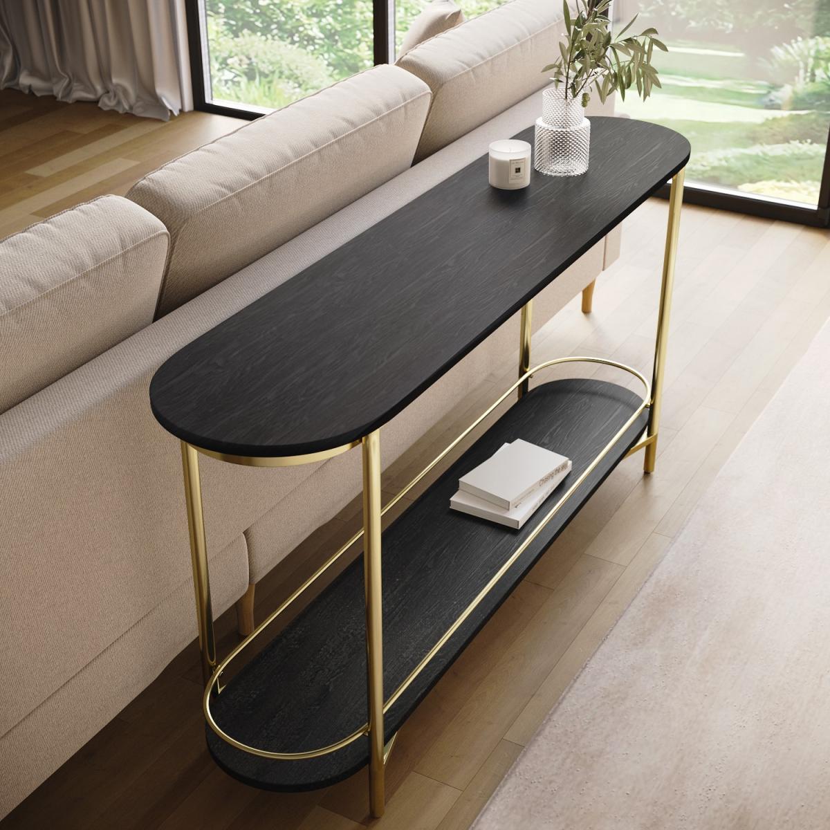 All about me The Myla extra-large sofa table is stylish and versatile, it can also be used in a hallway as a console table. It's perfect for open-plan living, and there's plenty of space to display decorative items on the top, plus a bottom shelf for extra storage space. The gold legs complement the black wood beautifully for a modern finish. Need to know Dimensions:W150 x D35 x H74 cm Weight: 19 kg Maximum supported weight: 100 kg Colour:Black and gold Finish: Painted and gold-plated legs Material:Ash Veneer and metal legs Assembly required: Yes Packaging dimensions: W162 x D84 x H14 cm