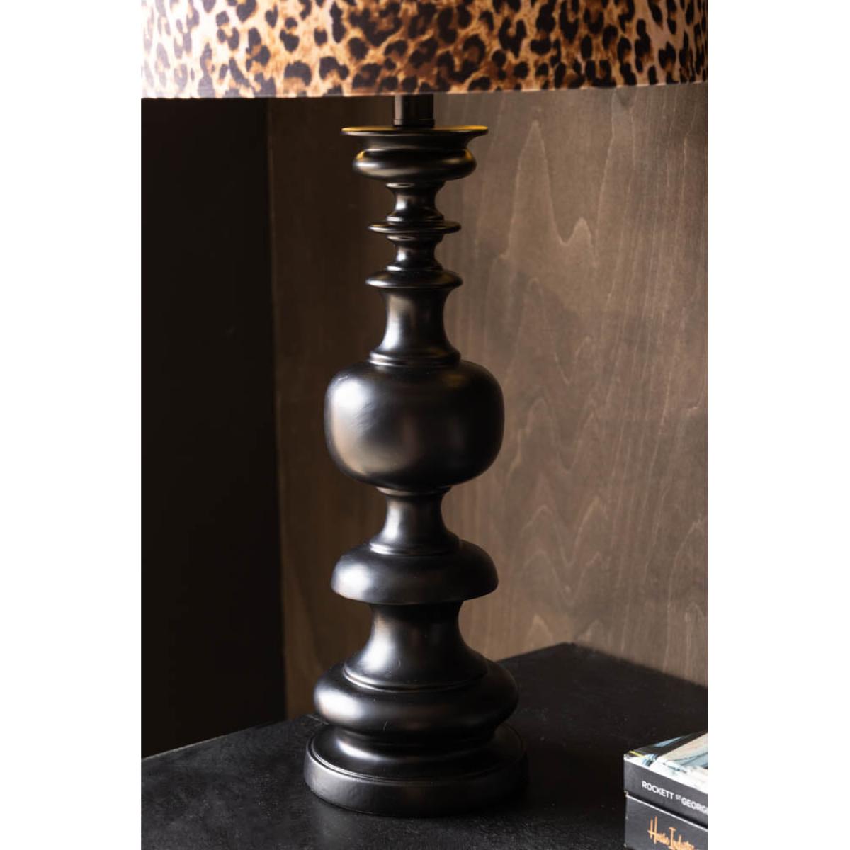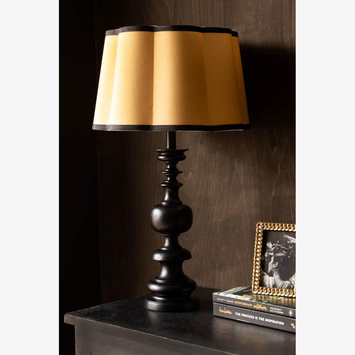 Woodturning is a fantastically creative process that involves mounting a piece of wood on a lathe and shaping it with sharp tools as it rotates. It's a process that allows designers to create intricate detailing, such as these sumptuous curves, on the lamp base. This piece is made from resin, and finished in a black matt lacquer, but echoes the sentiments of a traditional wood-turned piece perfectly. It works wonderfully in a Scandi, more minimalist space, or rustic settings alike. Its curvaceous beauty brings a feeling of opulence to your living room – style on a sideboard or hallway console table to bring a touch of luxe to your surroundings. The perfect soft lighting solution for timeless elegance. Please note lampshade is sold separately. - Black Wood Turned Table Lamp Base - Measures: 61x33x30cm- Material: Resin - Styled with: Parchment & Black Scalloped Lampshade - Turns on and off with a rocker-switch mechanism