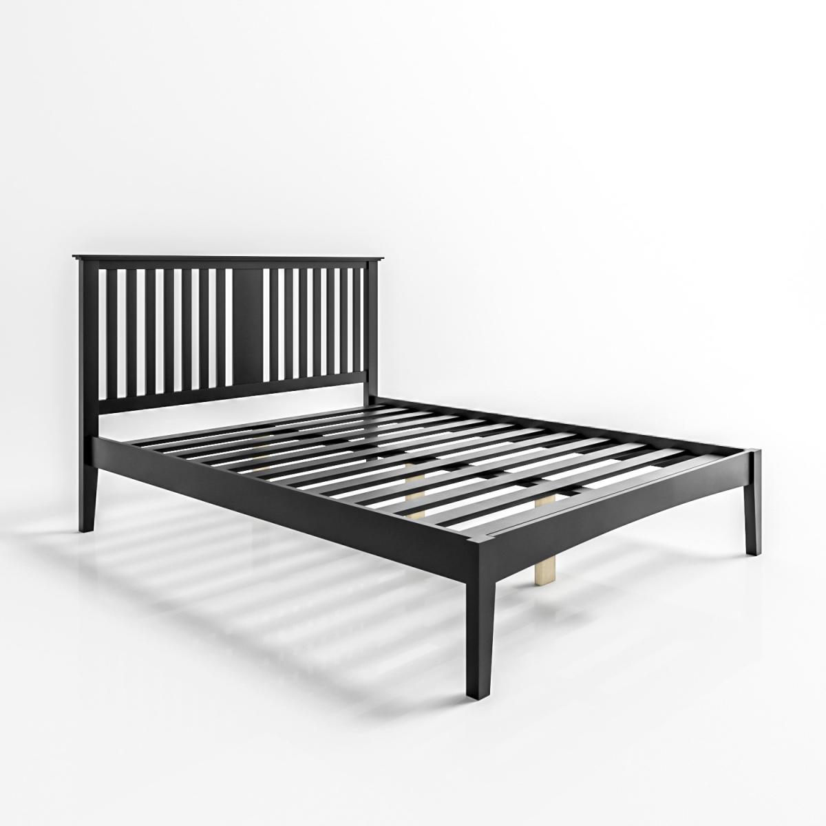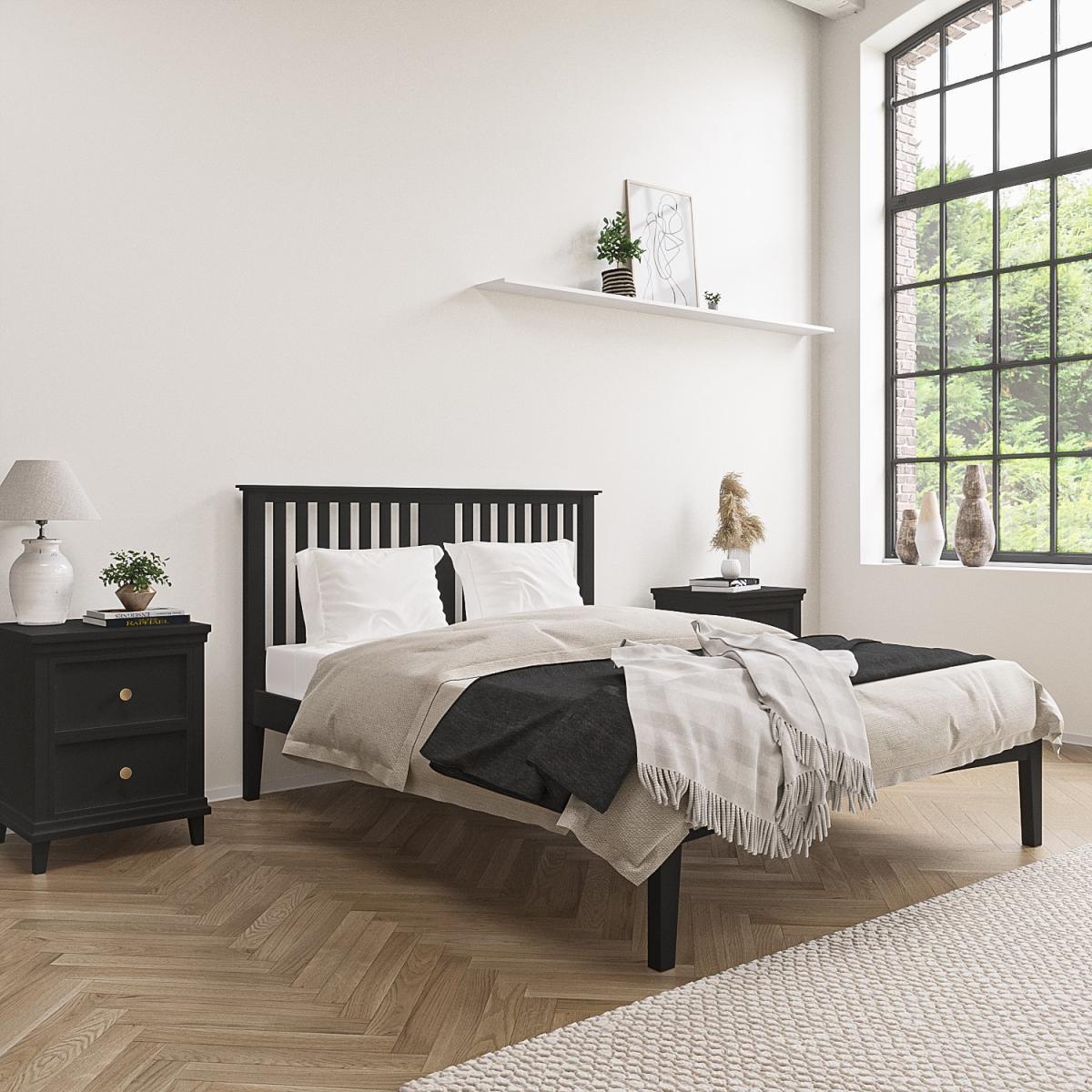 Features we love Blacksolid wood bed with headboard and tapered legs Modern-classic style with amodern blackpainted finish Wooden slat base with a central leg support Generous space underneath for underbed storage Fits into any bedroom with its timeless appearance All about me This Charlie king-size bed makes a timeless addition to any bedroom thanks to its contemporary black painted finish and classic design, making it match well with existing bedroom furnishings. It's a premium build too, with a hard-wearing wooden frame and a wooden slatted base, you'll have assured mattress support. This bed fits a UK standard king size mattress which isn't included, giving you the freedom to choose one that's perfect for you. Need to know Dimensions:L209.5 x H111 x W166 cm Bed mattress size: UK King (150 x 200cm / 5ft) Colour: Black Finish: Painted Material: Wood Bed base: Slats Assembly required: Yes Mattresses included: No