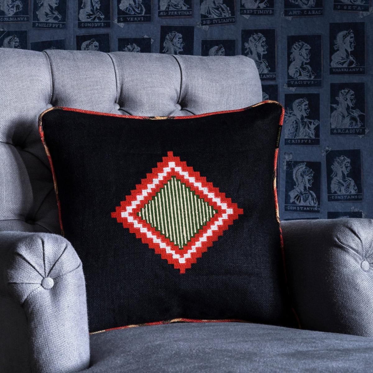 A bold cushion with a large scale Navajo motif embroidered with wool thread on one side and the other side made Navajo heavy linen fabric.