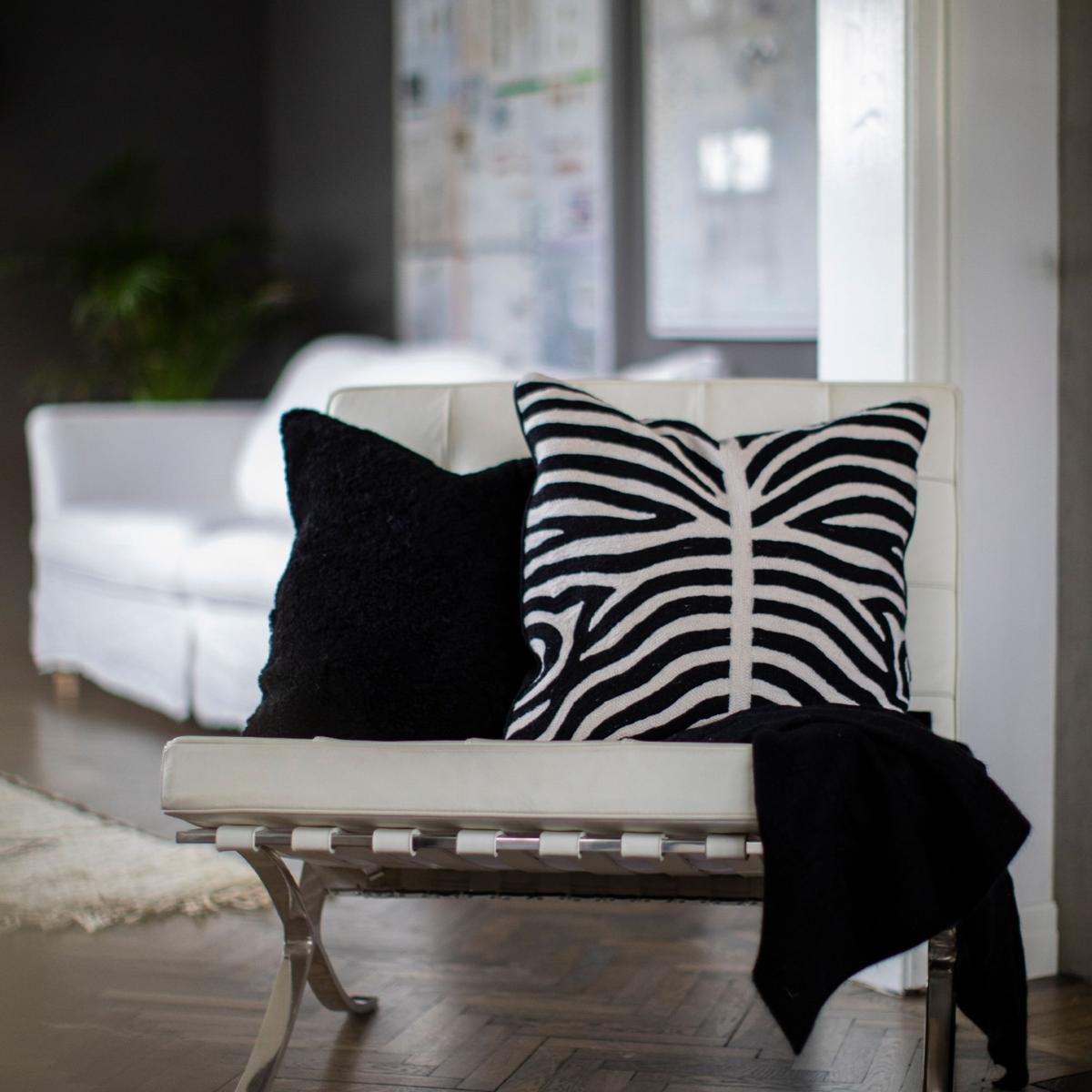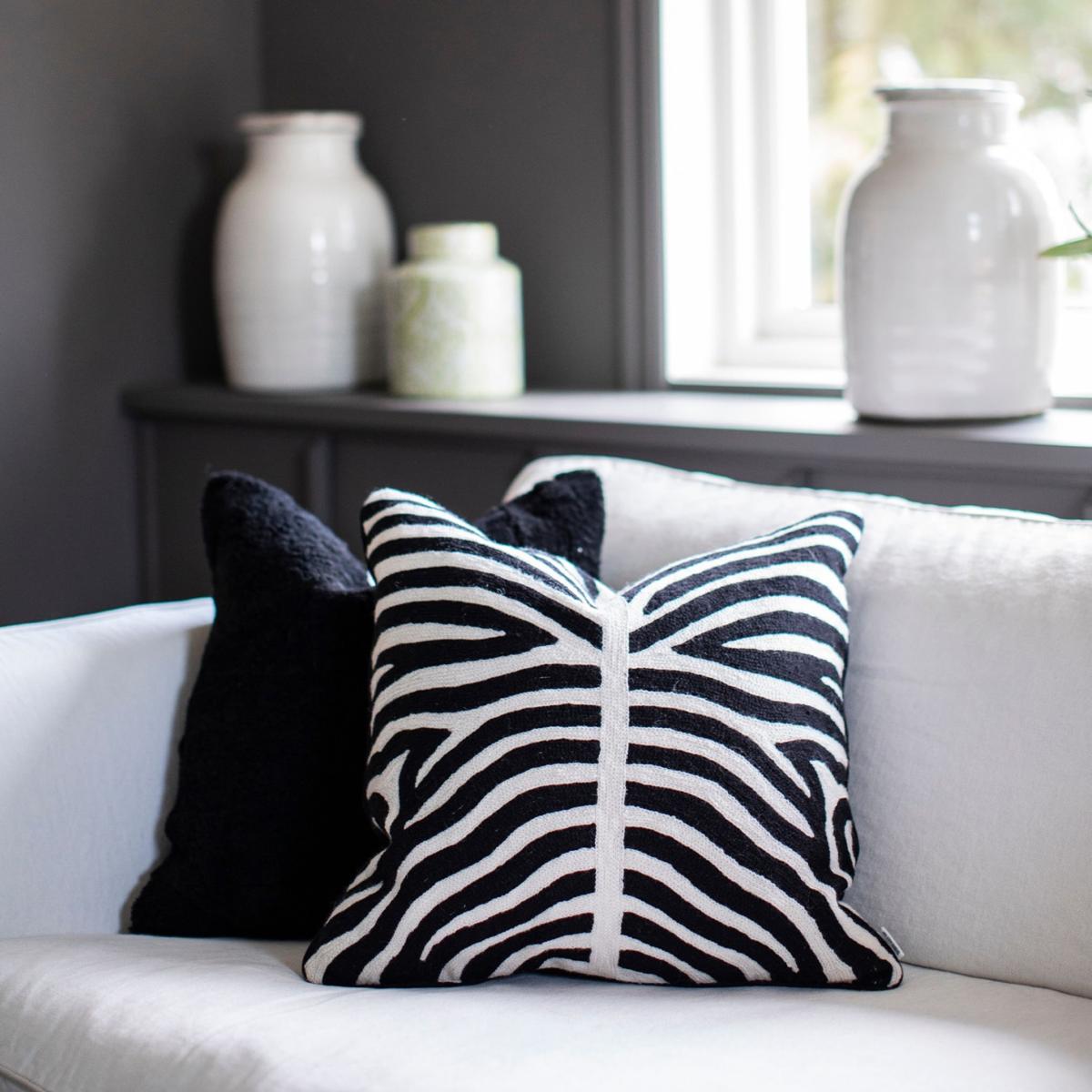 I love this cushion for adding a striking visual element to both modern and eclectic interiors. The black zebra embroidery offers a bold contrast that works well against neutral sofas or bedding, making it a versatile piece. It's ideal for injecting a touch of graphic interest without overwhelming the space. For practical styling, consider pairing it with solid-coloured throws or other textured cushions to create depth. It also works well in monochrome schemes or in a room with botanical accents, where the animal motif can mimic nature-inspired themes. Since it’s embroidered and one-size, it’s a great option for layering or standing out as a statement piece on a chaise or armchair.