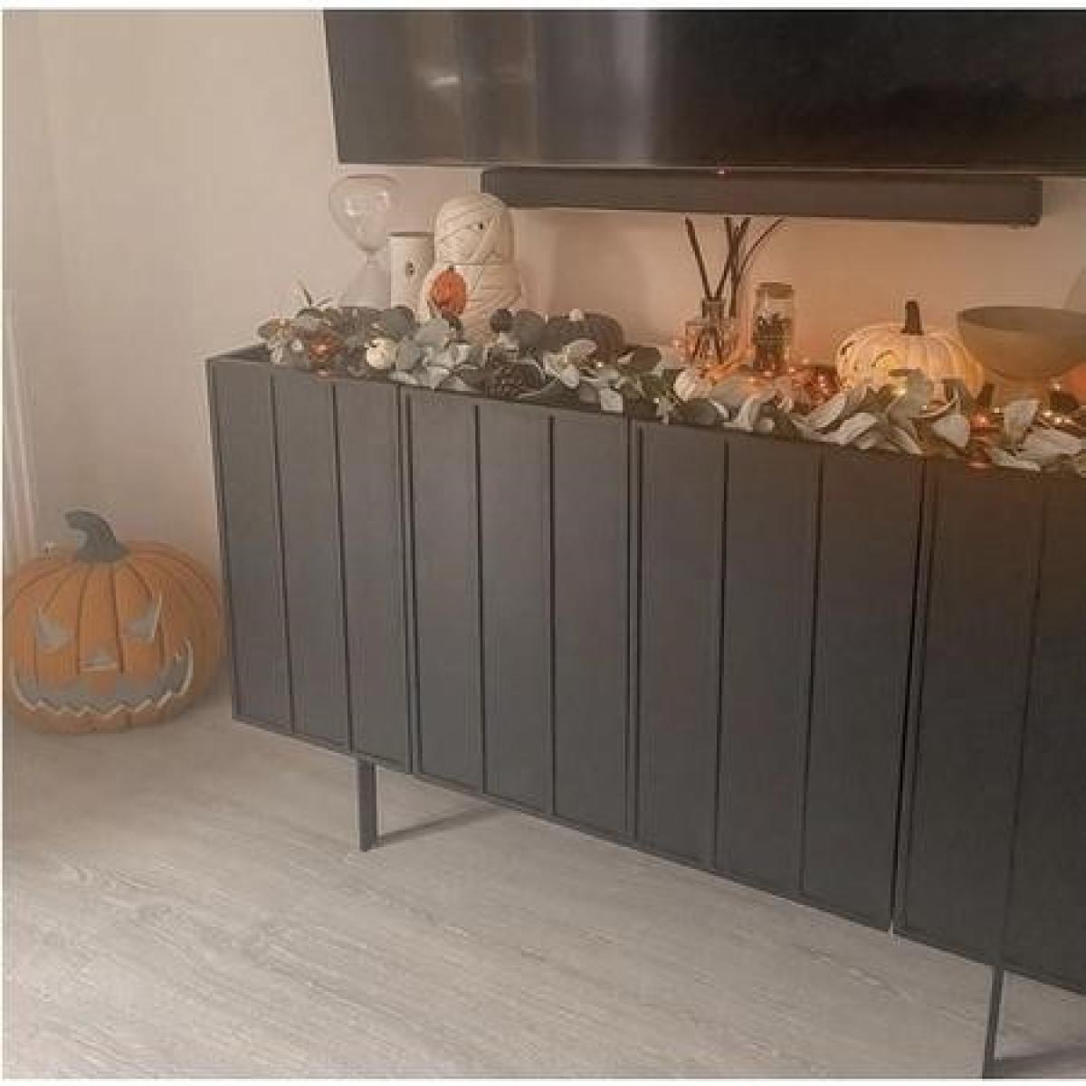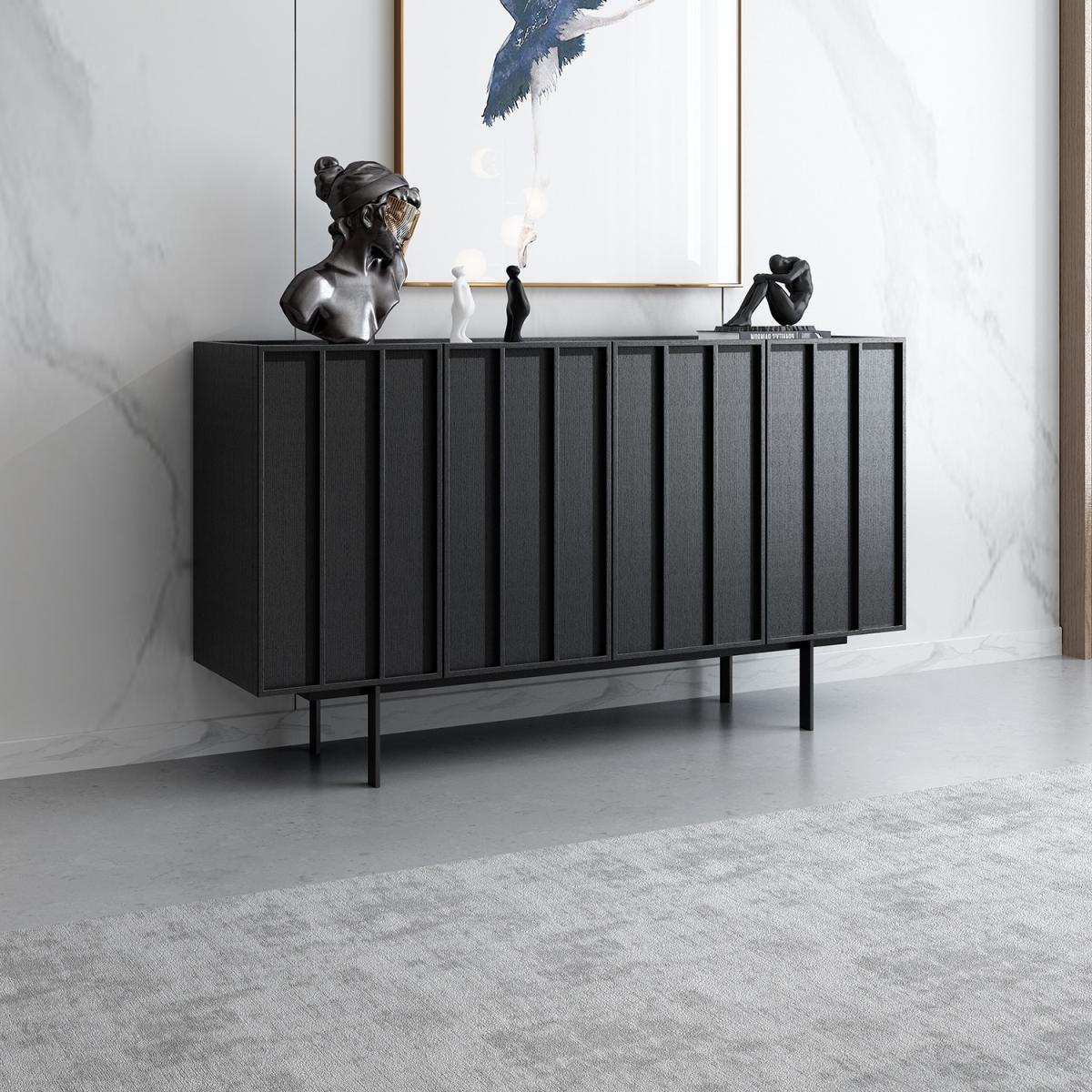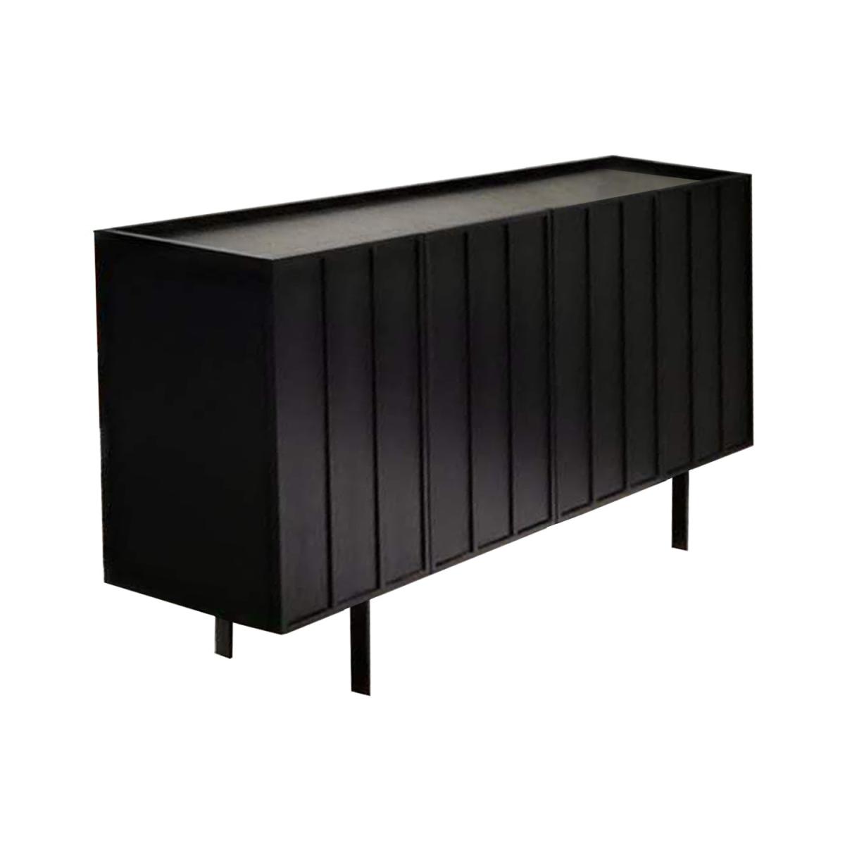 Statement piece with eye-catching blackened oak finish Generous storage space for your dining room essentials Modern, on-trend design with stylish linear detailing Large surface area for displaying any decorative items Black metal legs complement the inlaid cupboard doors Matching items available in the Helmer range Need to know Weight: 56kg Colour: Black Finish: Blackened oak veneer Material: Black painted oak veneer backed with MDF, plywood drawers, with black powder-coated metal legs and premium German hardware Assembly required: Yes - attaching the legs