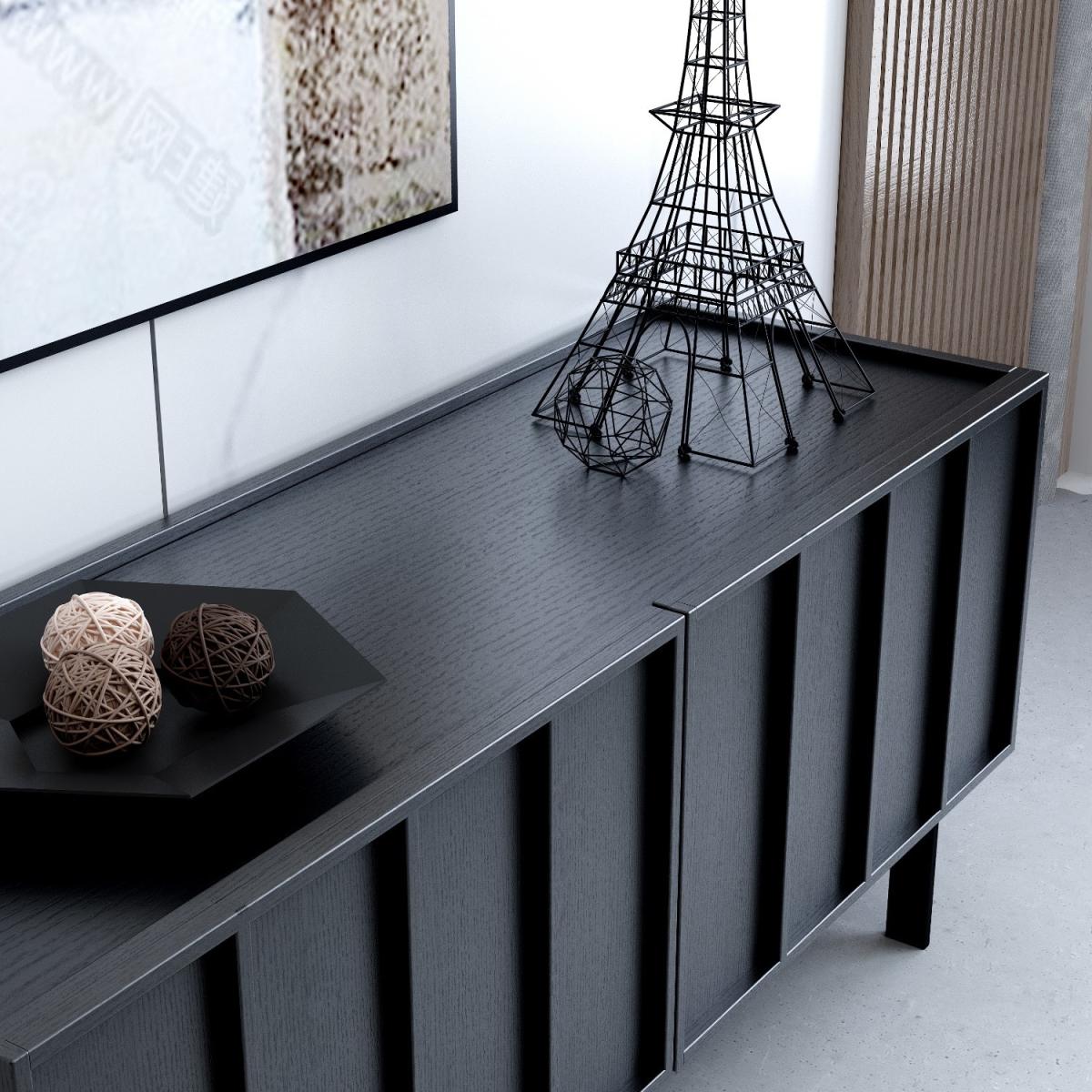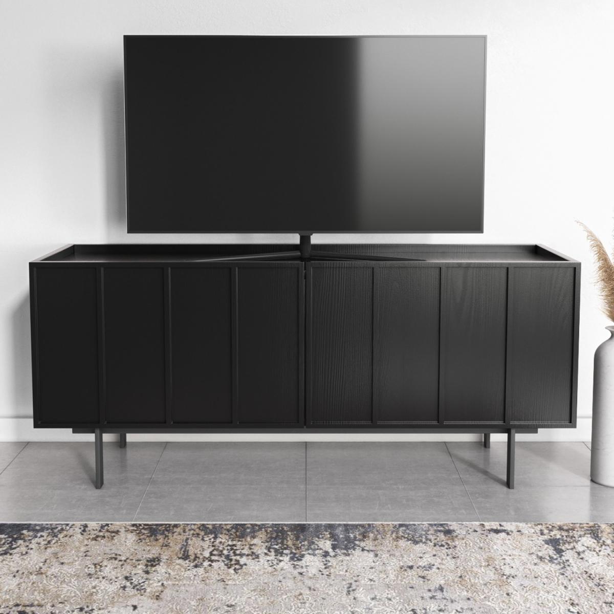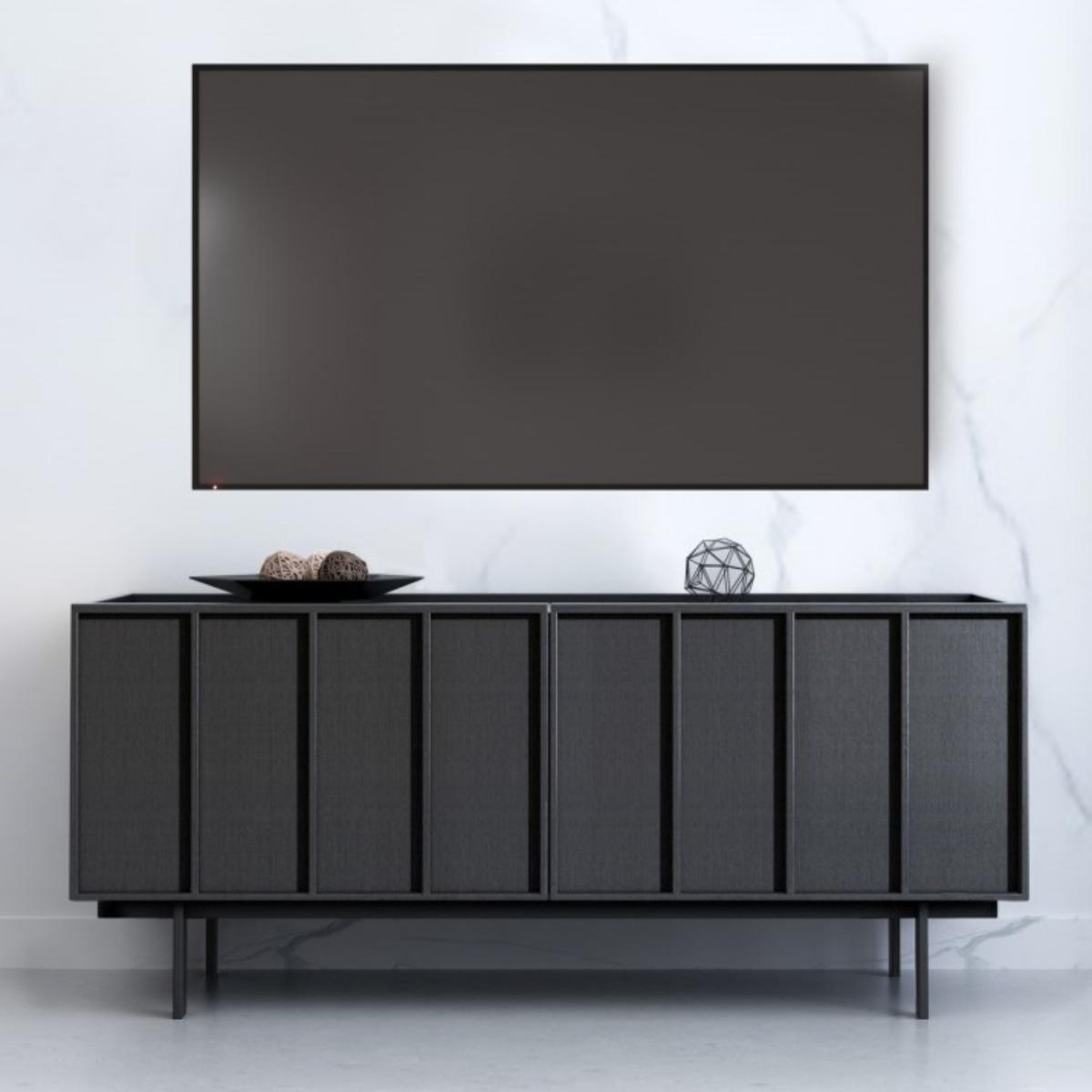 Features we love Modern panelled detailing and; blackened oak finish. Wide top surface is suitable for TV’s up to 50”Striking TV unit with 2 wide doors and; internal shelving. With central cable hole for clean cable management. Matching items available in the Helmer range All about me. Create a stylish focal point with this gorgeous Helmer TV unit. With central cable holes big enough to fit a UK plug it makes a stylish yet functional space to store all your media devices neatly. Finished in a black oak veneer that showcase a natural wood grain and the black powder-coated solid metal legs give this piece a final display of elegance. Need to know. Assembled dimensions. W120 x D38 x H52cm Base to height (legs). 15cm Packaging dimensions. H48 x W111 x D56.5cm Product weight. 29kg Max supported weight. 150kg Number of drawers. 1 Colours. Black Finish. Blackened oak veneer Material. Black painted oak veneer backed with MDF plywood drawers with black powder-coated metal legs and premium German hardware Assembly required. Yes - attaching the legs..