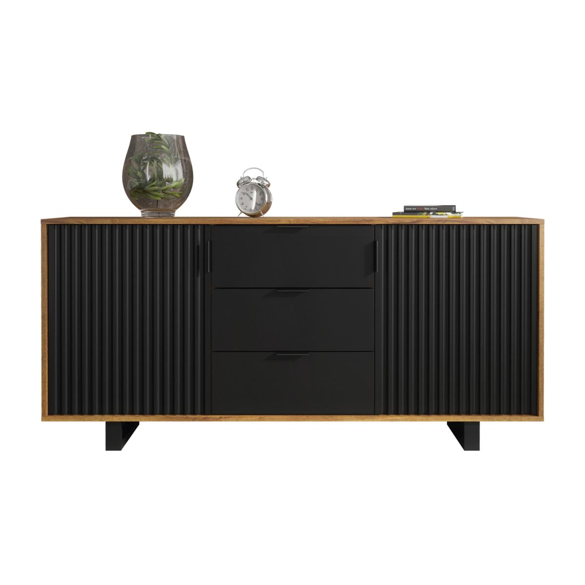 The Blackridge Sideboard seamlessly blends contemporary style with practical functionality, making it a versatile addition to any modern home. This elegant sideboard is crafted from high-quality 16mm chipboard and MDF, ensuring durability and a refined finish. Featuring two fluted black doors with a sophisticated textured design, it opens to reveal spacious shelving, ideal for organising larger items or everyday essentials. At the centre, three drawers provide additional storage for smaller items, helping you maintain a neat and clutter-free space. The rich, Black Oak finish creates a striking contrast that enhances its modern appeal, while the integrated wooden legs offer stability and a seamless, contemporary look. With its thoughtful design and ample storage capacity, the Blackridge Sideboard seamlessly combines style and practicality, making it a standout feature in any room.