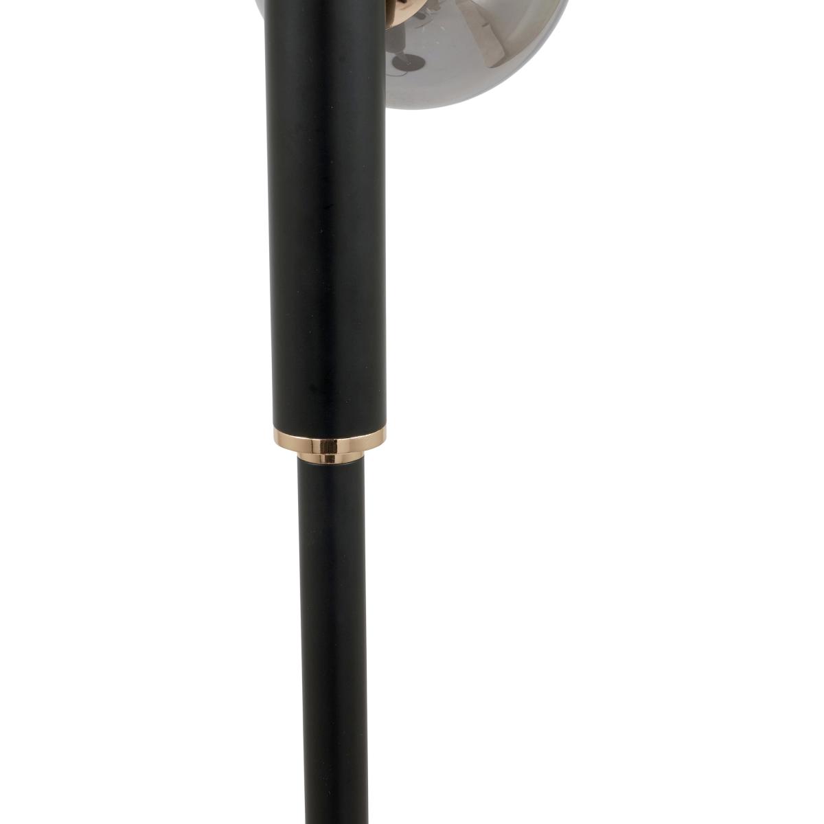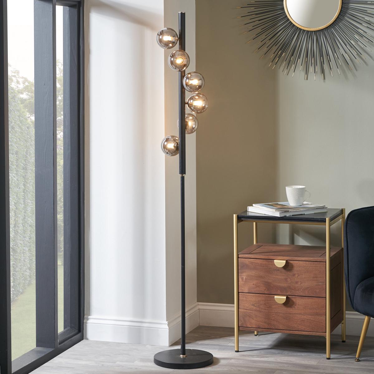 * Requires 6 x G9 Bulbs (Not included)* Sophisticated floor lamp with 6 smoke glass balls. * Black post with brass-colored detailing for chic, futuristic look.* Creates a stunning statement; pairs well with matching table lamp and pendant. The Blair Smoke Glass Ball and Black Metal Floor Lamp exudes sophistication with its chic, futuristic design featuring six smoke glass balls and brass-coloured detailing. Make a statement in any room by pairing it with a matching table lamp and pendant for a cohesive look.