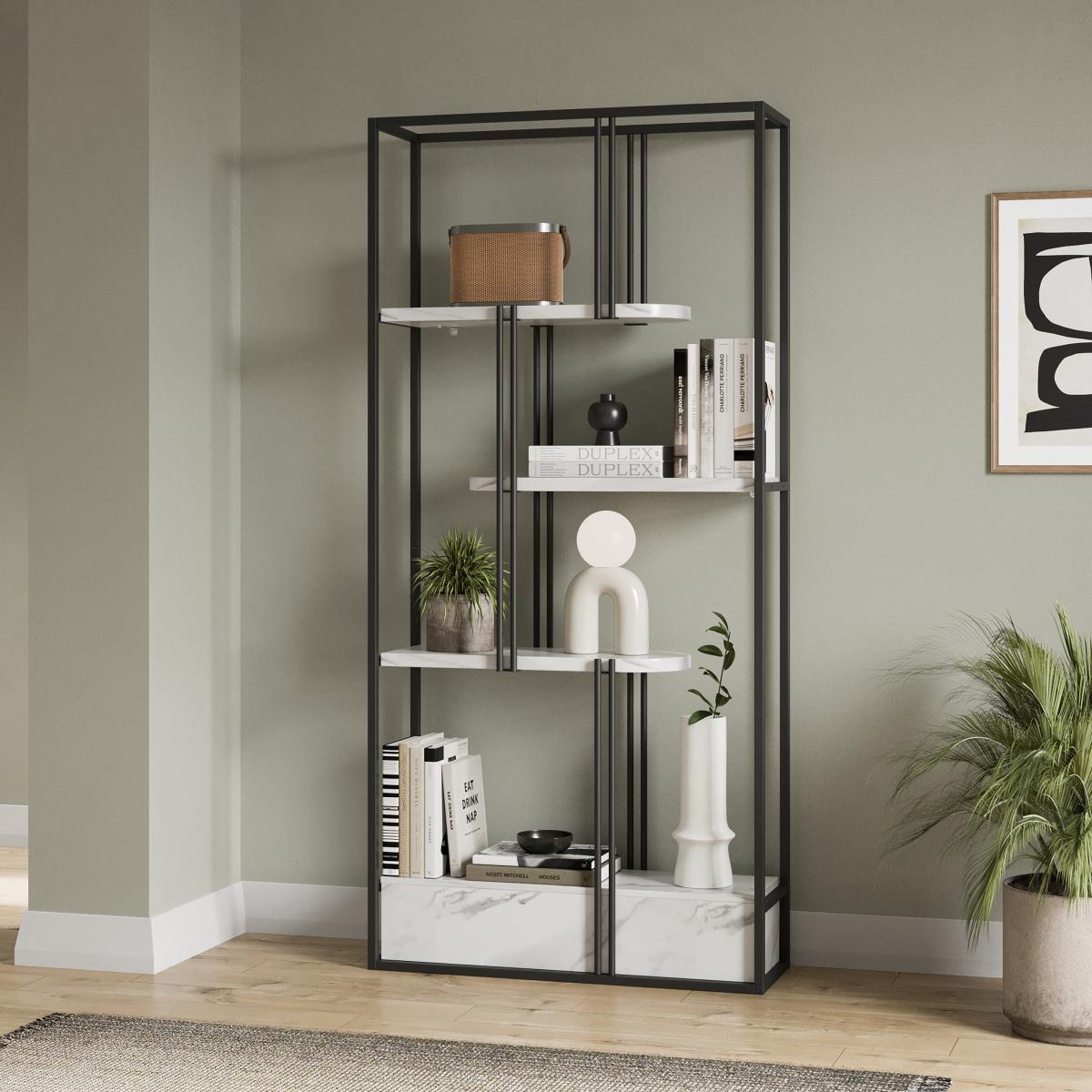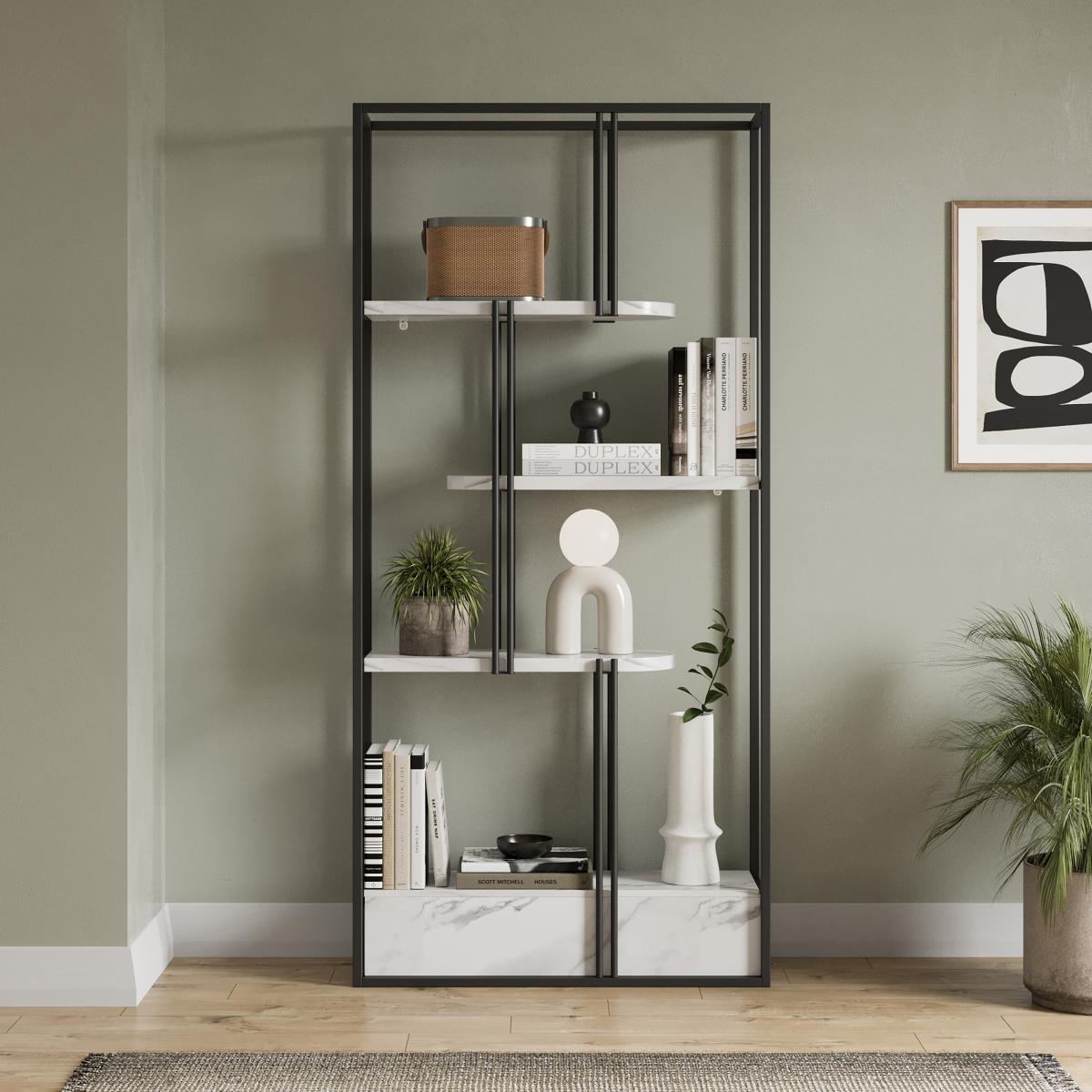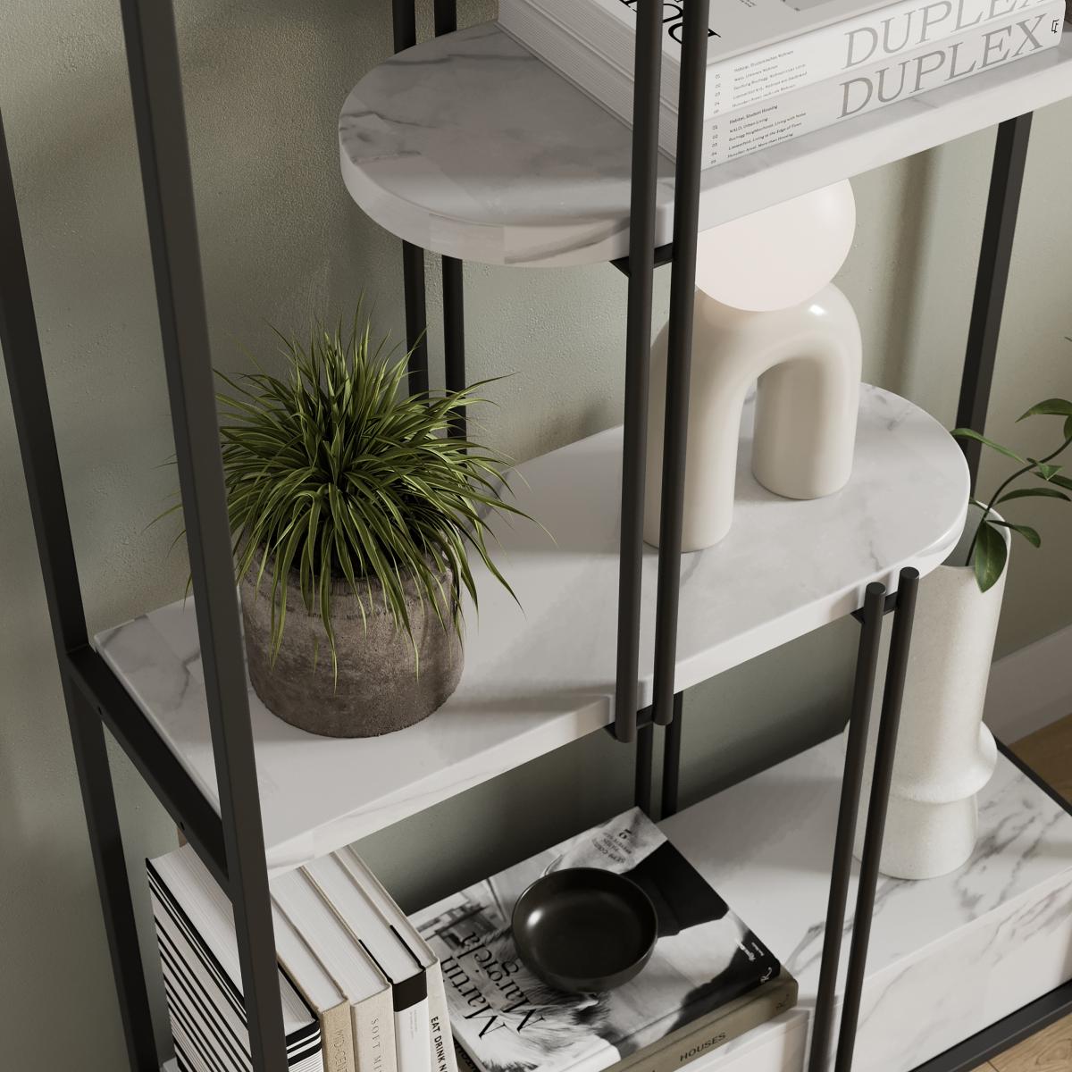 I’m a fan of this tall marble-top shelving unit for its clean lines and mix of materials - the slim black frame keeps it feeling light, while the faux-marble shelves add a touch of refinement. It sits equally well in a modern Scandi living room, a pared-back home office or even a cosy industrial hallway. When styling, aim for balance and breathing space: stack a few art or coffee-table books horizontally, place a small cluster of ceramic vases or sculptural objects on the next shelf, then introduce a trailing plant to soften the look. Keep to a restrained palette - whites, greys and soft neutrals - and vary heights to avoid a flat display.