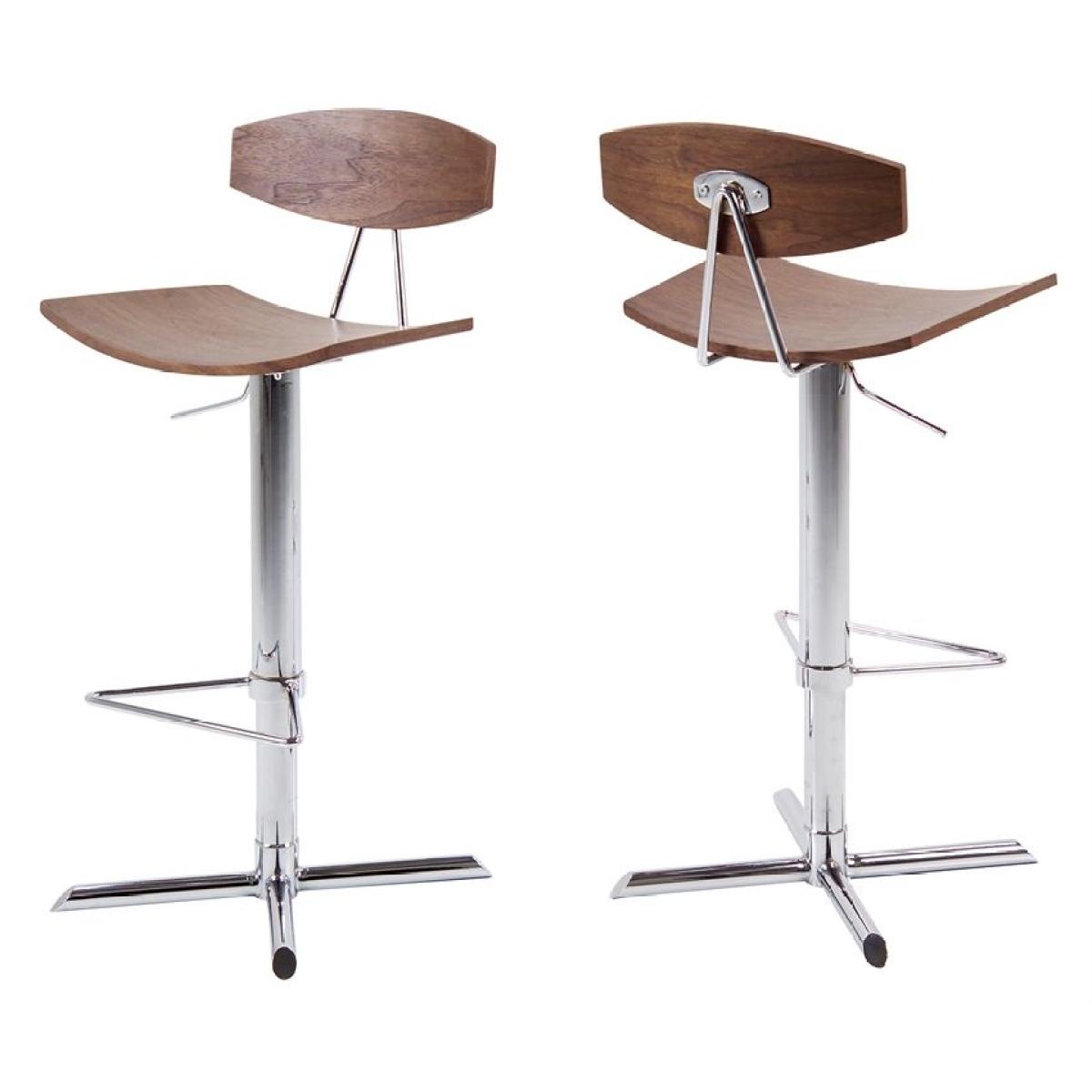 Modern barstool with adjustable seat height. Combine with similar bar table, or use for breakfast bar stool in the kitchen.  Walnut Veneer seat and back. Chrome cross base and footrest Gas lift Self assembly Dimensions: 43cm (W) x 42cm (D) 103cm (H)