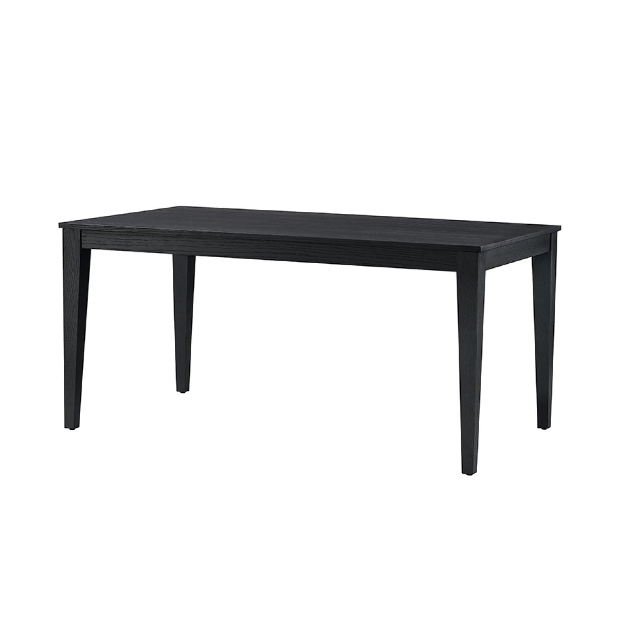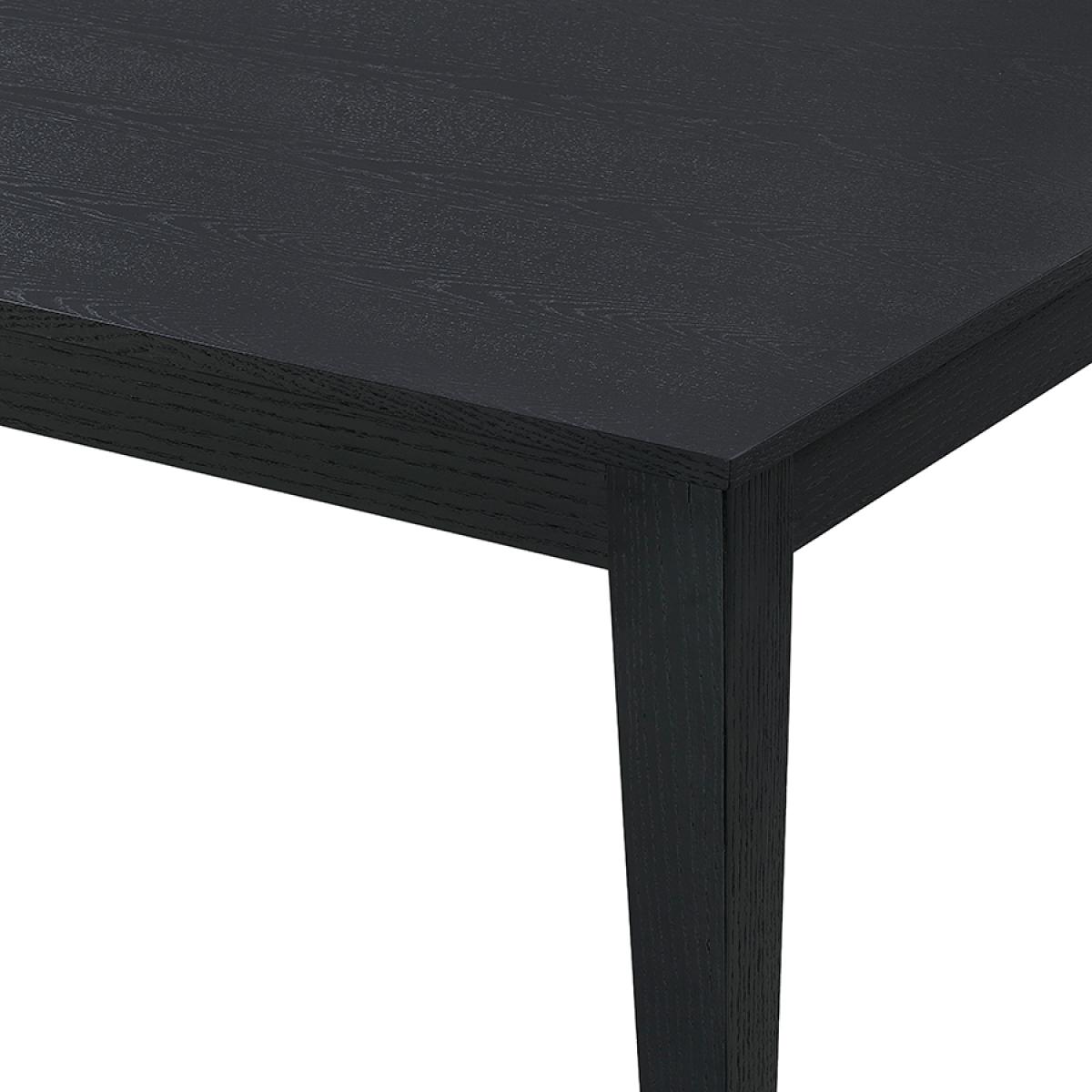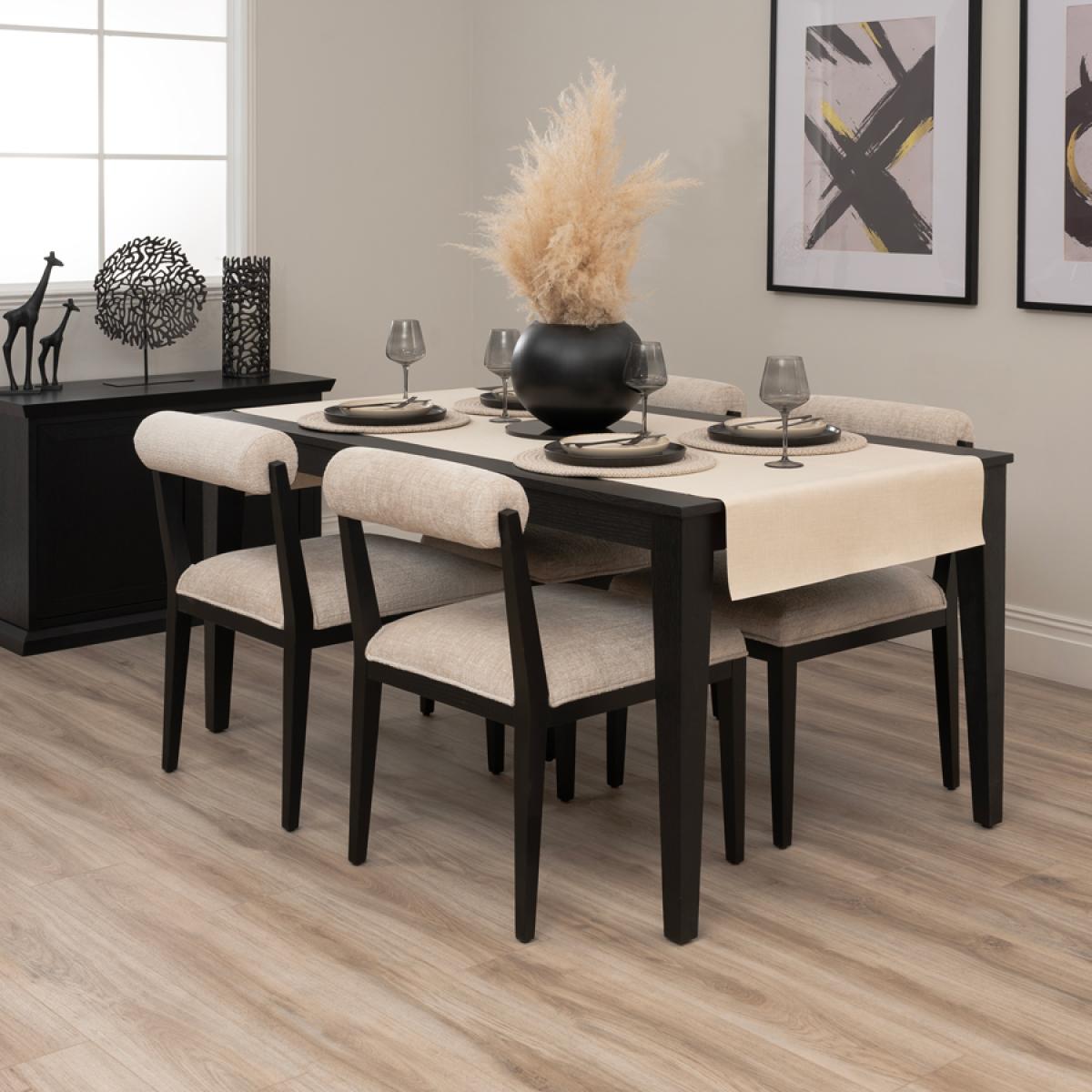 Timeless, chic dining table. Solid ash legs. Ash veneered top. Satin black finish. Will seat up to six people. Comfortable sprung chairs with black stained ash legs and chenille upholstery fabric. Simple assembly of table required.