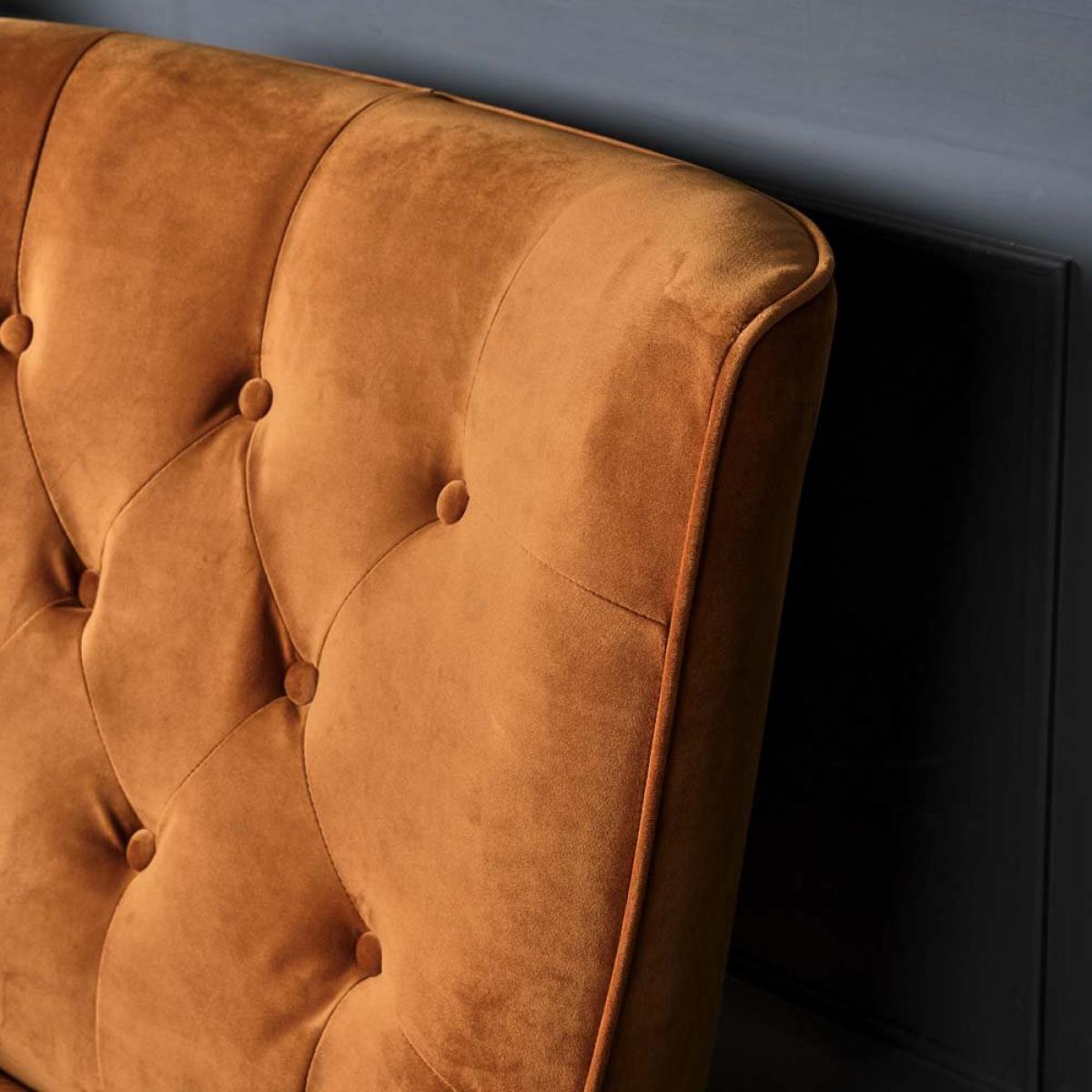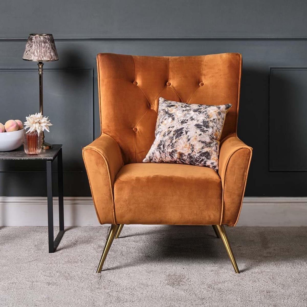 Combining a traditional armchair with a modern velvet twist… the Blake is the ideal contemporary occasional chair for any office or living room. The high buttoned back and wide arms add to the comfort and sophisticated style of this chair, while the brass tapered legs give the chair a sophisticated edge. The soft velvet is available in four colours… Blue, Green, Mustard and Grey.