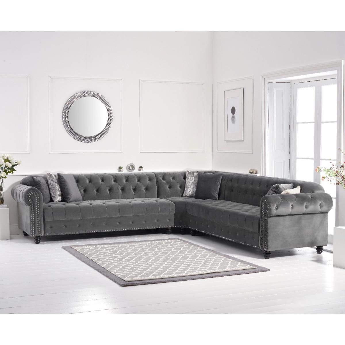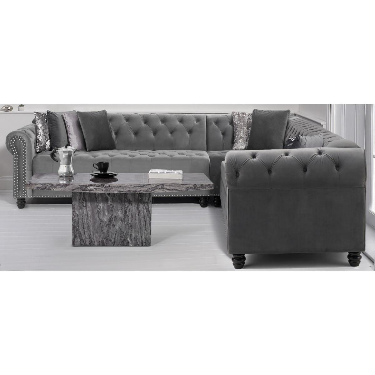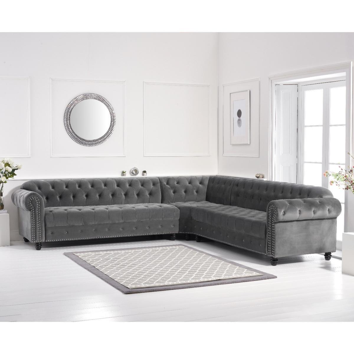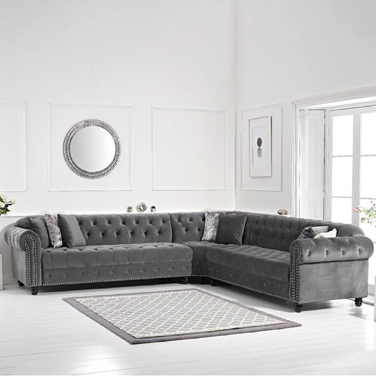 By pairing contemporary and time-honoured design elements the Blake sofa fits perfectly in modern or classically styled homes. Upholstered in a smooth velvet and boasting deep foam cushioning for the ultimate comfort and featuring a contemporary deep buttoned Chesterfield-inspired design - this sofa is sure to turn heads. Functional and stylish. Upholstered in striking grey velvet Corner sofa. Generously sized