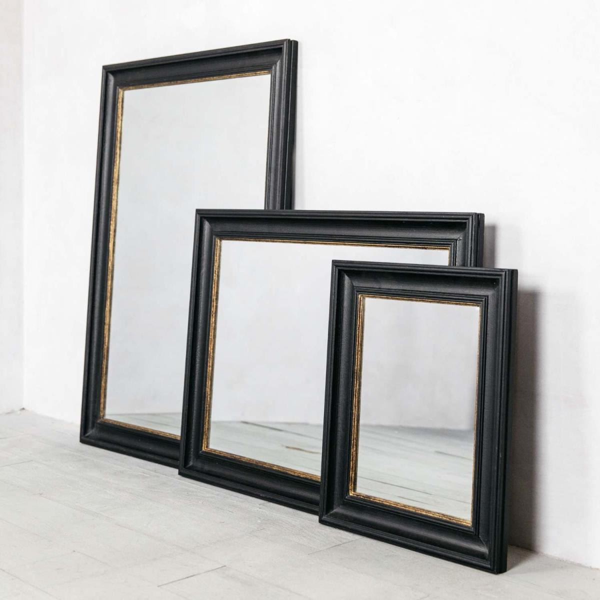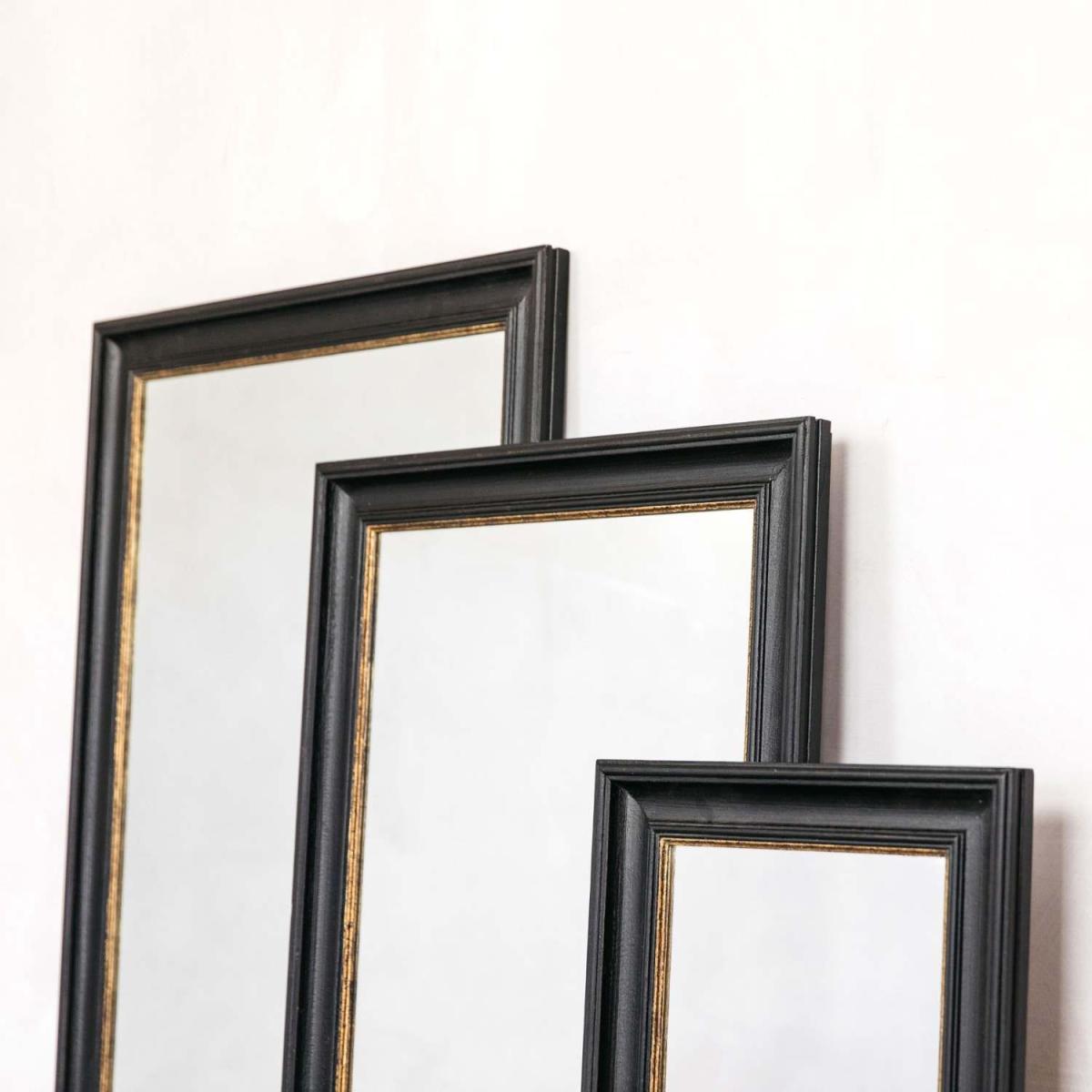 A collection of subtly distressed rectangular mirrors crafted from paulownia wood and finished in black with antiqued gold detailing on the inner frames. Available in three sizes, these mirrors will suit any interior space. Small (QCU1004): H54 x W44 x D3. 5cm. Medium (QCU1005): H84 x W64 x D3. 5cm. Large (QCU1006): H104 x W74 x D4cm. Small mirror: H40 x W30cm. Medium mirror: H69 x W49cm. Large mirror: H88 x W59cm. Made of paulownia wood and glass. Can be hung both portrait or landscape. Sold individually.