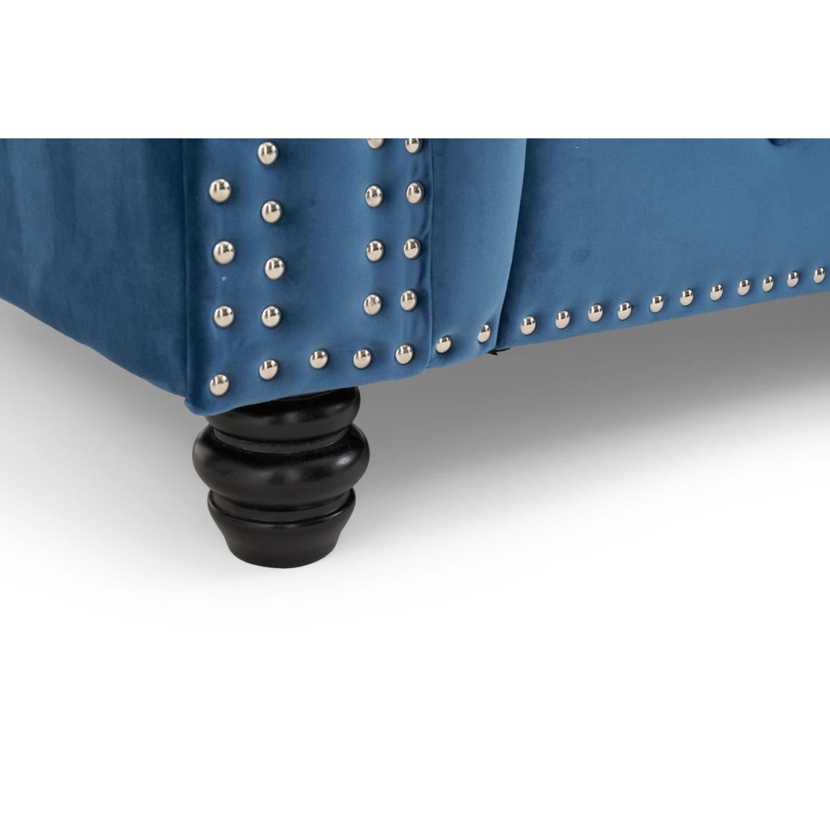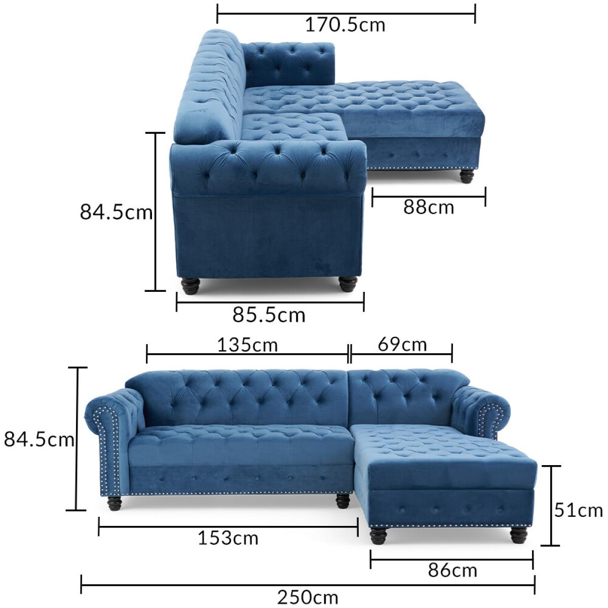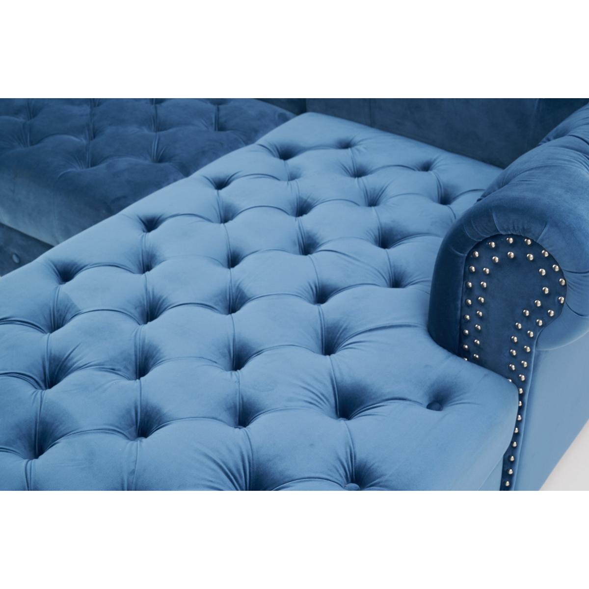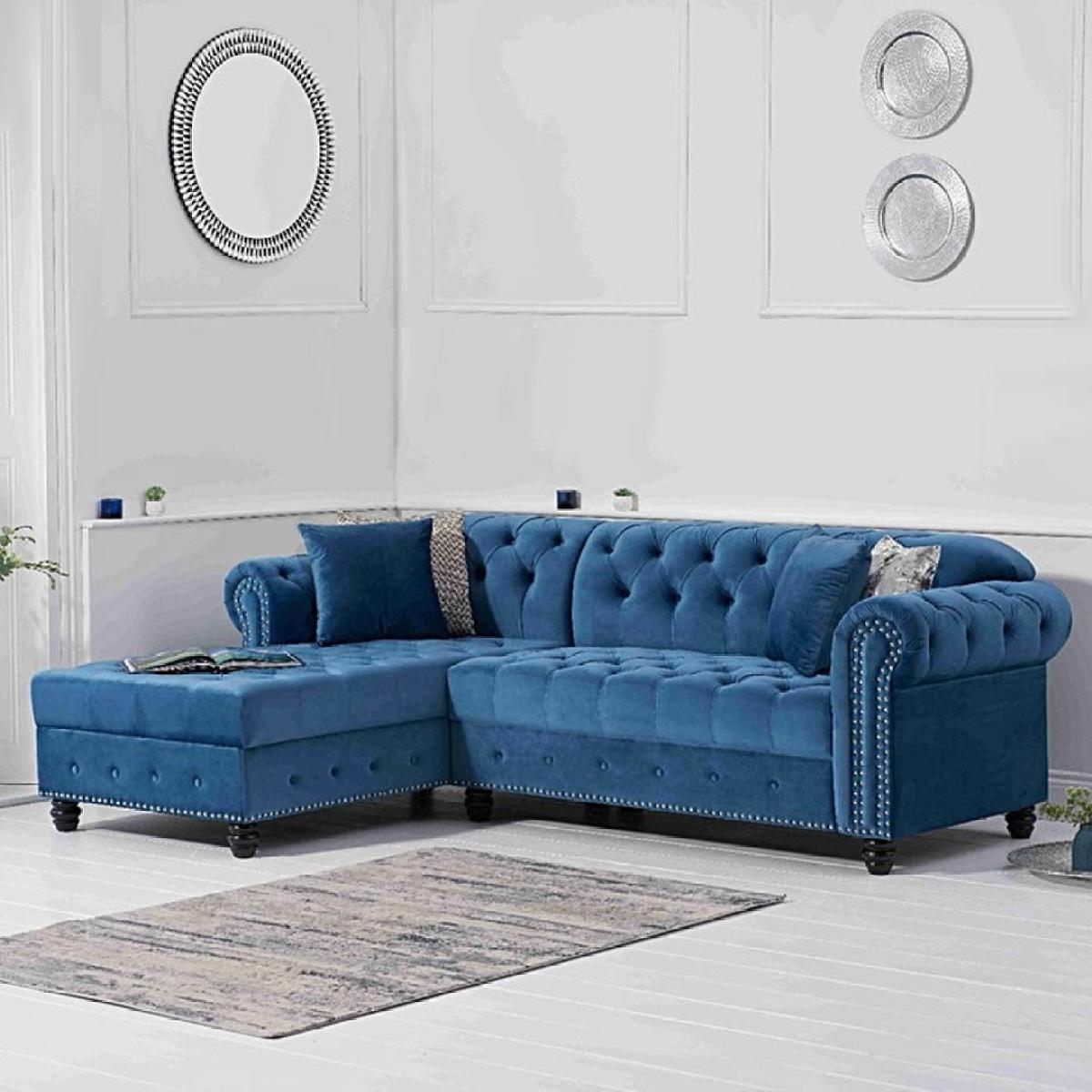 The Blake is a beautiful Chesterfield-inspired left facing chaise sofa with traditional details alongside modern touches. Scrolled statement arms are complete with contemporary metal stud details. A deep-buttoned backrest and plump, foam-filled cushions ensure a comfortable seat. Luxuriously padded for extra comfort. Chesterfield-inspired design. Immaculately upholstered in elegant blue velvetLeft facing chaise