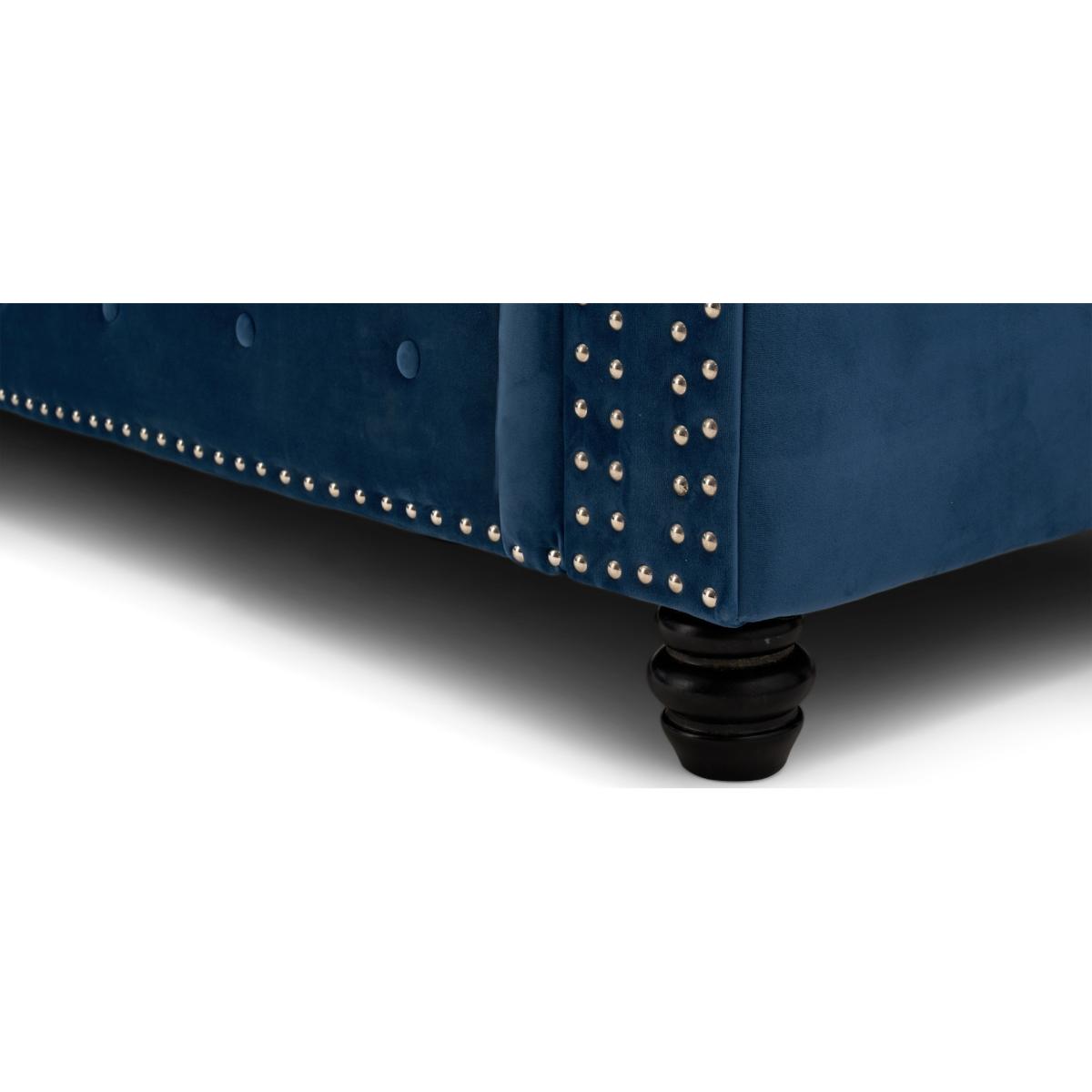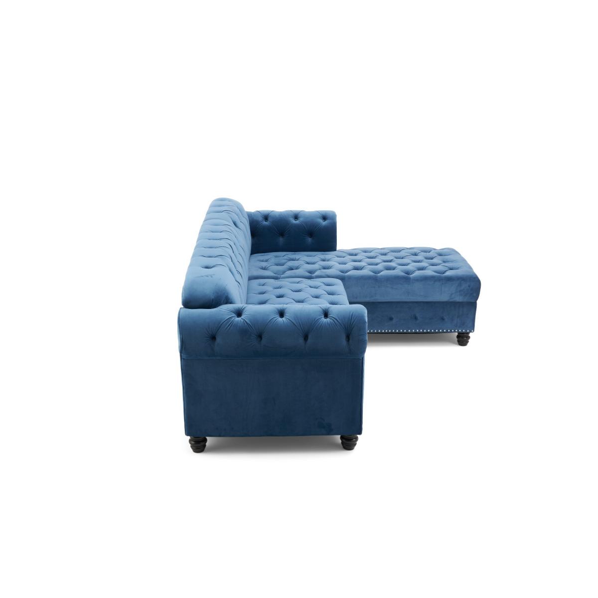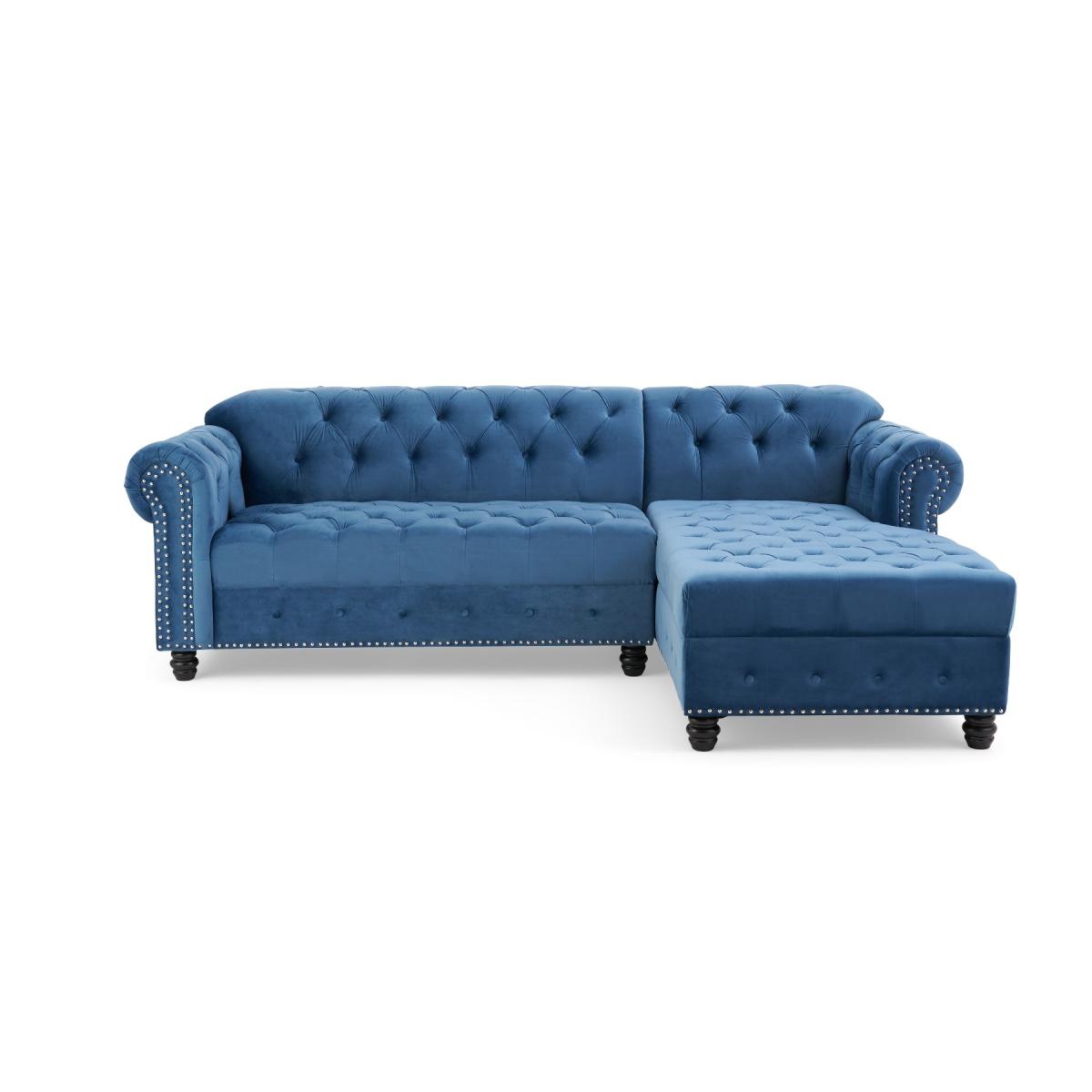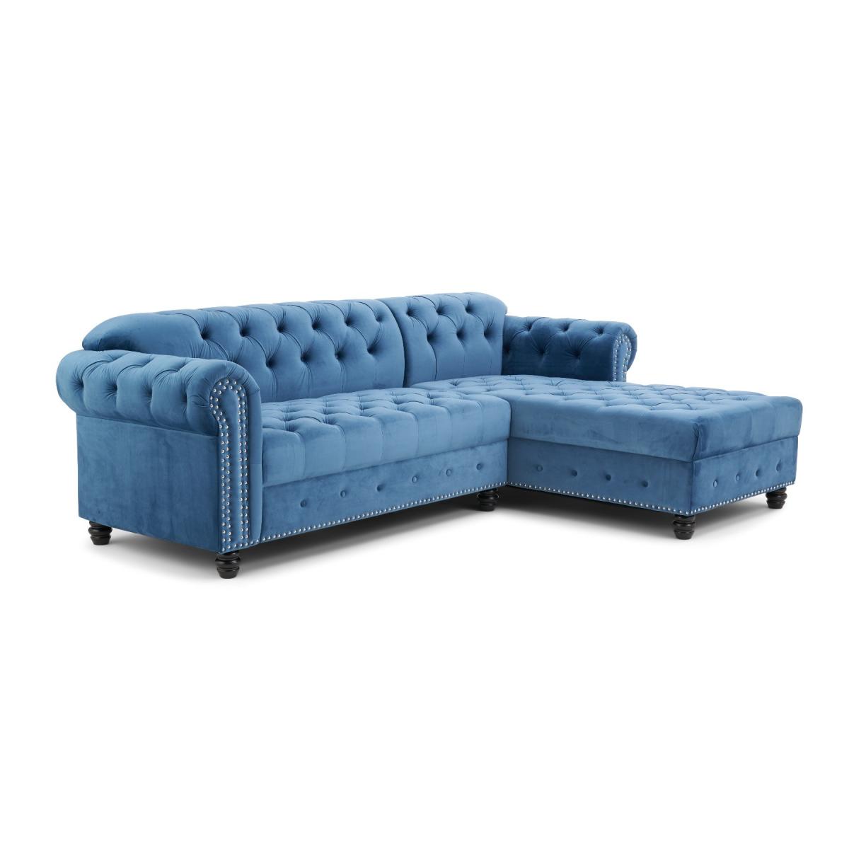 The Blake is a beautiful Chesterfield-inspired left facing chaise sofa with traditional details alongside modern touches. Scrolled statement arms are complete with contemporary metal stud details. A deep-buttoned backrest and plump, foam-filled cushions ensure a comfortable seat. Luxuriously padded for extra comfort. Chesterfield-inspired design. Immaculately upholstered in elegant blue velvetLeft facing chaise