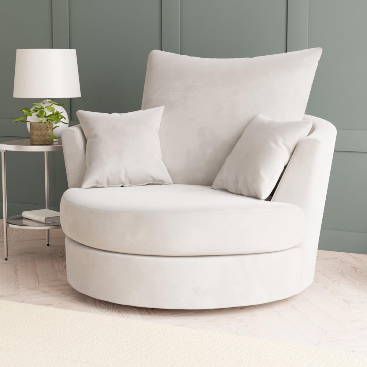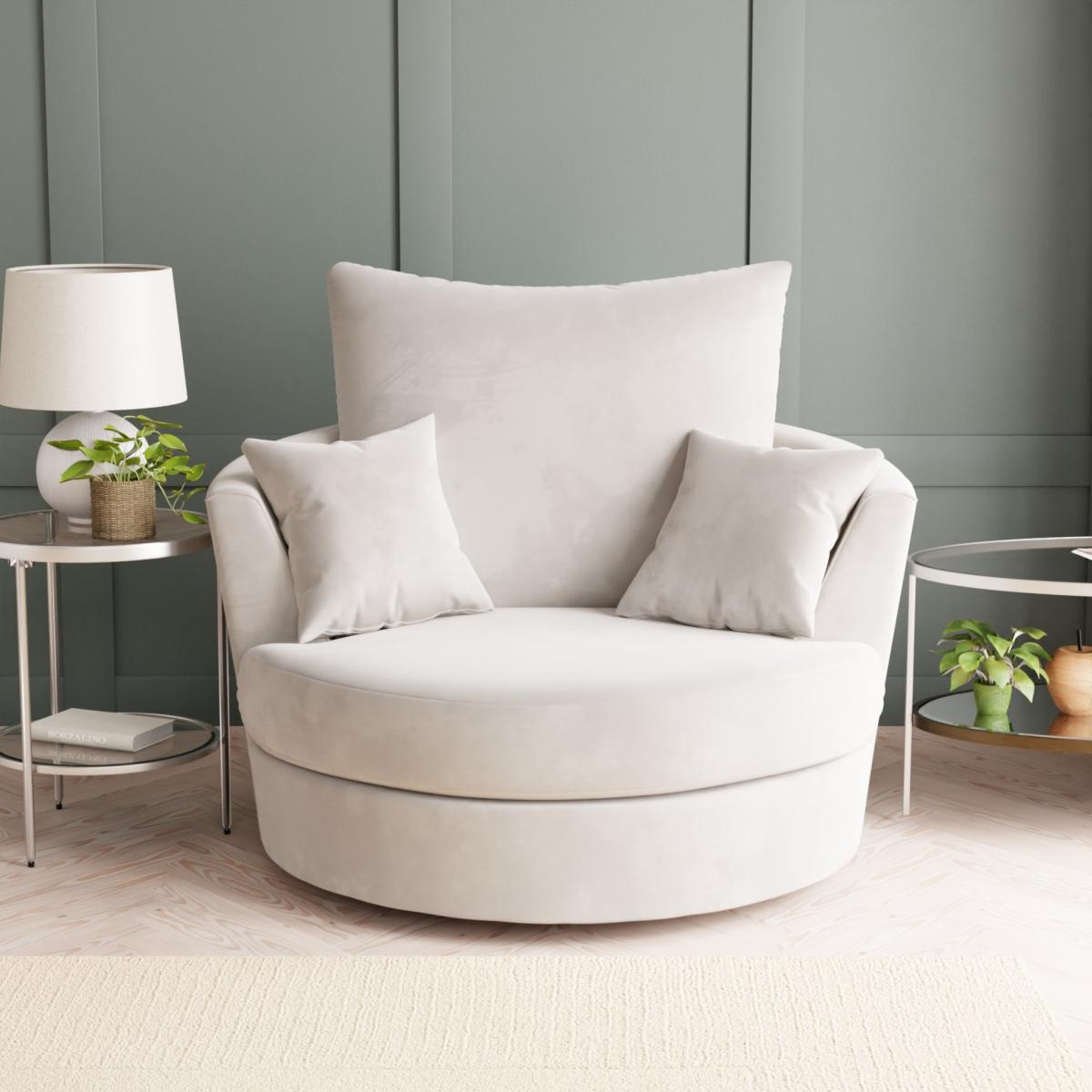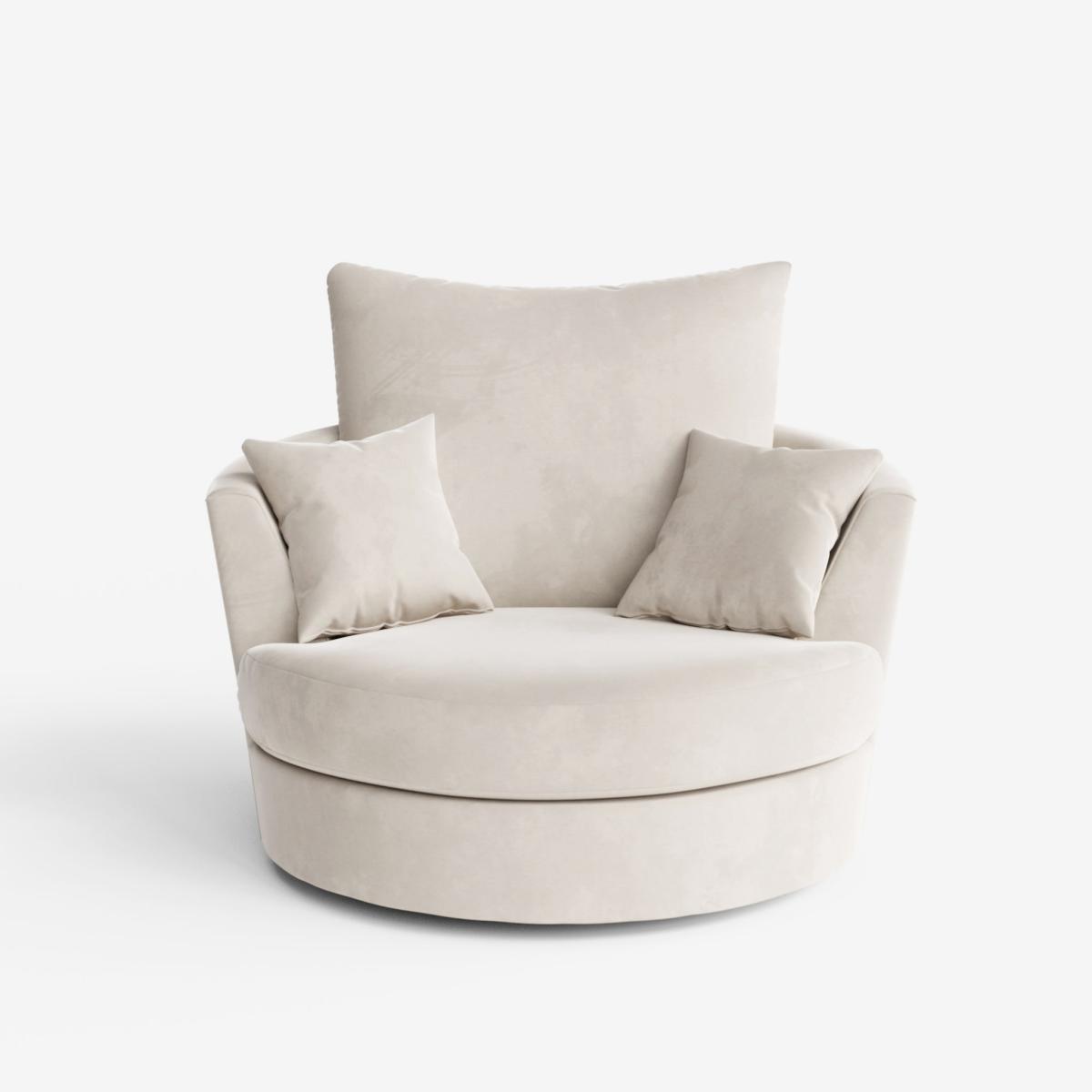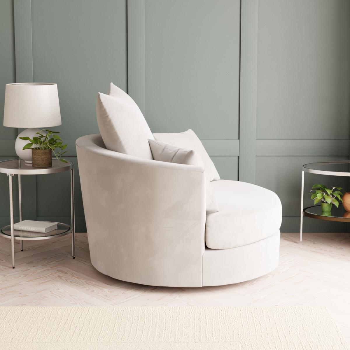 I’m a big fan of this champagne-coloured velvet swivel chair for its blend of comfort and modern style. The plush velvet finish adds a subtle sheen that works equally well in contemporary minimal schemes, art-deco inspired living rooms or cosy reading corners. The swivel base brings flexibility - ideal for rotating towards a fireplace, TV or simply to follow the conversation. For styling, position it as a standalone accent in a neutral palette or pair it with deep jewel-tones for a richer look. A contrasting throw or a geometric cushion will break up the solid blush tone, and a slim metallic side table keeps the overall feel light. Given its generous diameter, leave clear floor space around it to let the chair’s shape really shine.