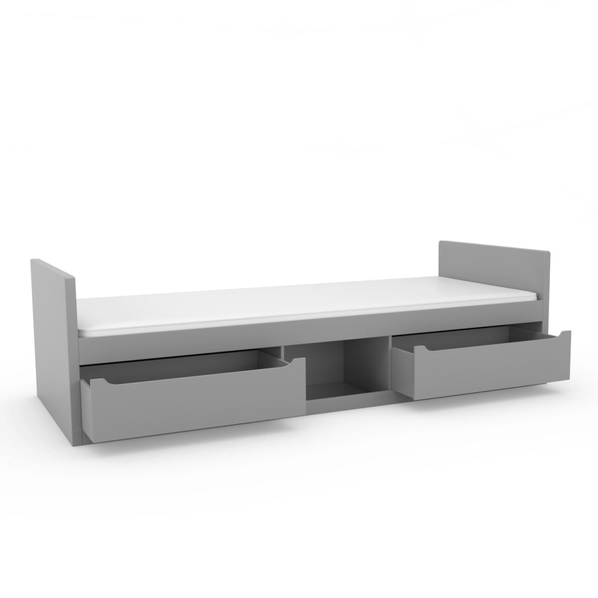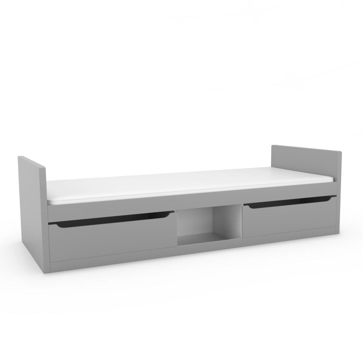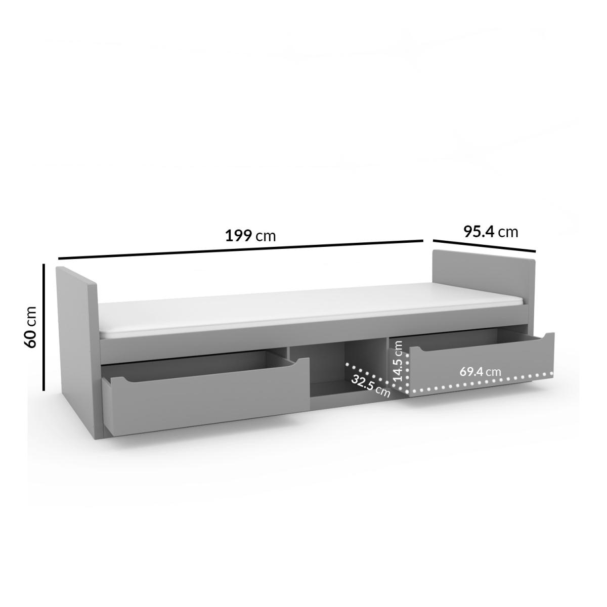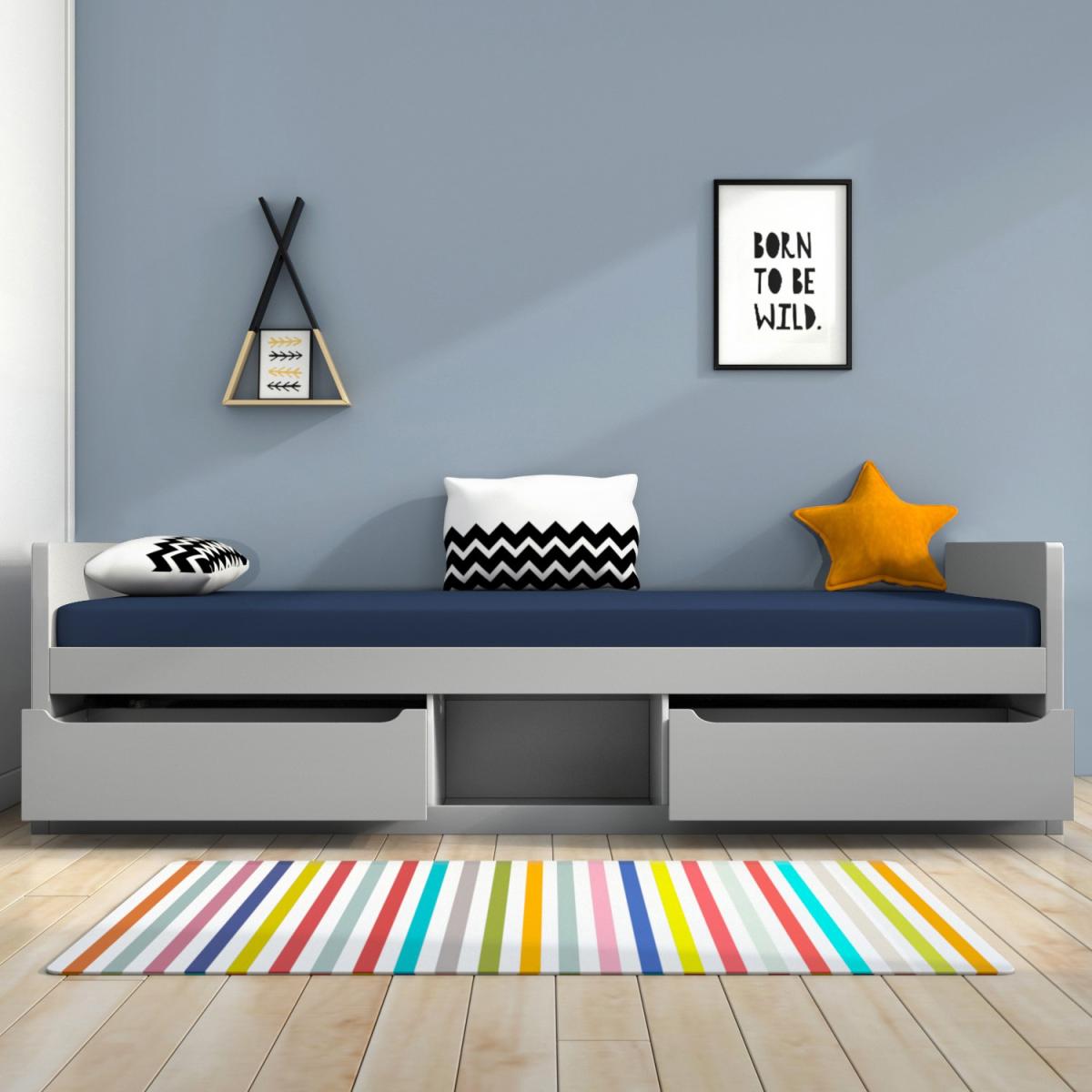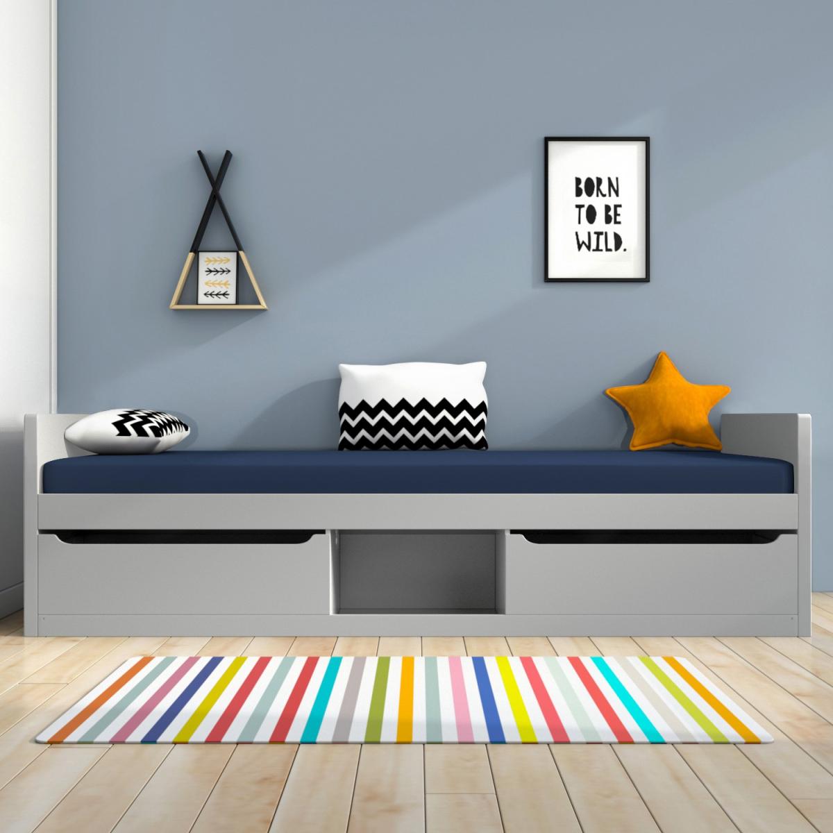 Unisex – light grey finish, it'll suit any bedroom decor style Minimal and compact design with child friendly curved corners Two pull-out drawers and central storage ideal for bedroom clutter, bed linen and more Also available in a crisp white finish Fits a standard UK single mattress (3ft) Need to know Packaging weights: Box 1: 35kg / Box 2: 29.9 kg Bed mattress size: Standard UK single (90 x 190cm / 3ft) Weight capacity: 120kg Product weight: 62.9kg Colour: Light grey Finish: Laminated Material: Wood combination frame For use: Indoors Bed base: Durable particle board Assembly required: Yes Mattress included: No