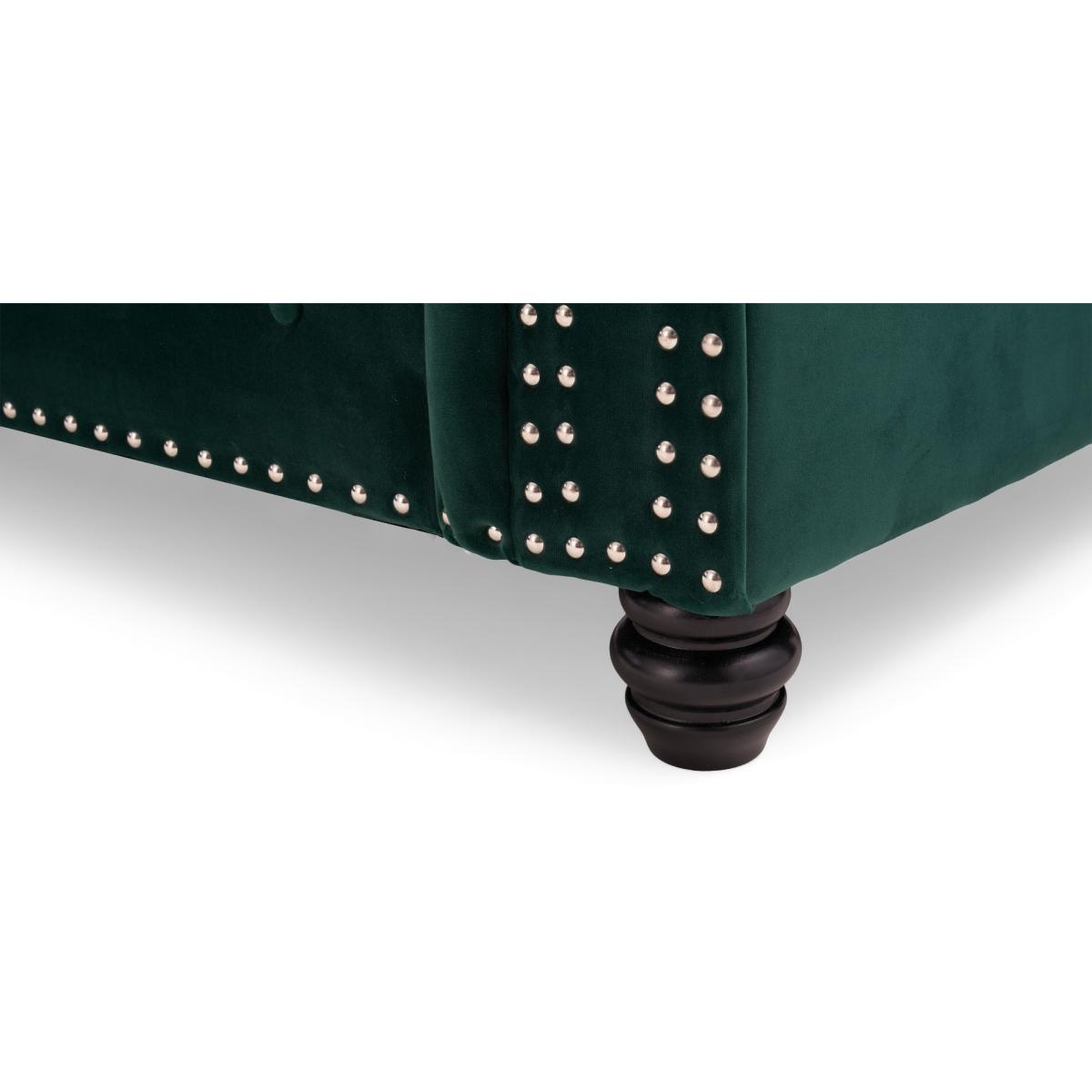 Both understated and supremely cool, the Blake right facing chaise sofa brings together old school glamour with modern practicality. Featuring a deeply-buttoned backrest, chrome stud detailing and beautiful low pale wood feet - this sofa is sure to turn heads. Modern chrome stud detailing. Chesterfield-inspired design. Expertly upholstered in luxurious green velvet. Right facing chaise