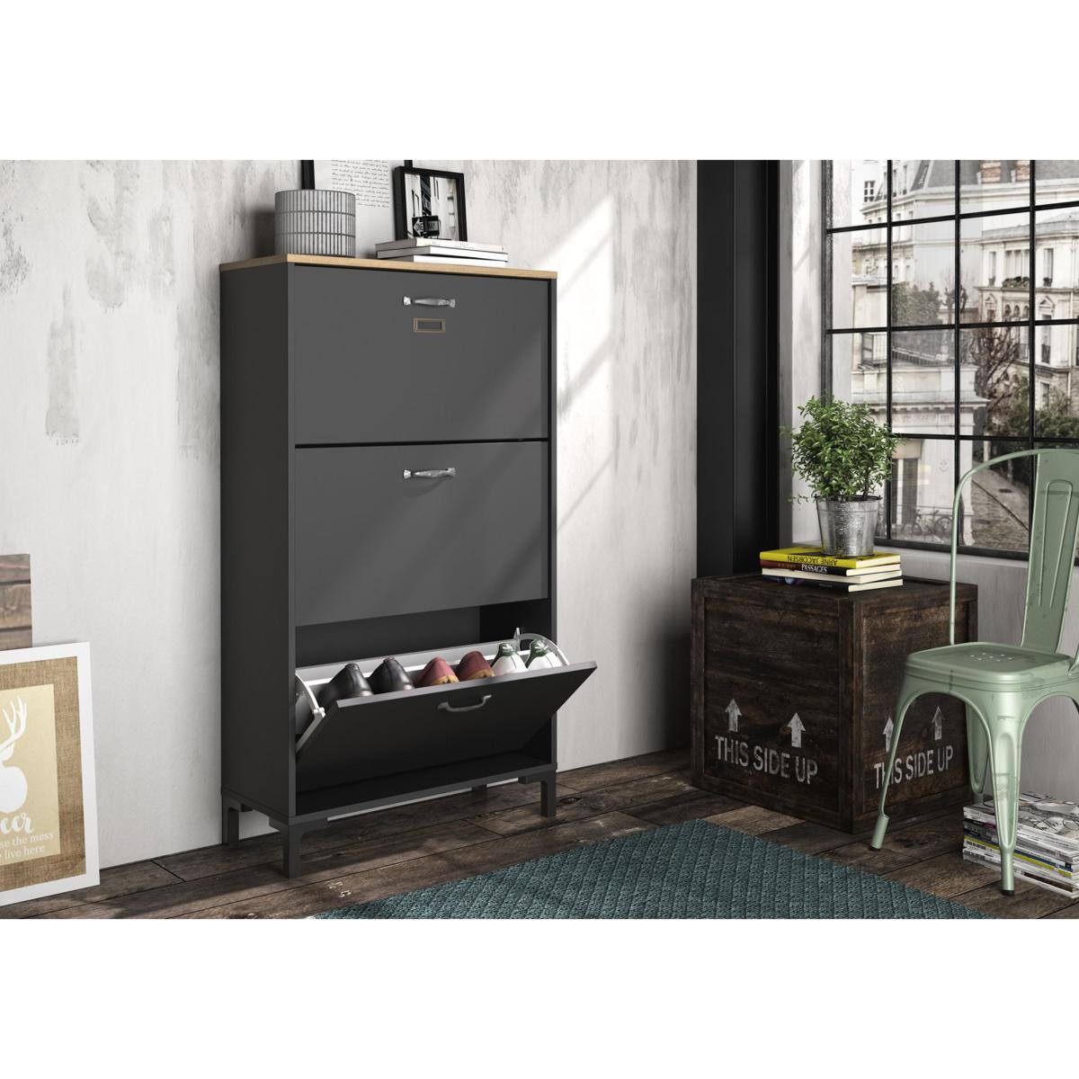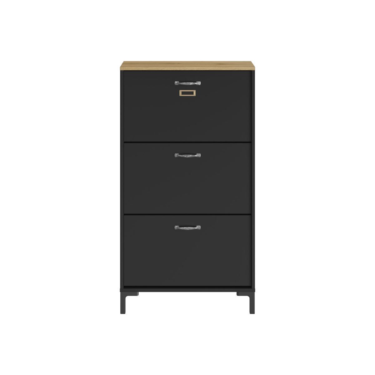 With a black finish body and oak finish top, the Blake shoe storage unit is as stylish as it is practical. It stores up to 12 pairs of shoes with ease. *This is a self-assembly item*. What you’ll love. Stylish finish in black and oak effect. Vintage metal handles and label holder add an Industrial feel. Compact and space-saving. Three drop-down shoe racks each offer two levels of storage. Holds up to 12 pairs of shoes. Great value for money. What you need to know. Hinged drop-down fronts. Three internal two level shoe racks. Heavy duty construction. Strong and very durable foil finish. This product will be delivered flat-packed, with assembly instructions.