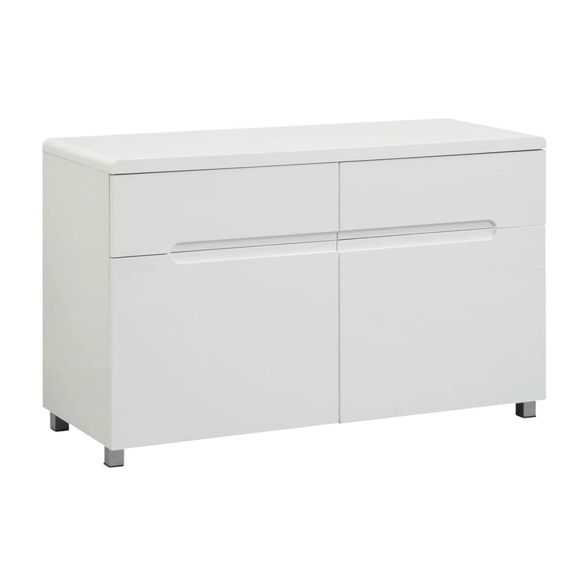 The perfect storage solution for all your treasured items, this wonderful Blanco Gloss SIdeboard features a minimalistic yet stylish design with an attractive high gloss finish and smart pearl silver feet. The sturdy frame features two spacious drawers and cupboards with modern grooved cut-out handles for easy access and metal runners for a smooth opening, whilst its flat top surface is great for displaying photo frames, floral bouquets or your favourite ornaments. Ideal for the bedroom, dining room or living room, the stylish yet practical sideboard allows you to organise and store all your goods, from clothes and tableware to crafts and tea sets. In addition, the elegant white shade will complement a whole array of existing home decors whilst adding a touch of charm to your living area.